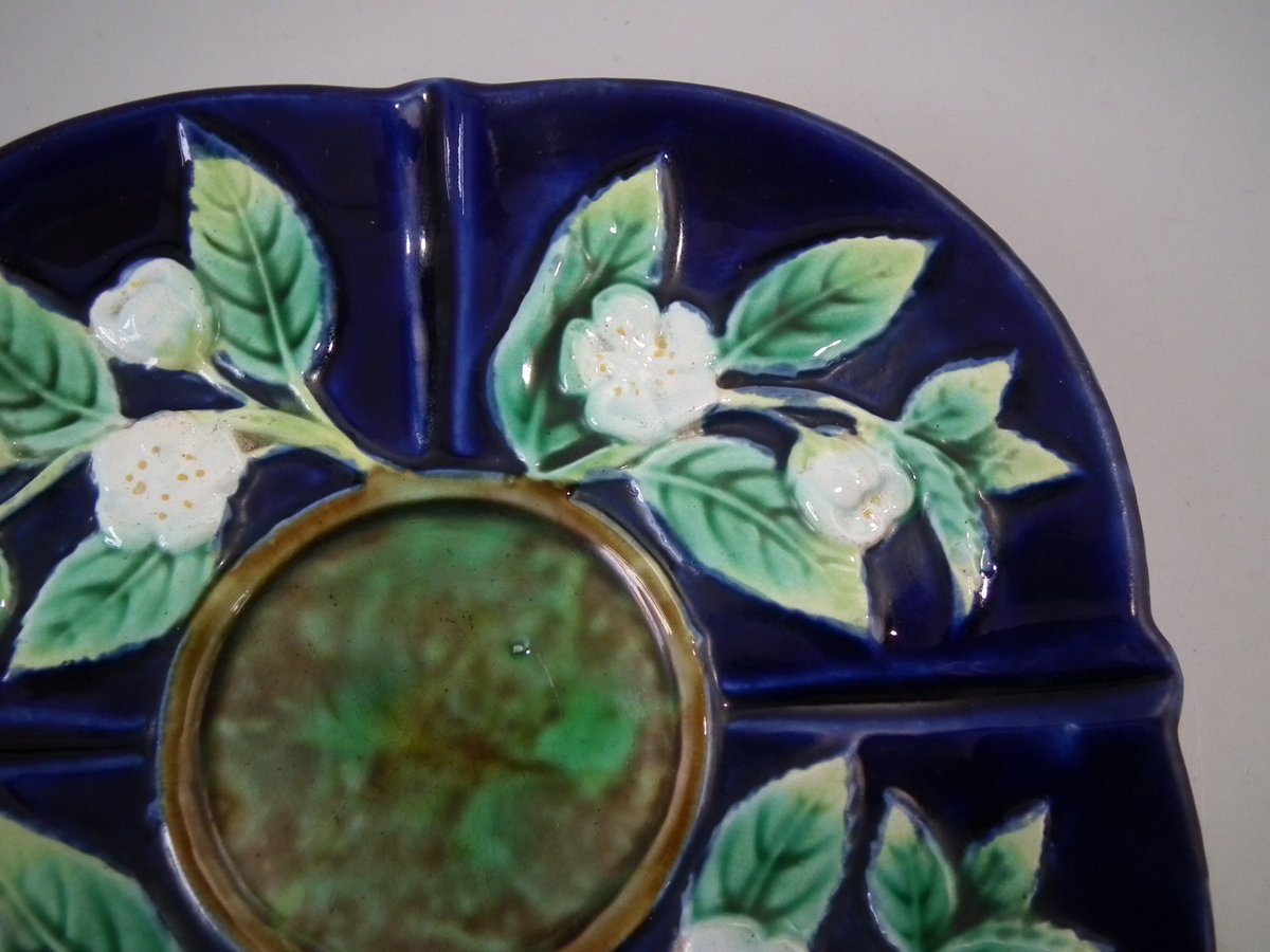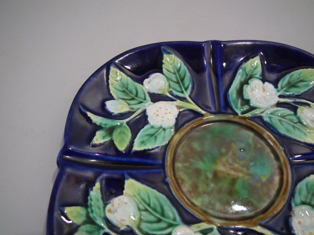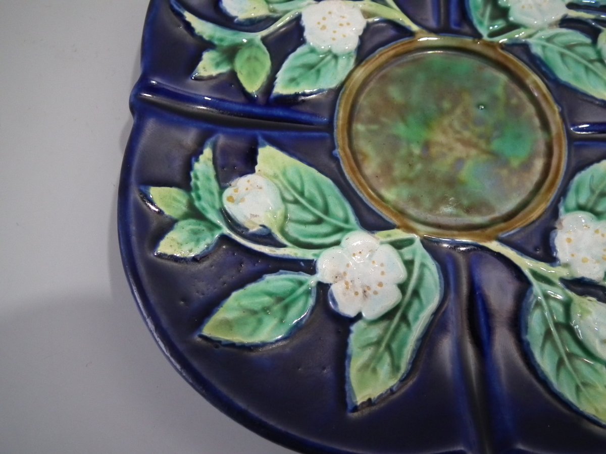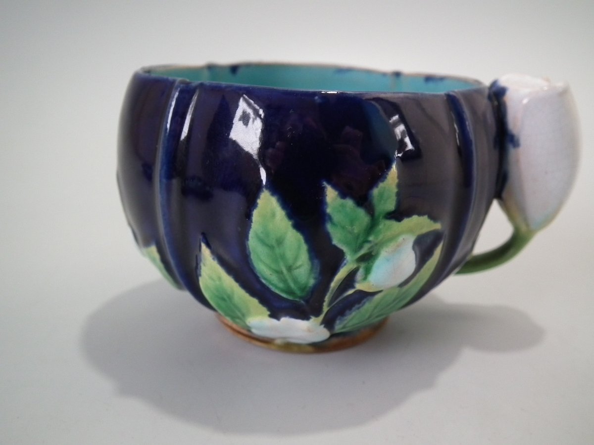 Victorian, circa 1873. 2.8ins high, 5.3ins wide, 5.3ins depth. George Jones Majolica cup & saucer which features white blossom (this cup forms part of the Monkey tea set).