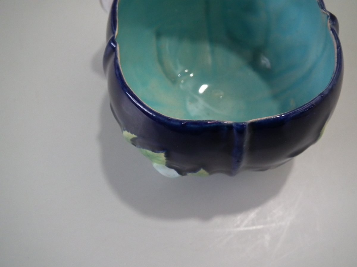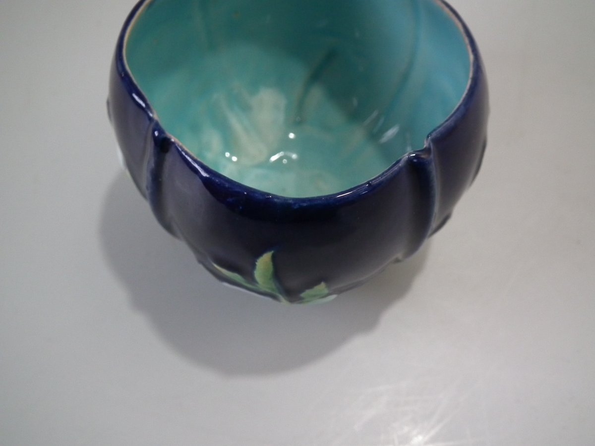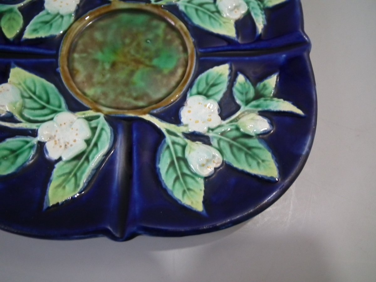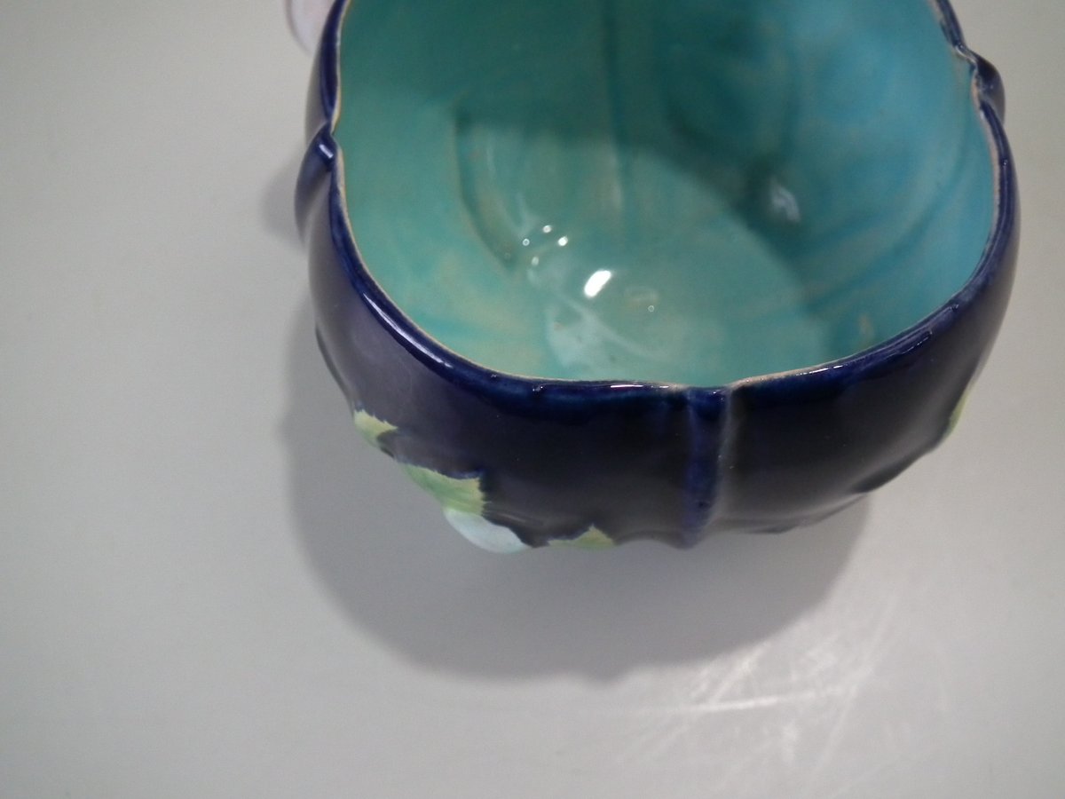 Victorian, circa 1873. 2.8ins high, 5.3ins wide, 5.3ins depth. George Jones Majolica cup & saucer which features white blossom (this cup forms part of the Monkey tea set).