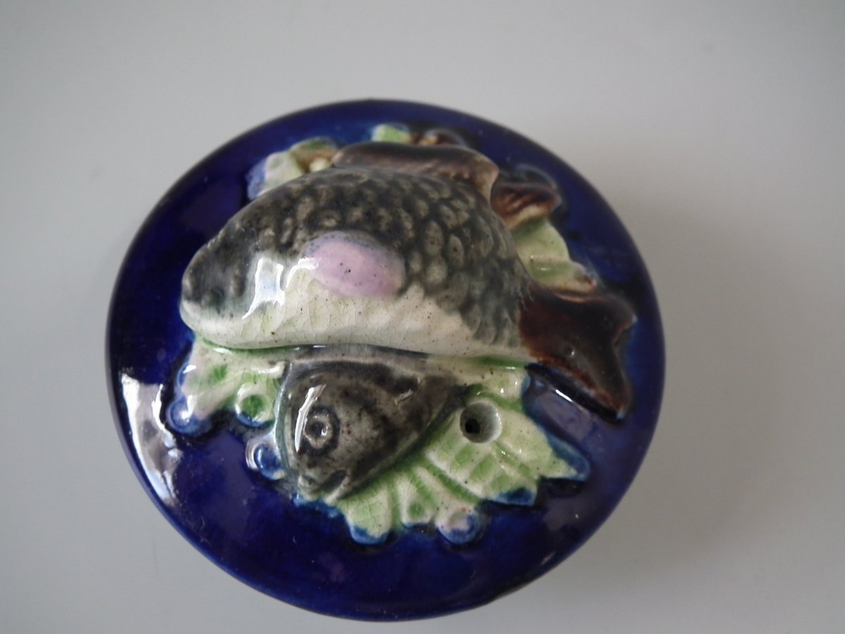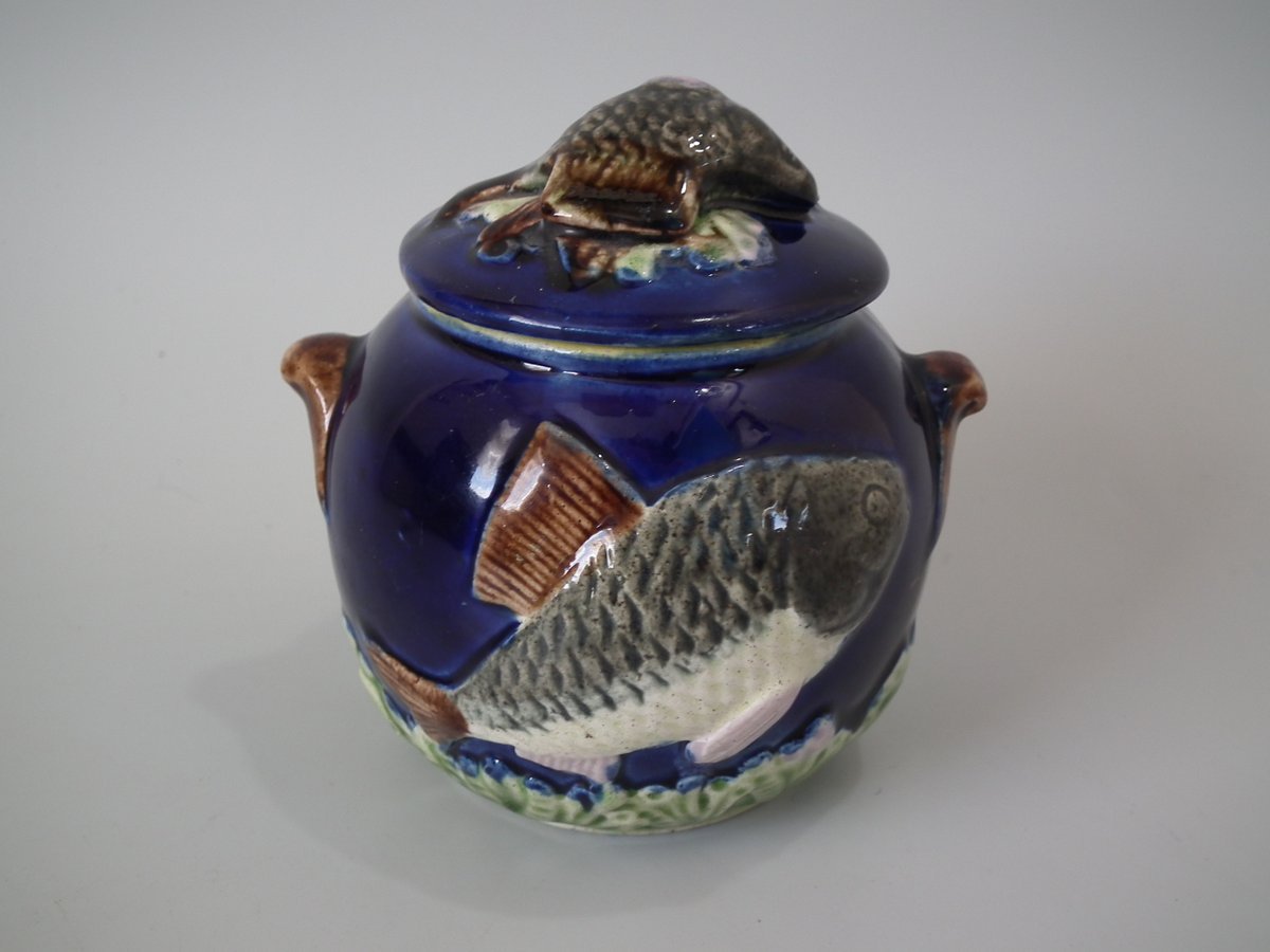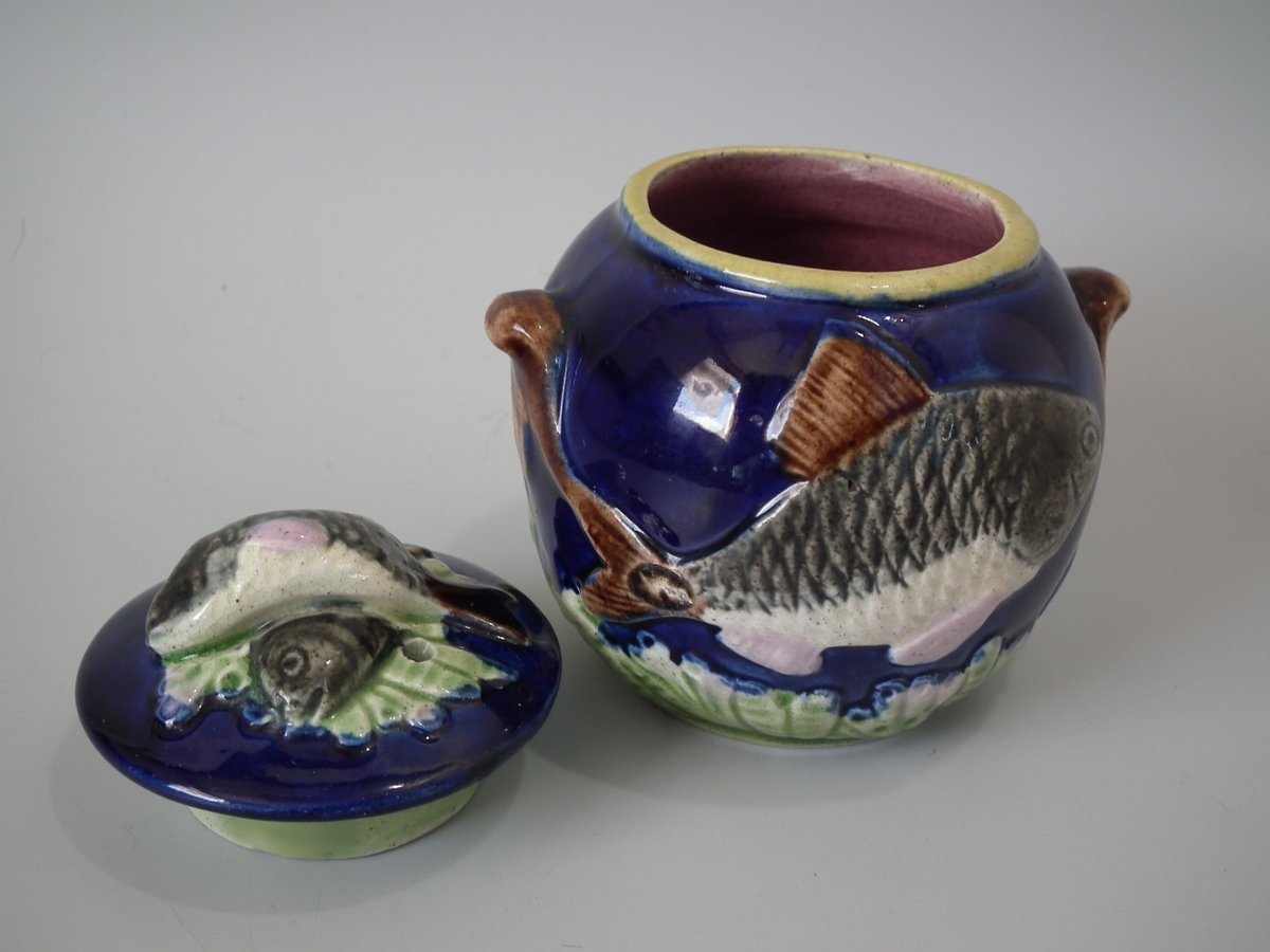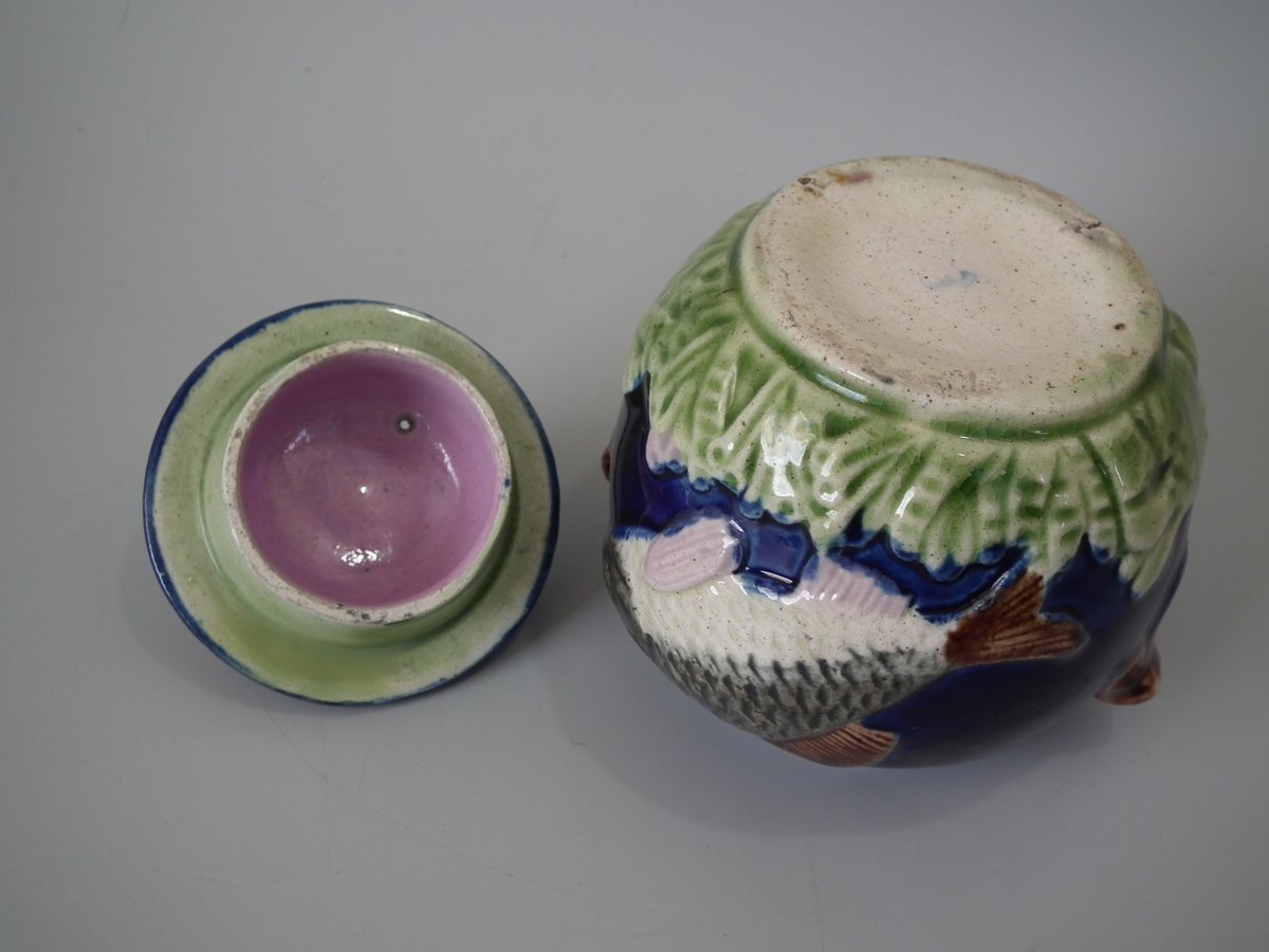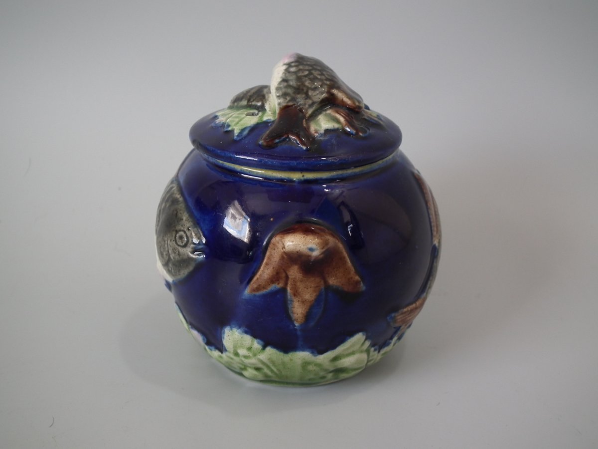Victorian, circa 1880. 4.3ins high, 4.1ins wide, 4.1ins depth. Majolica pot and cover which features fish swimming over corals.