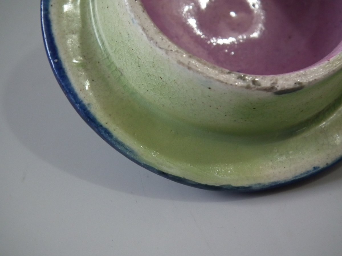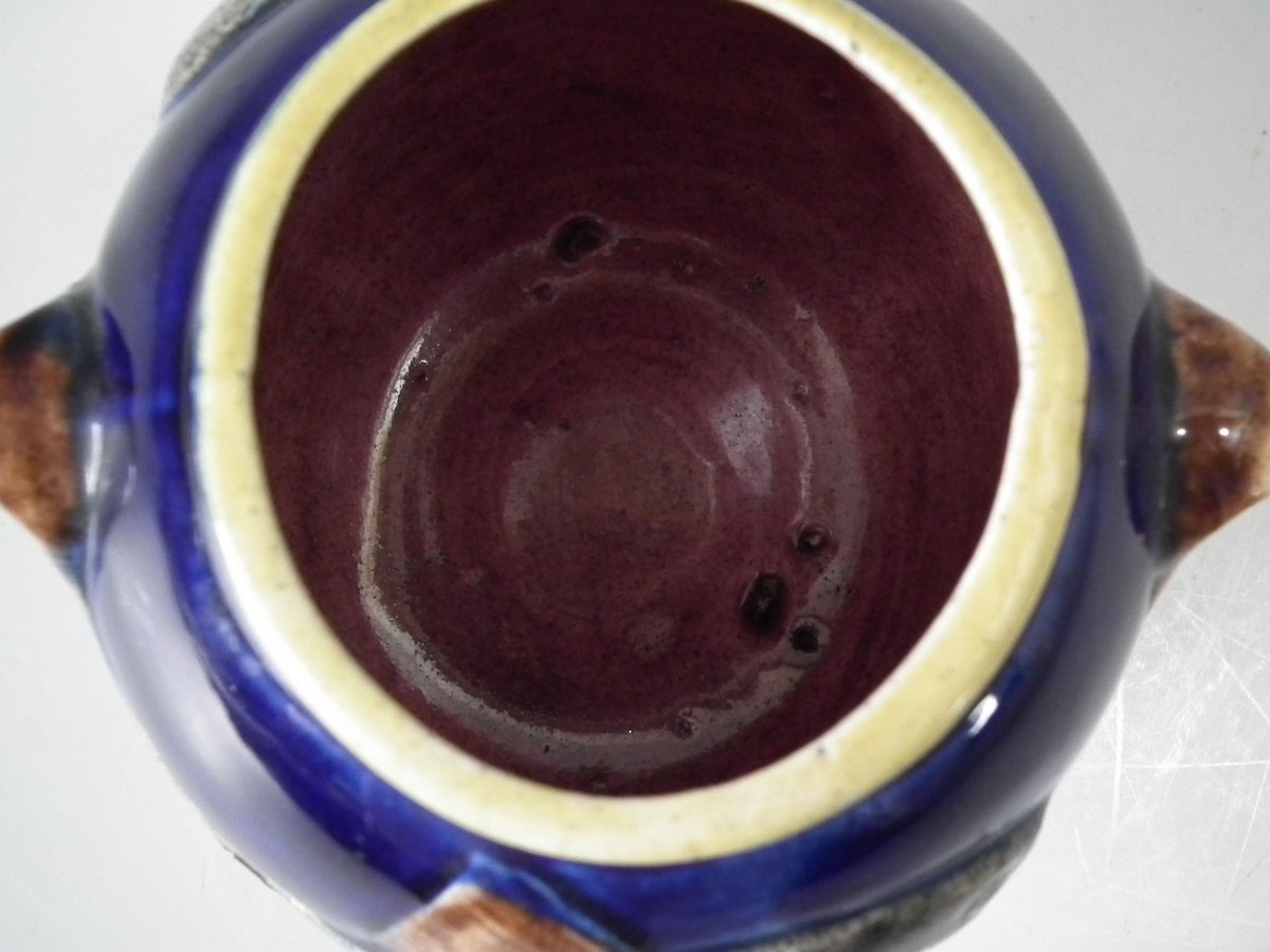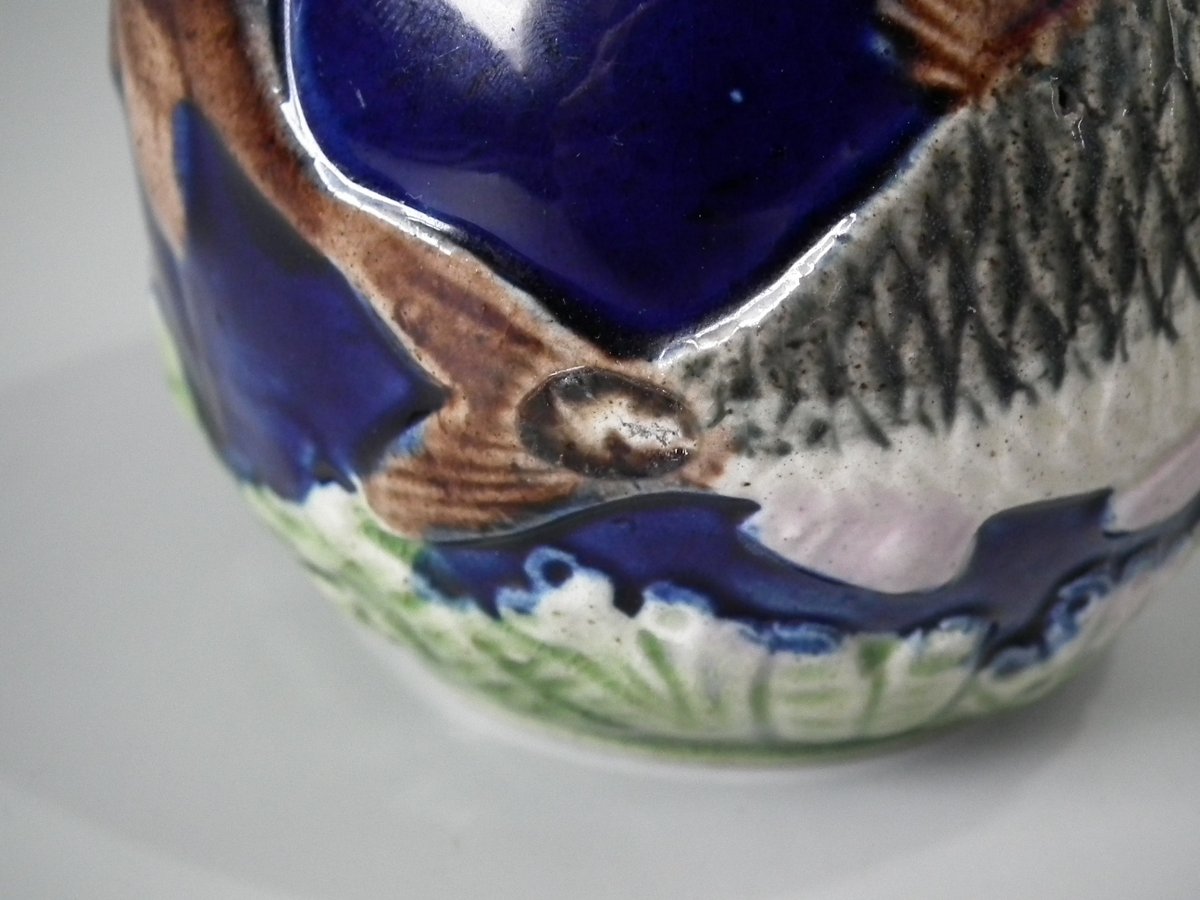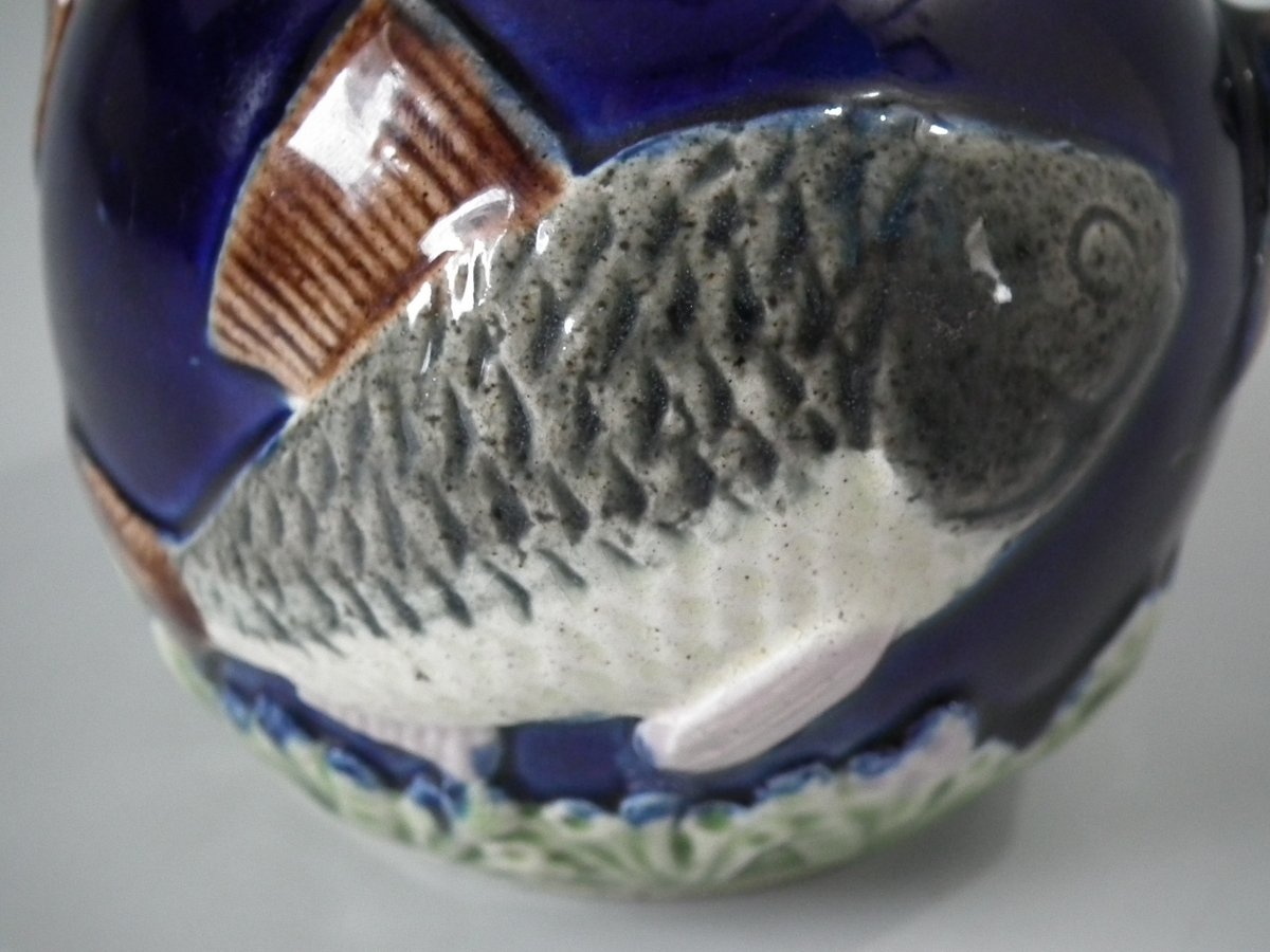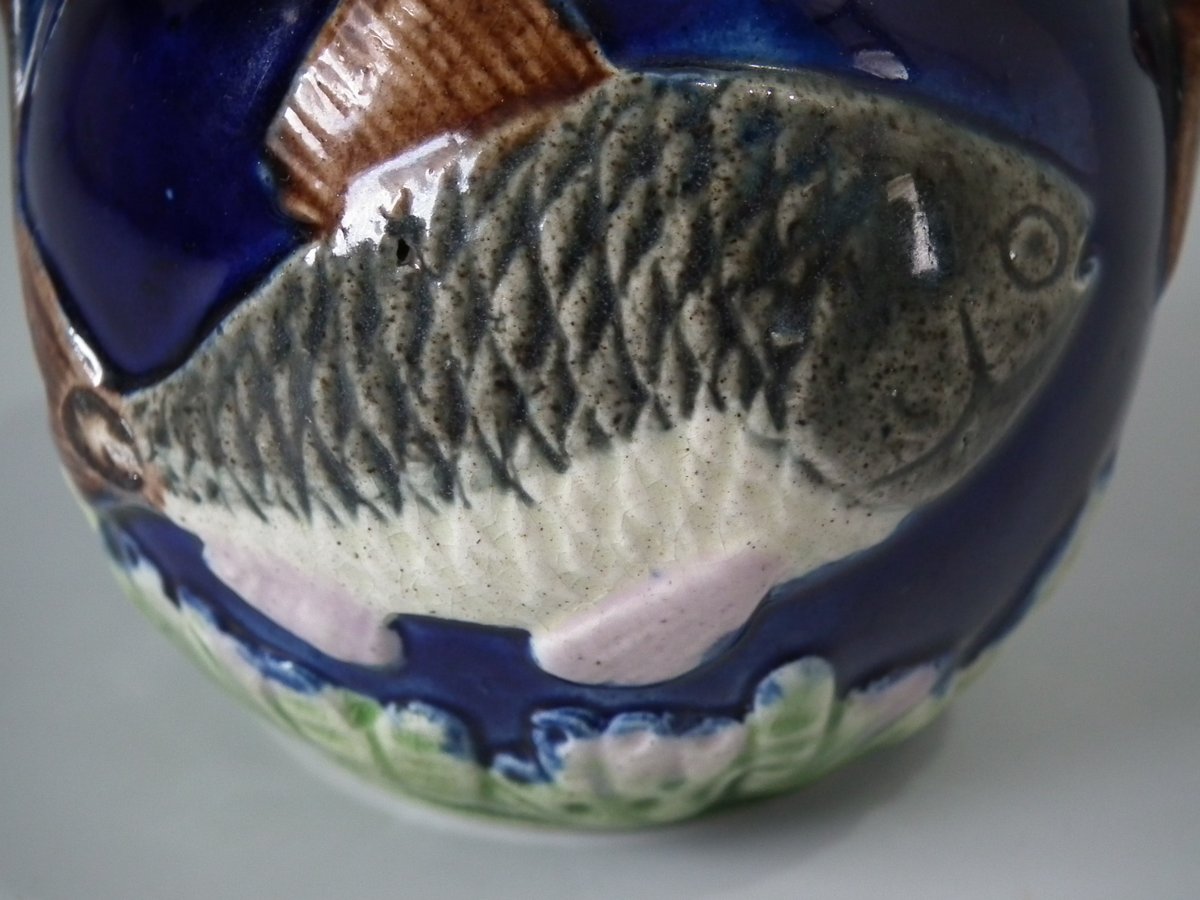 Victorian, circa 1880. 4.3ins high, 4.1ins wide, 4.1ins depth. Majolica pot and cover which features fish swimming over corals.