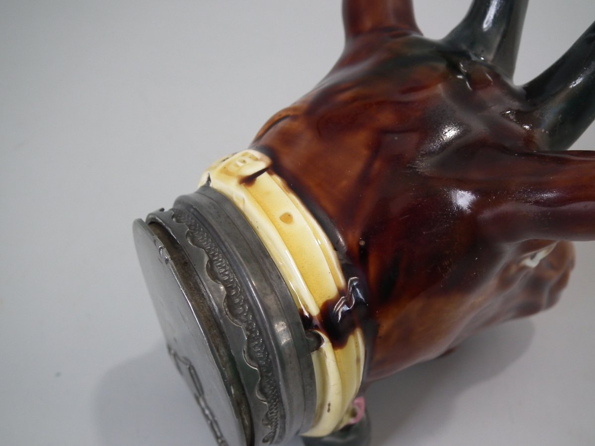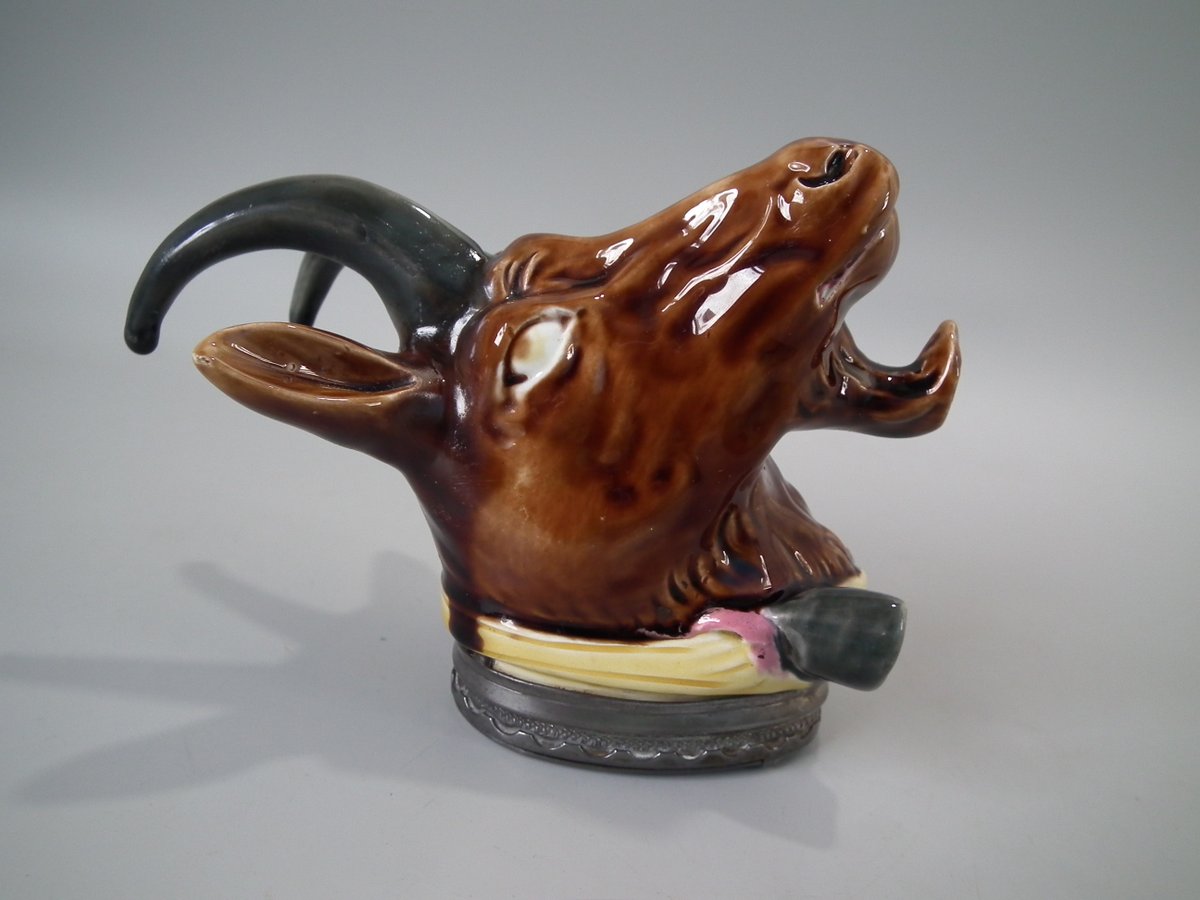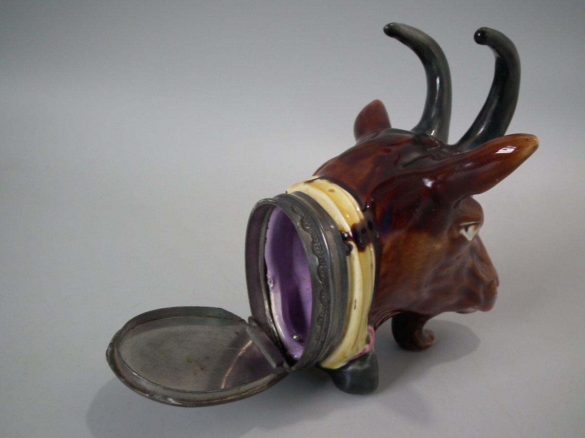 Victorian, circa 1870. 5.5ins high, 4.3ins wide, 4.3ins depth. Majolica snuff box which features a goats head.