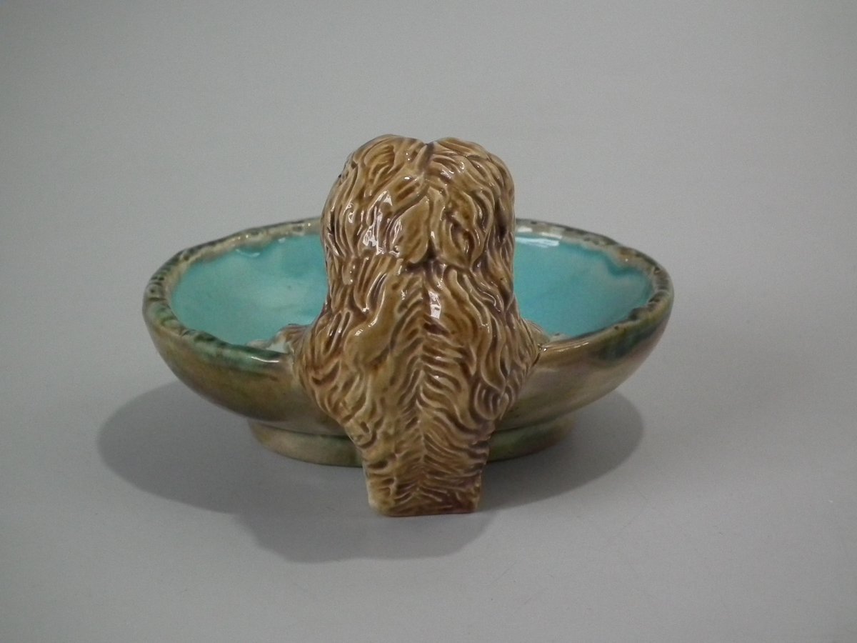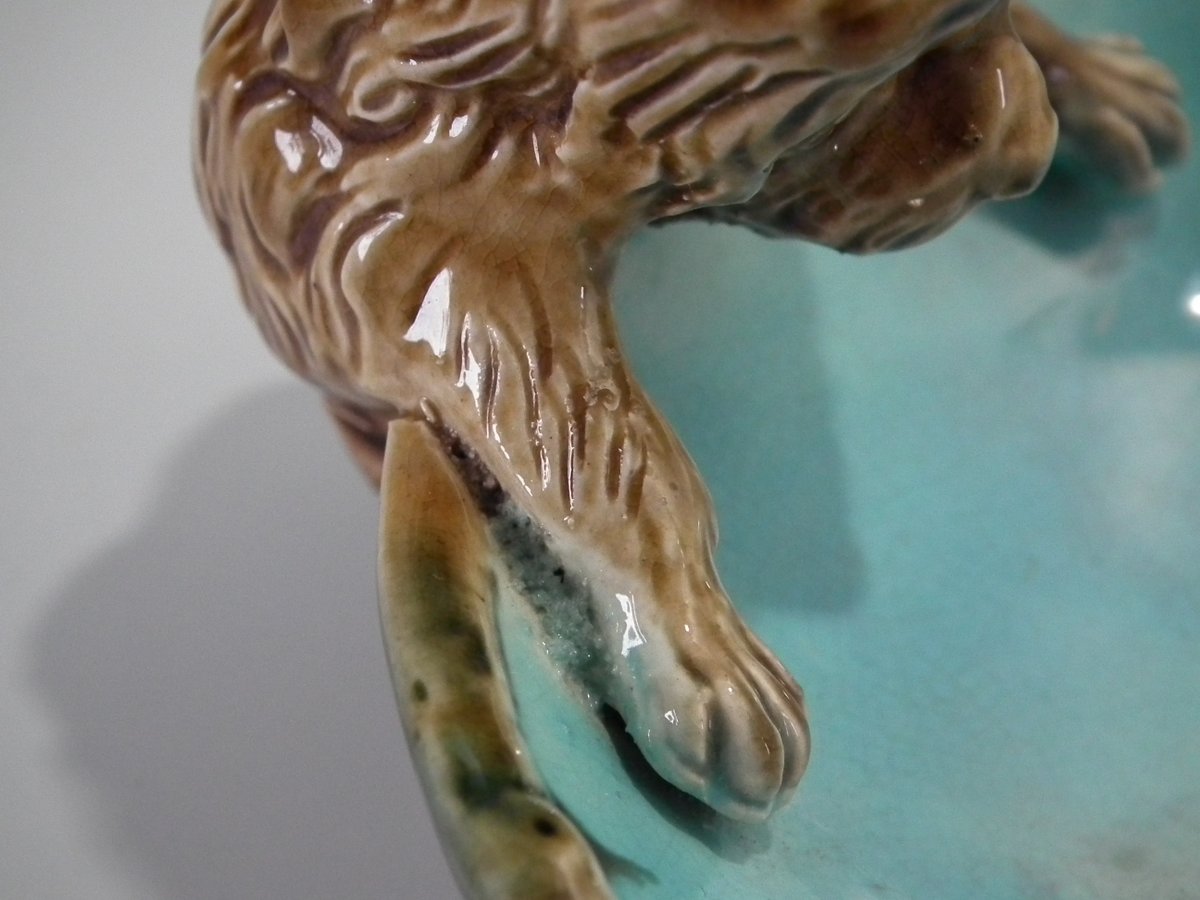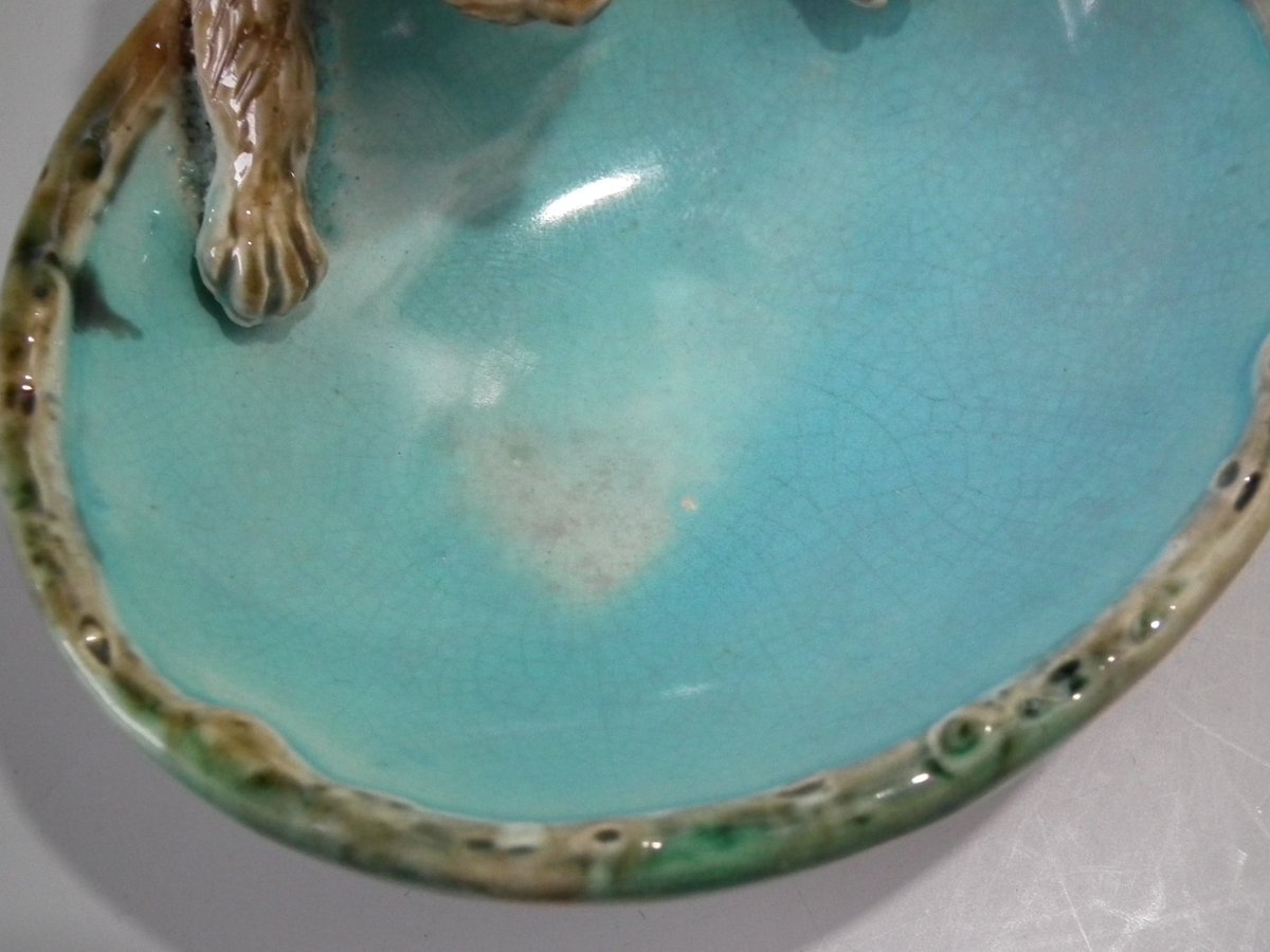 Victorian, circa 1870. 2.8ins high, 3.9ins wide, 3.9ins depth. George Jones Majolica dish which features a dog to the rim.