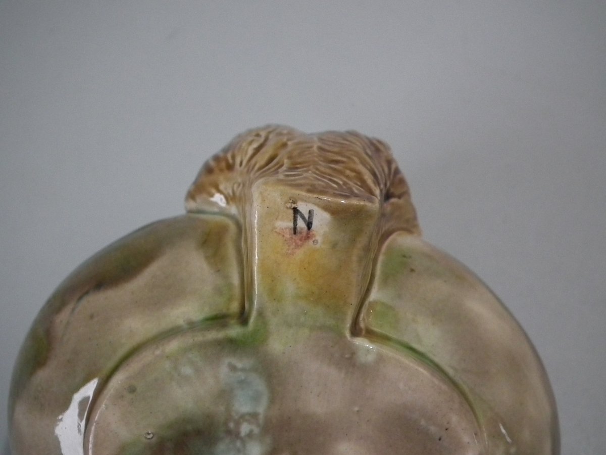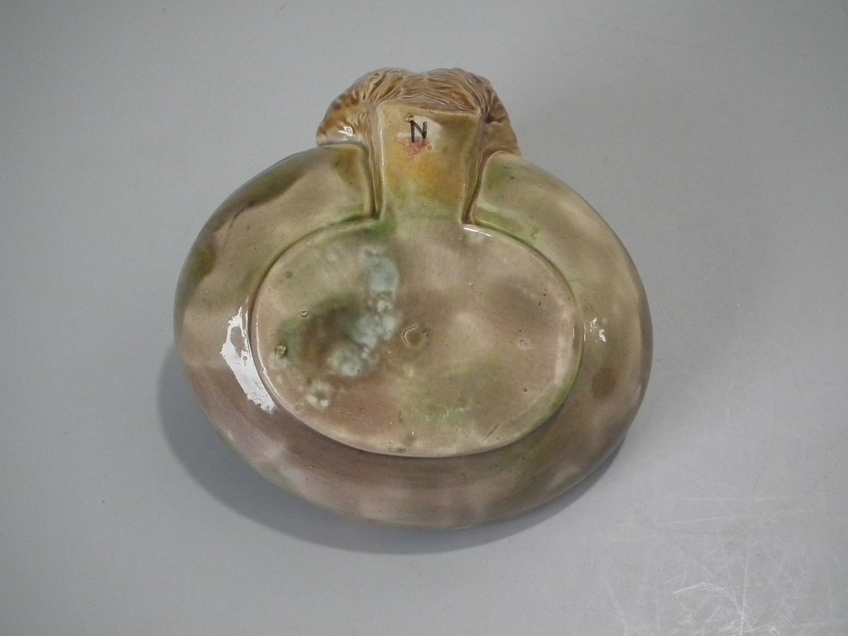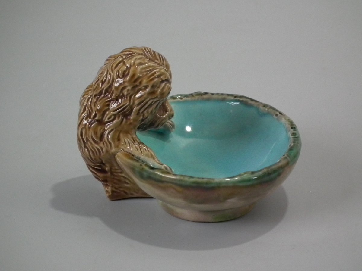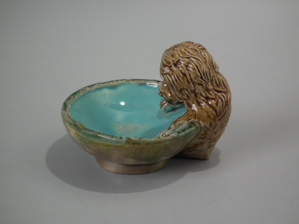 Victorian, circa 1870. 2.8ins high, 3.9ins wide, 3.9ins depth. George Jones Majolica dish which features a dog to the rim.