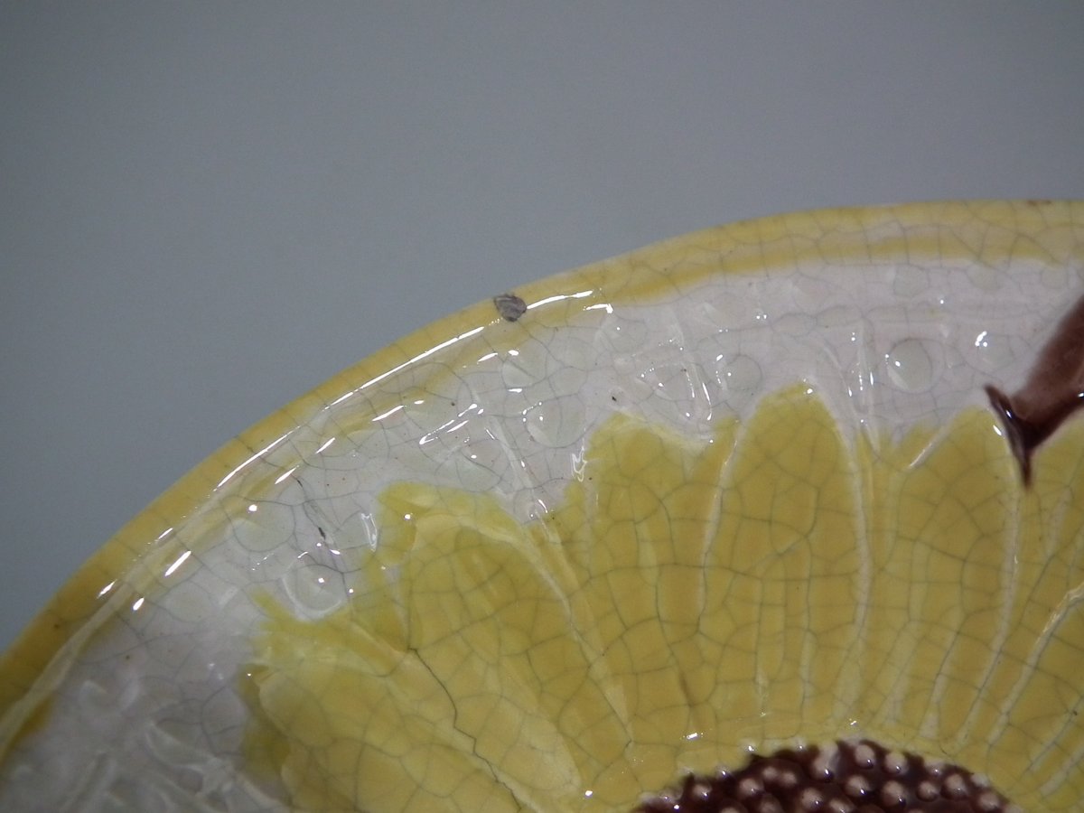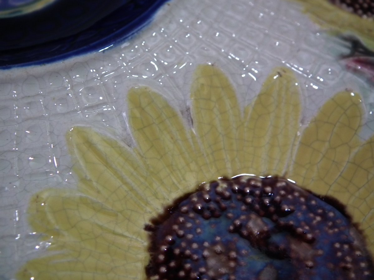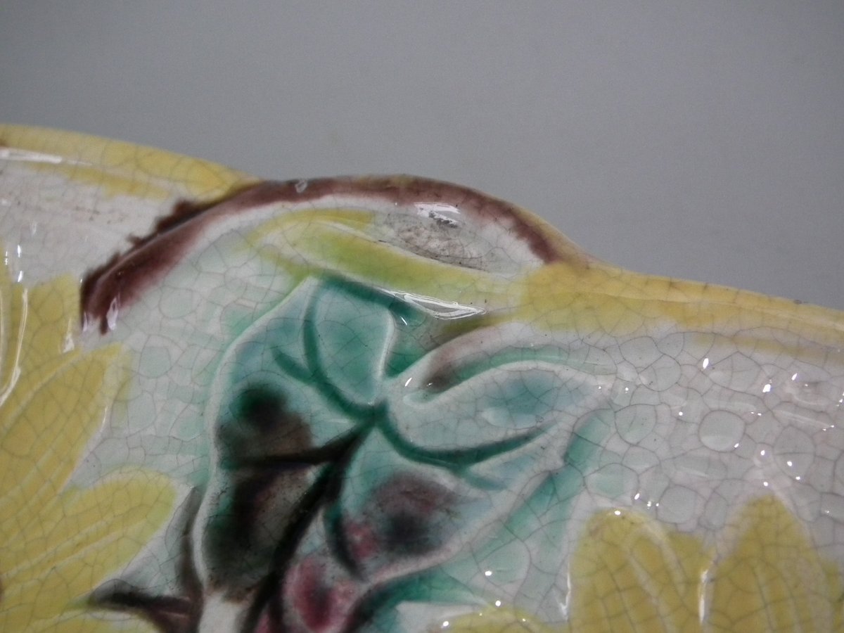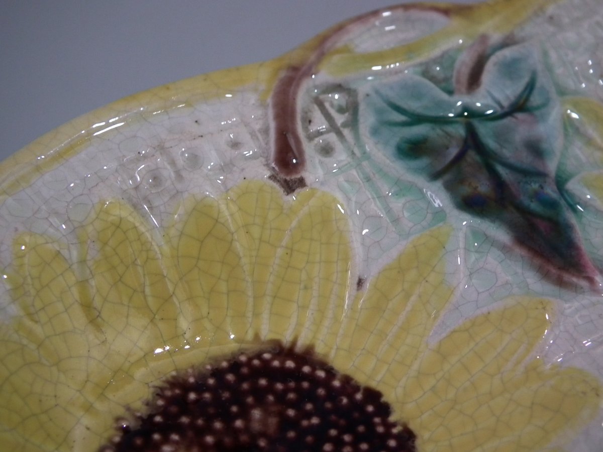 Victorian, circa 1880. 9.8ins high, 9.8ins wide, 0.8ins depth. Lear Majolica oyster plate which features sunflowers and trailing vines.