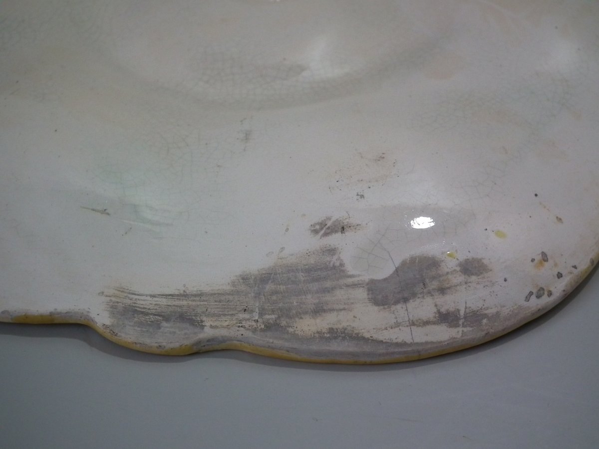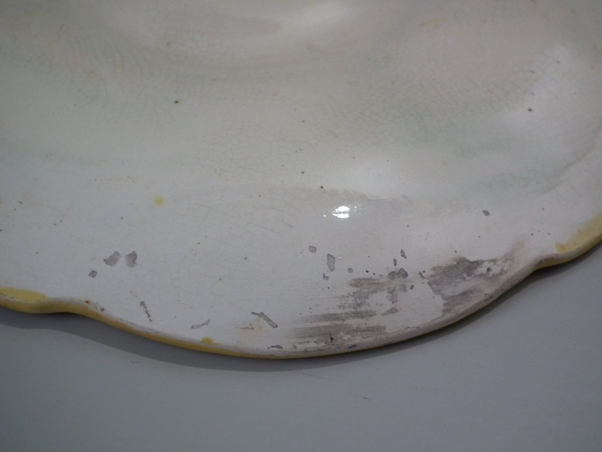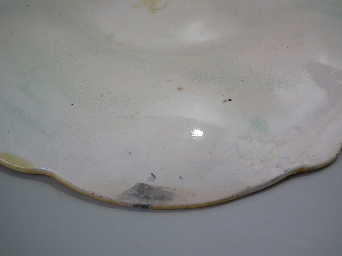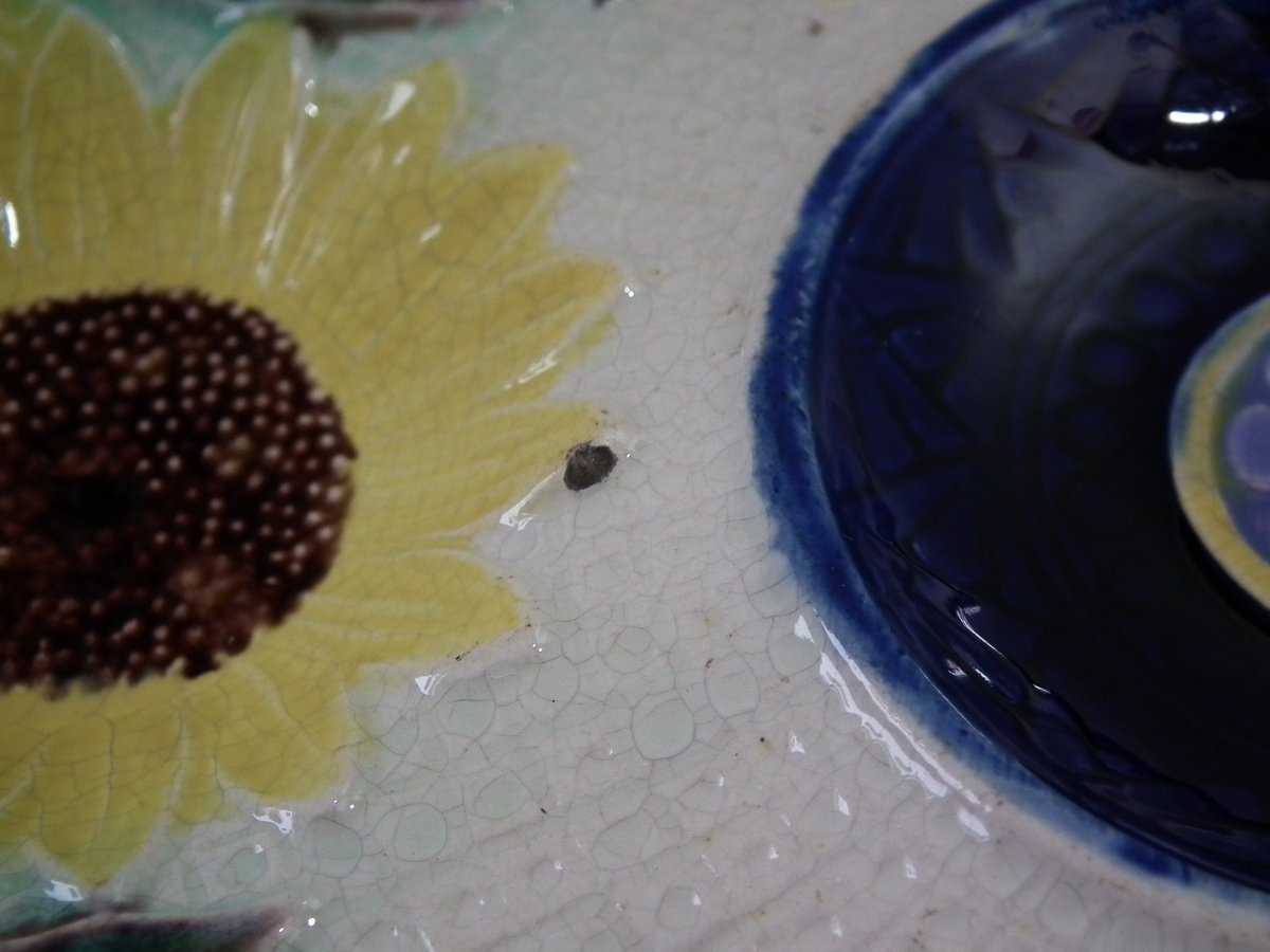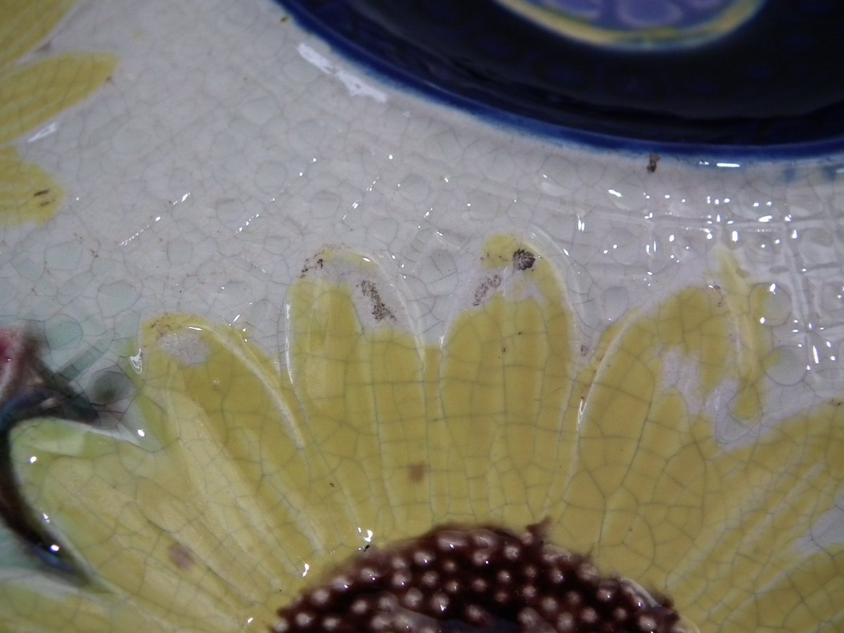 Victorian, circa 1880. 9.8ins high, 9.8ins wide, 0.8ins depth. Lear Majolica oyster plate which features sunflowers and trailing vines.