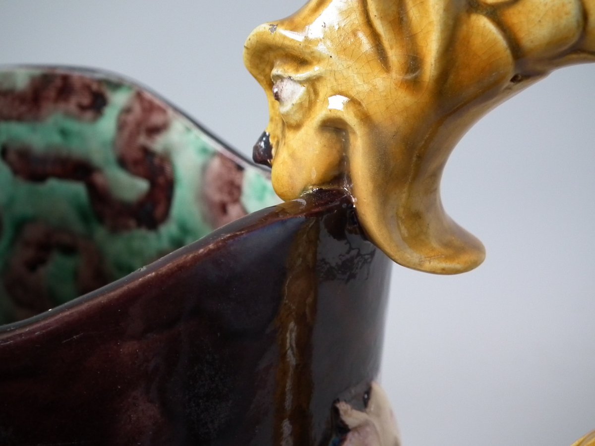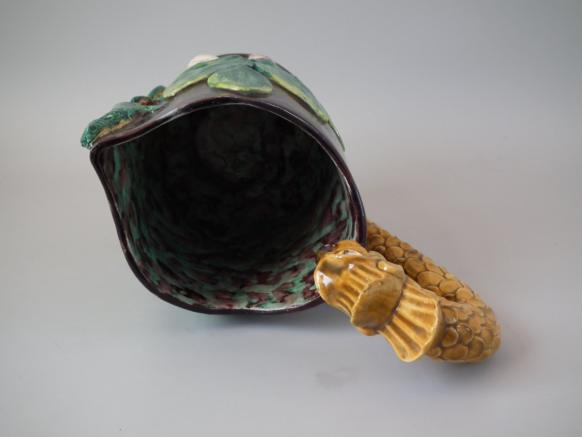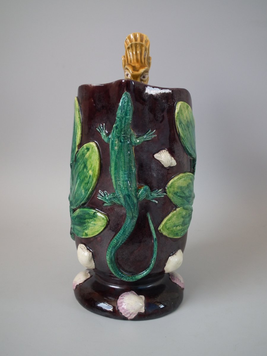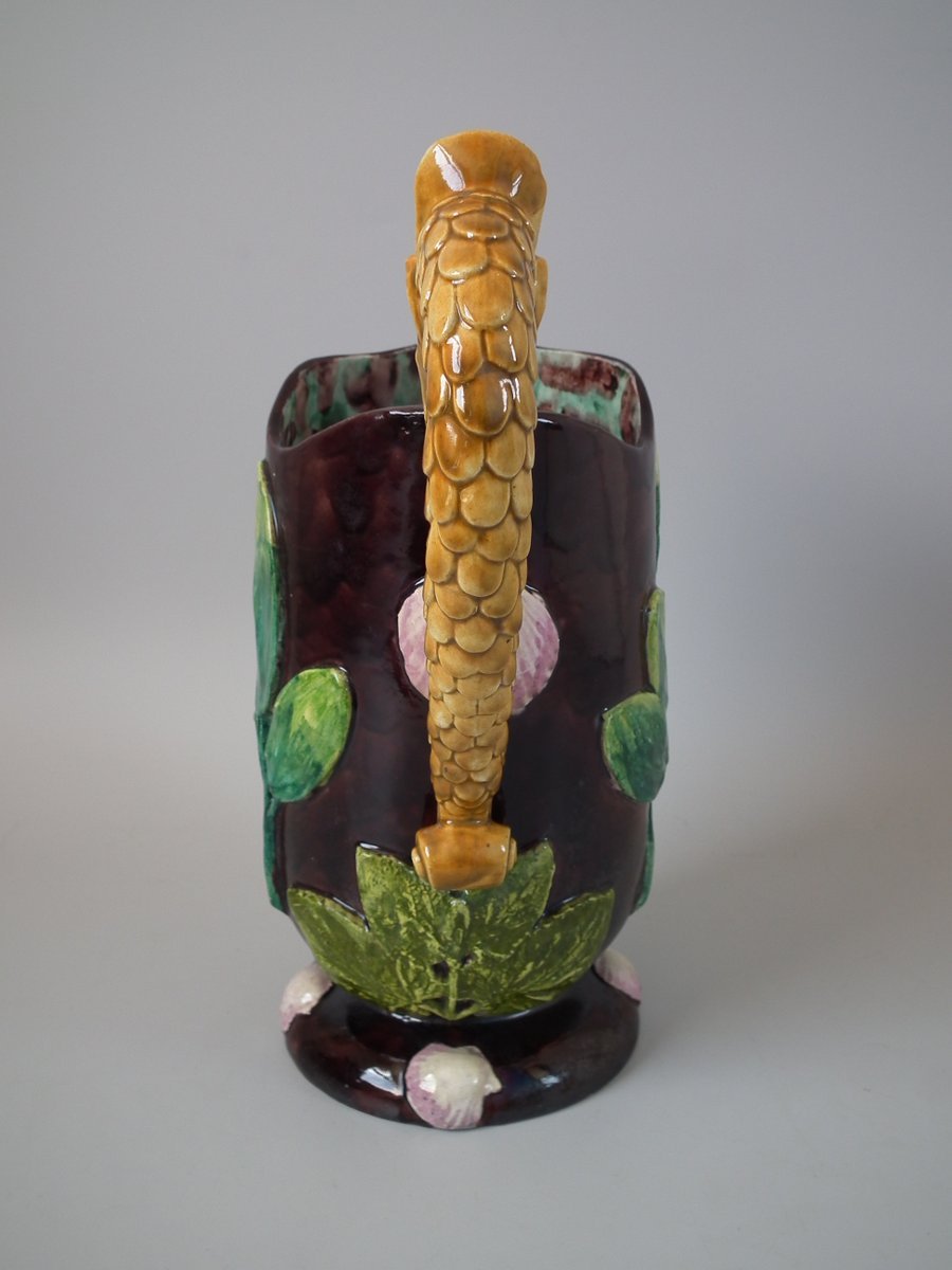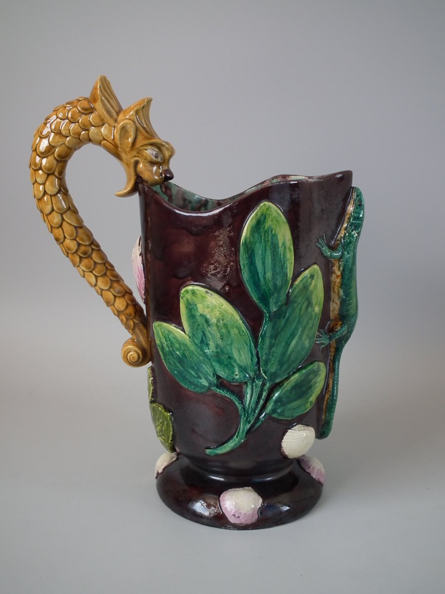 Victorian, circa 1880. 11.4ins high, 8.9ins wide, 4.5ins depth. Thomas Sergent Majolica jug/pitcher which features a lizard, leaves, shells and a dragon-headed handle.