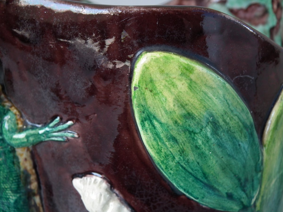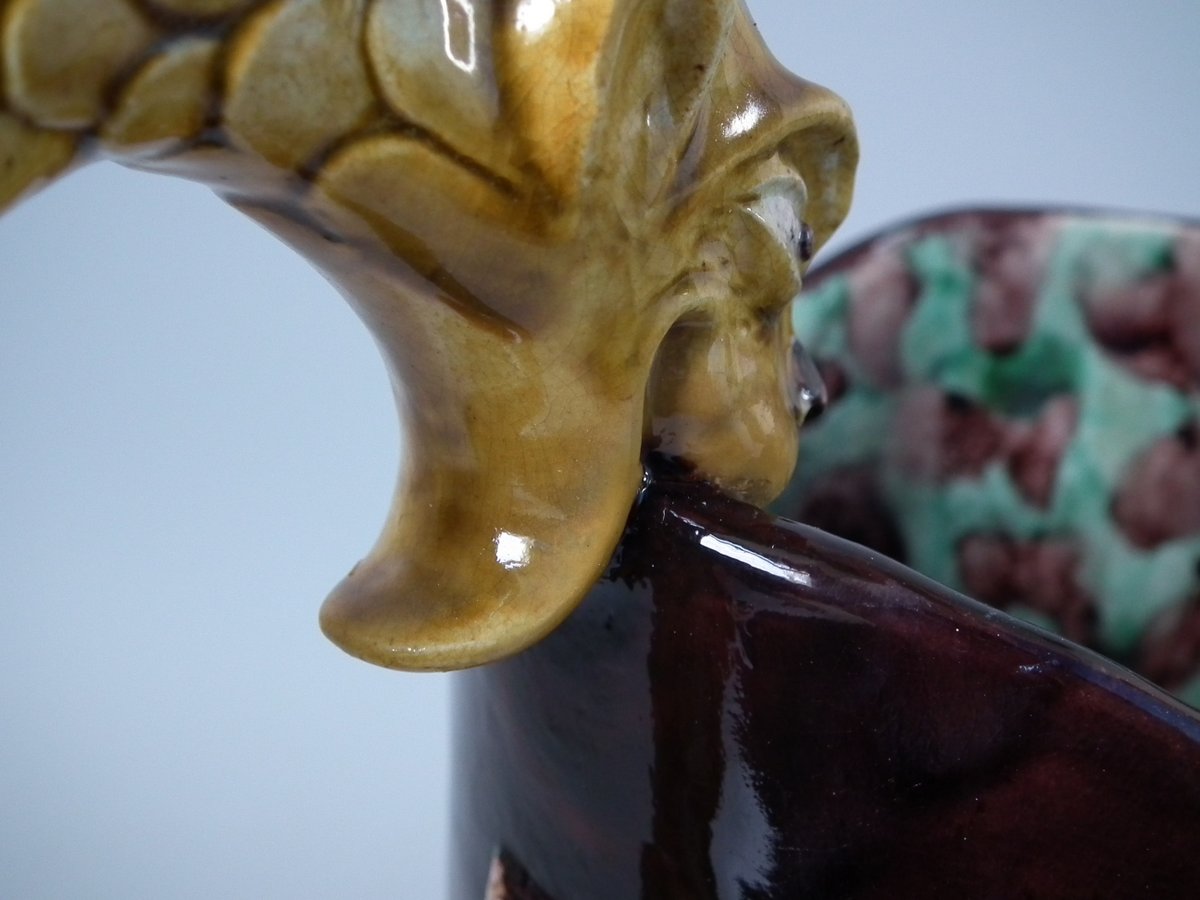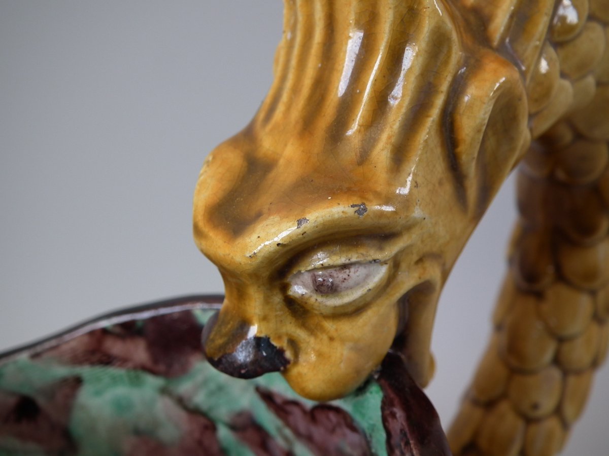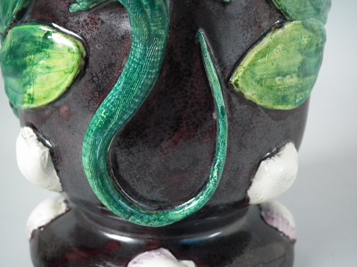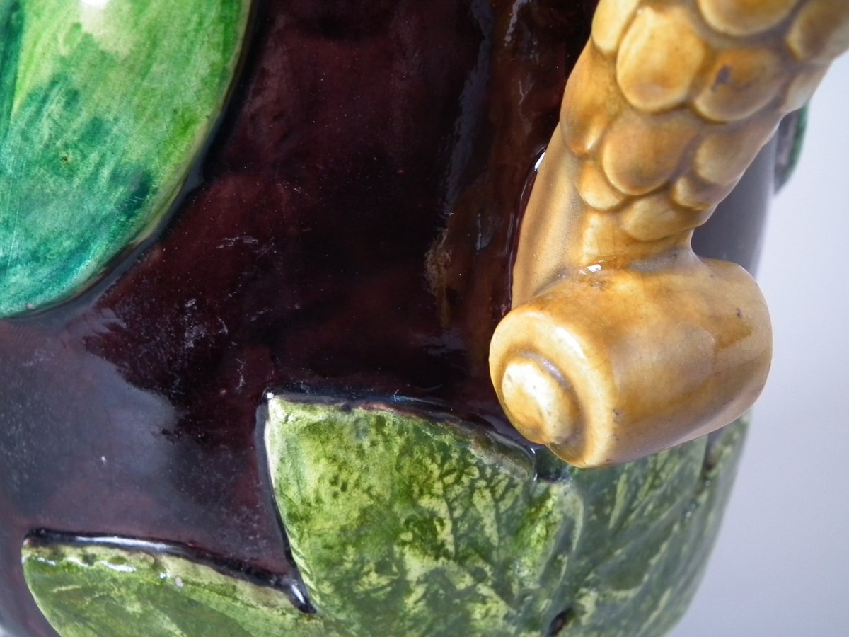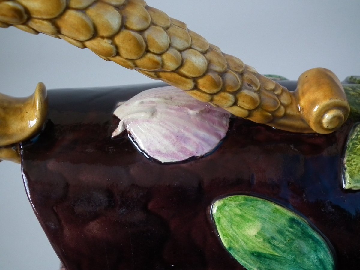 Victorian, circa 1880. 11.4ins high, 8.9ins wide, 4.5ins depth. Thomas Sergent Majolica jug/pitcher which features a lizard, leaves, shells and a dragon-headed handle.