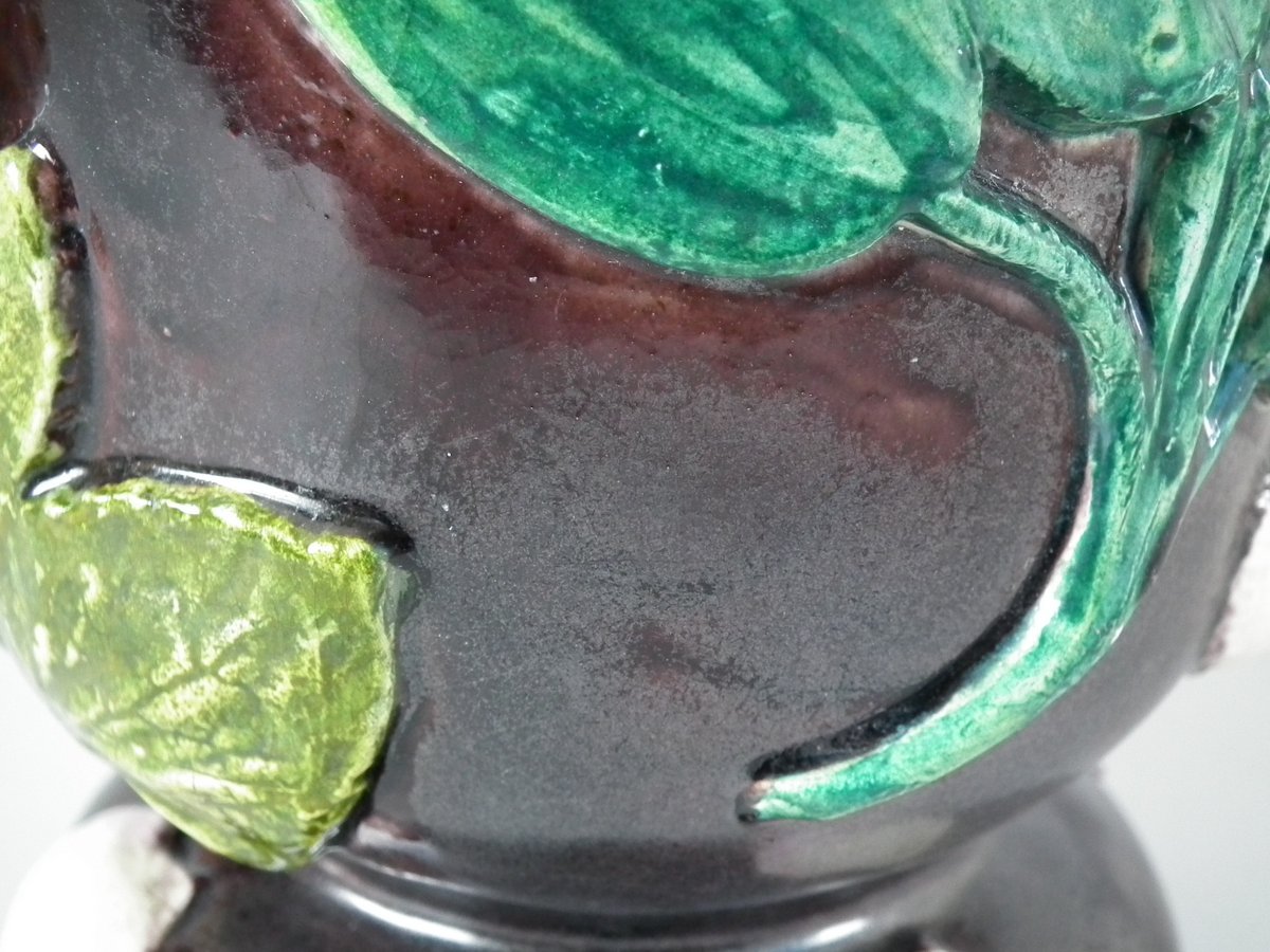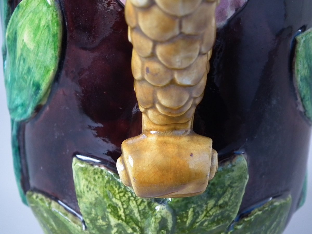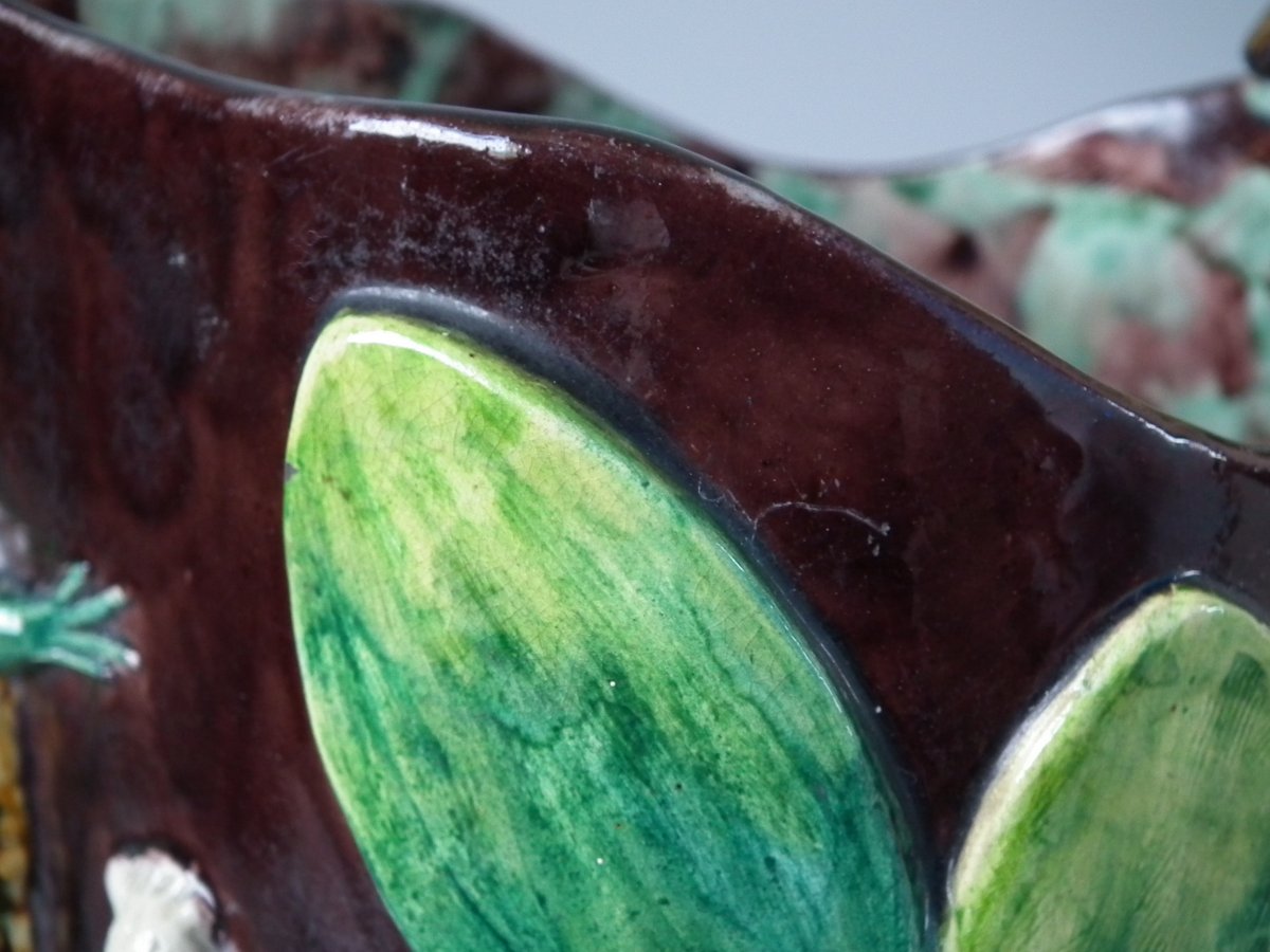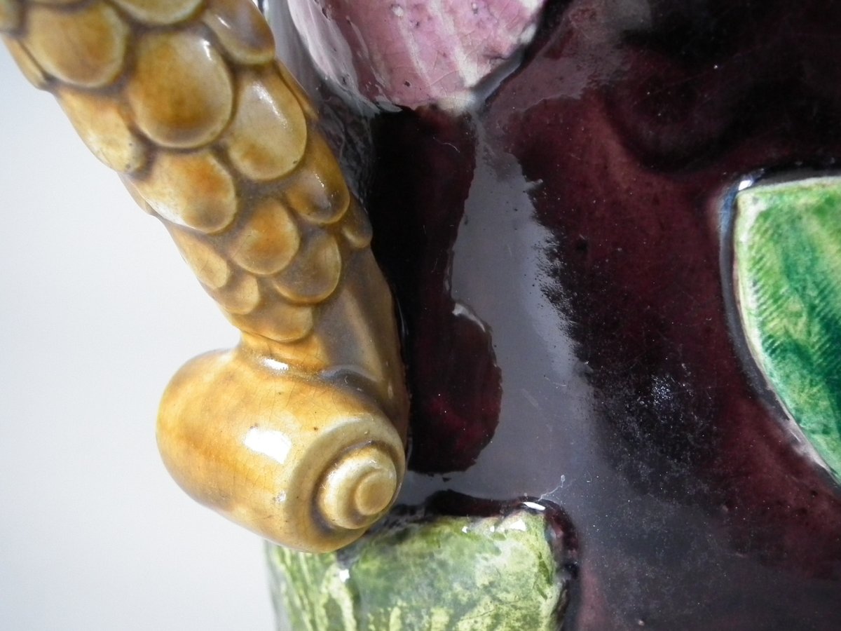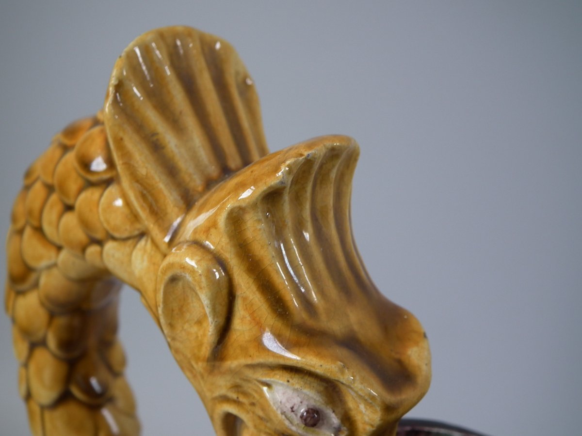 Victorian, circa 1880. 11.4ins high, 8.9ins wide, 4.5ins depth. Thomas Sergent Majolica jug/pitcher which features a lizard, leaves, shells and a dragon-headed handle.