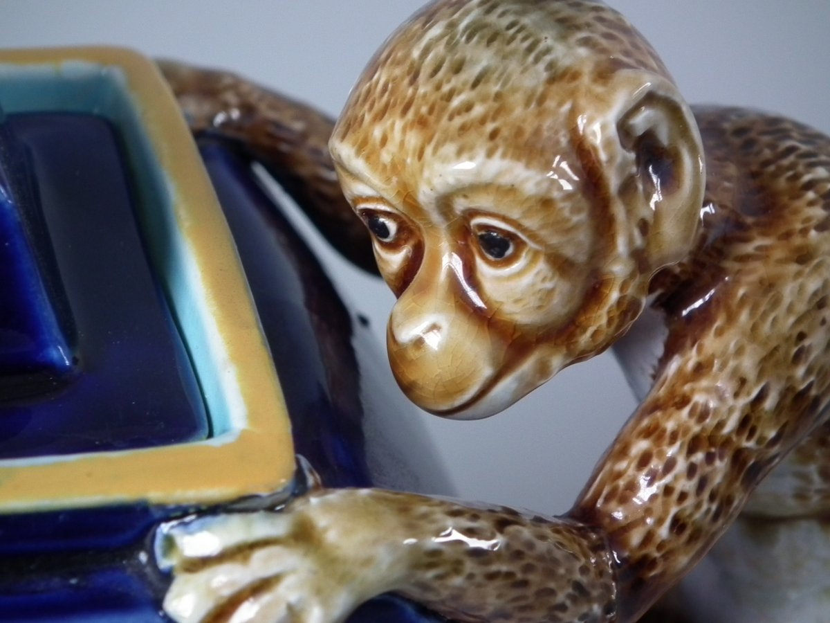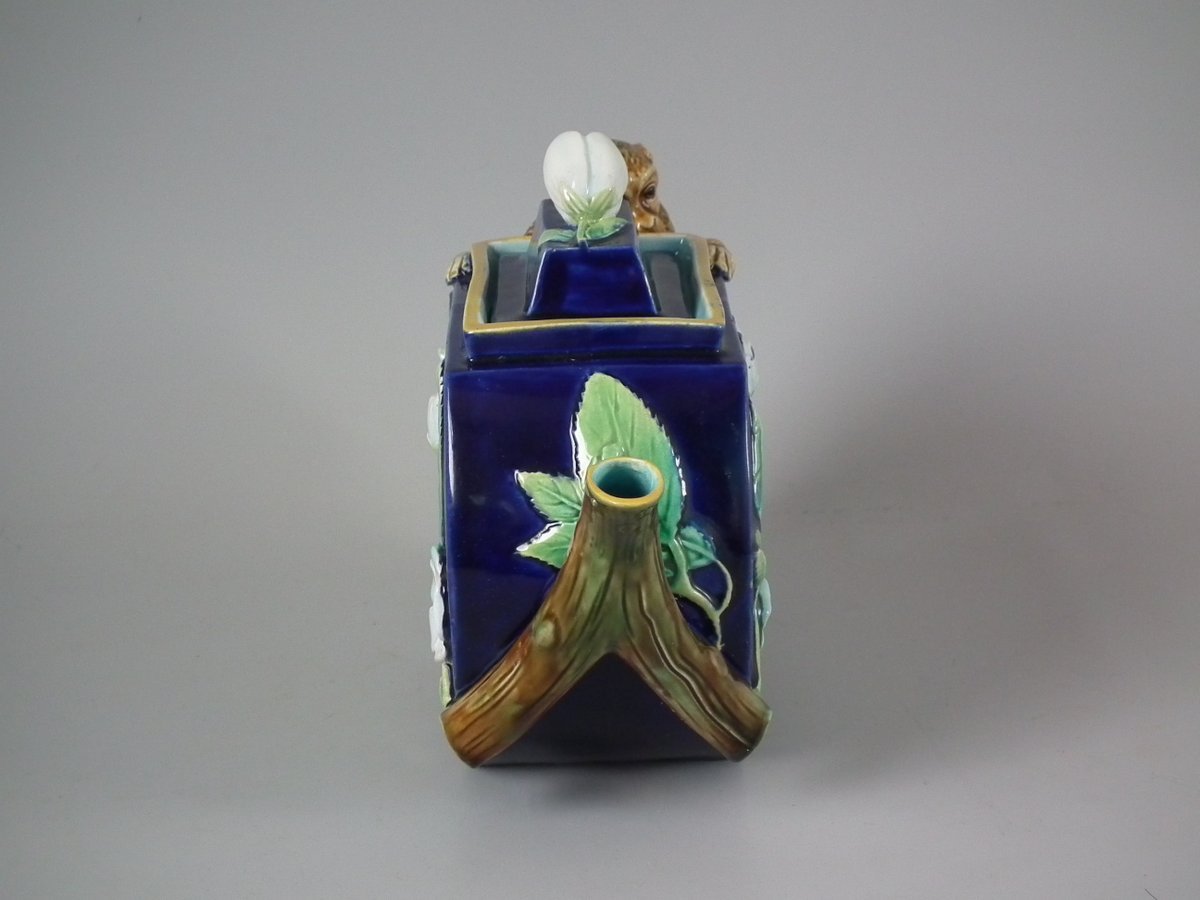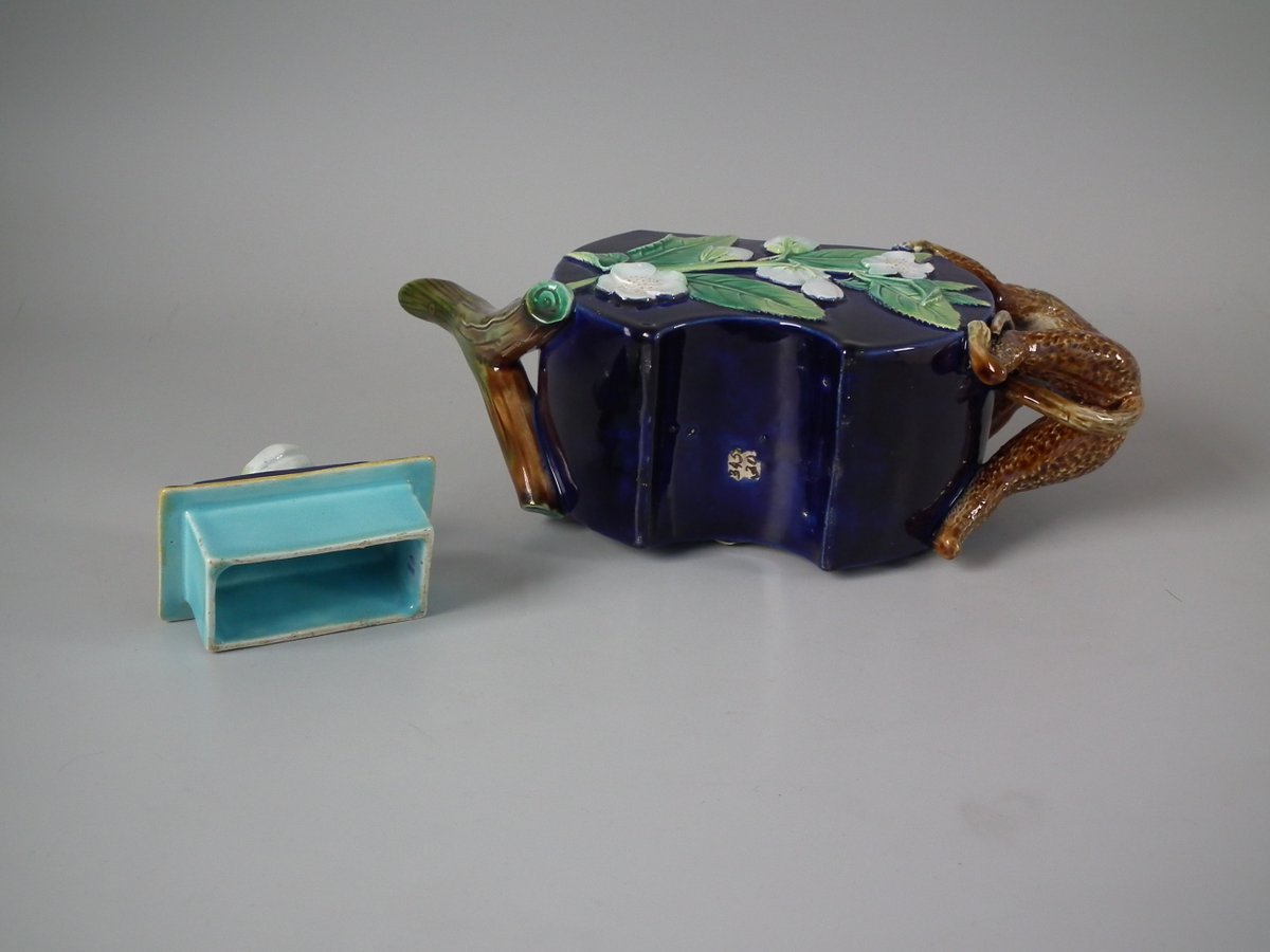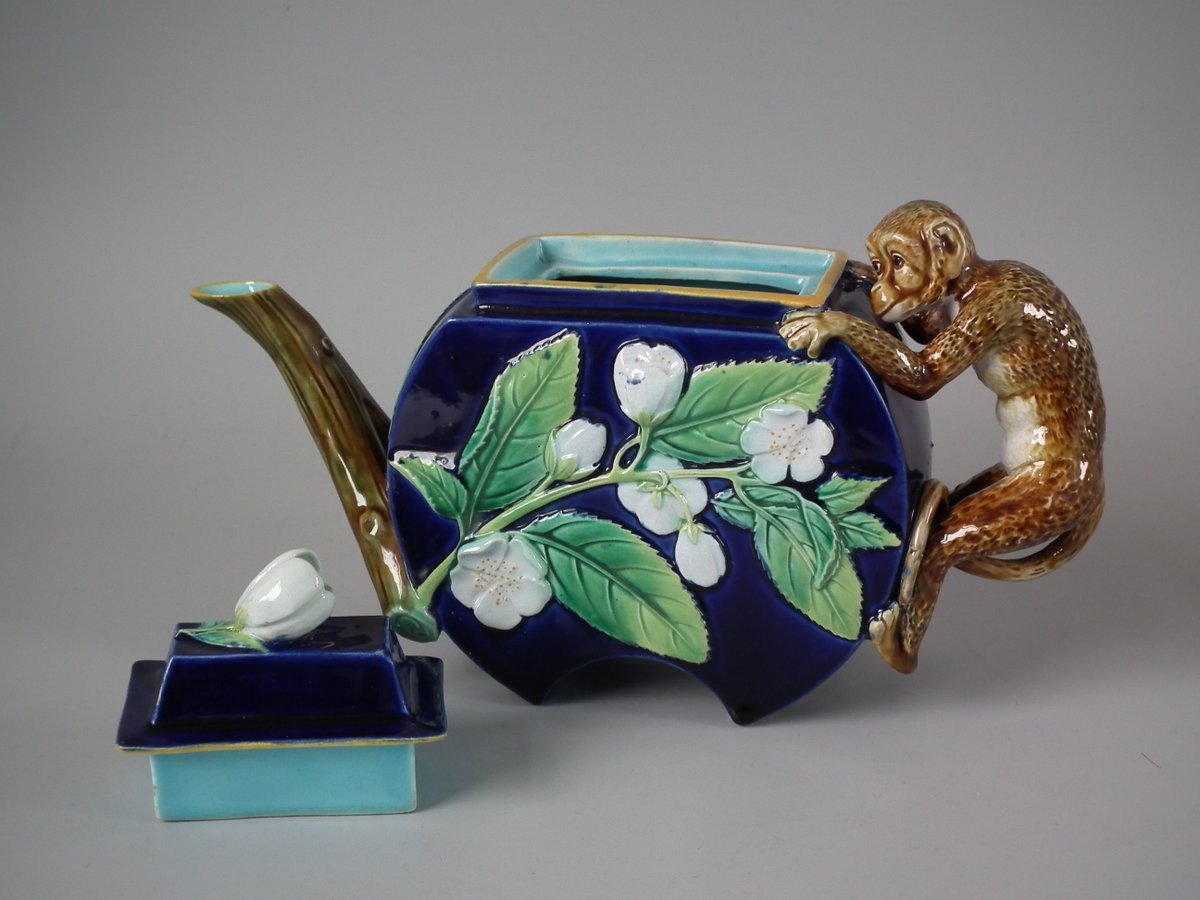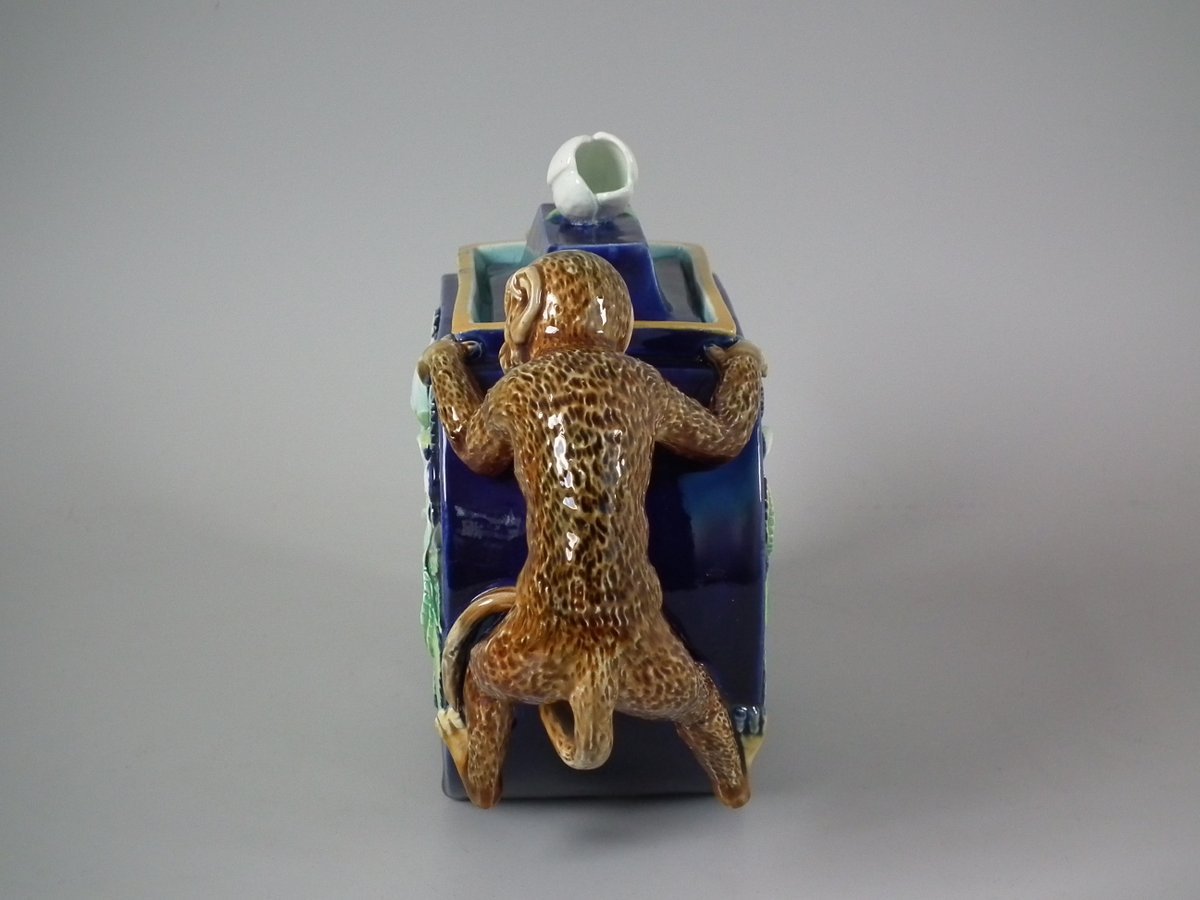 Victorian, circa 1870. 5.9ins high, 9.8ins wide, 3.1ins depth. George Jones Majolica teapot which features a handle in the form of a monkey.