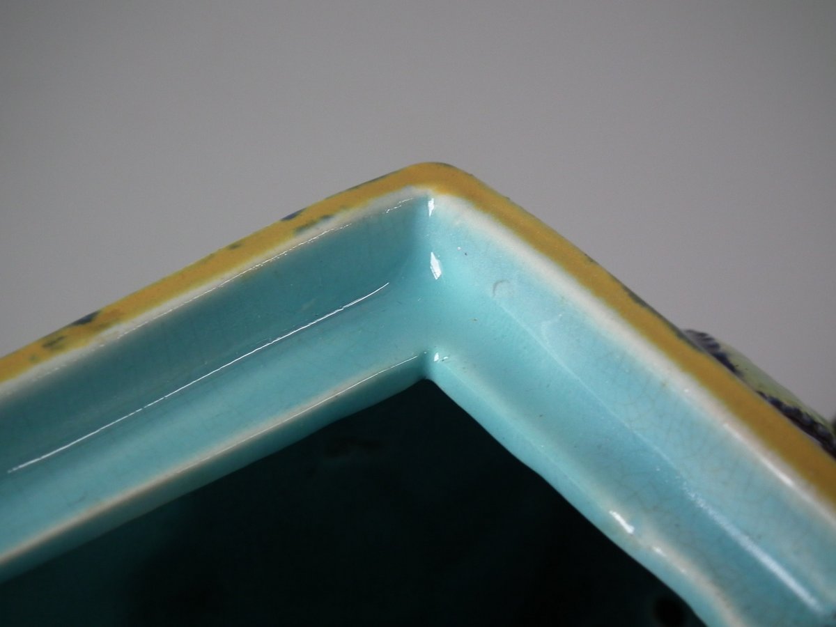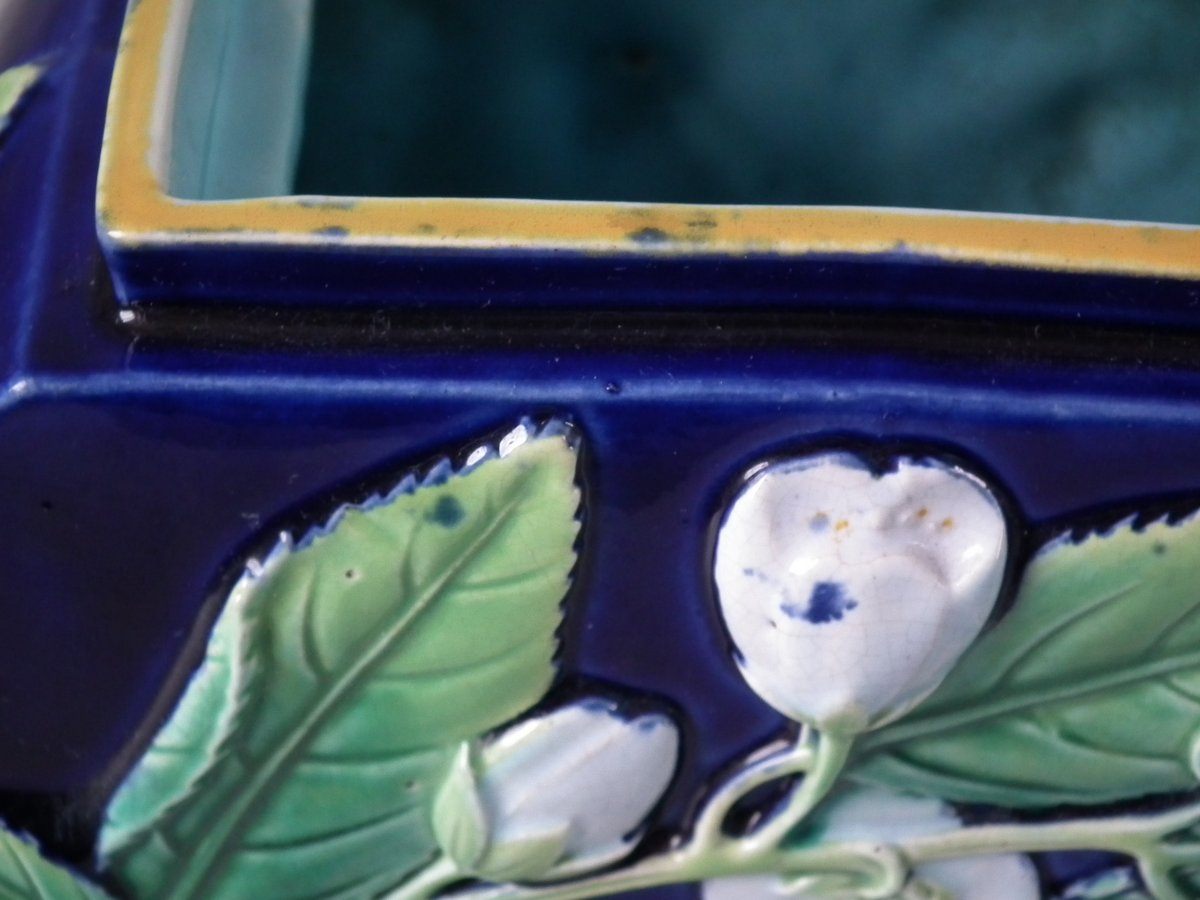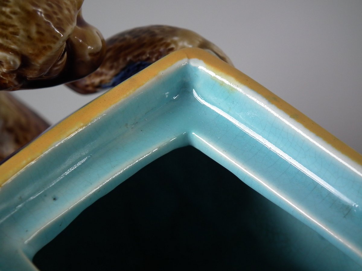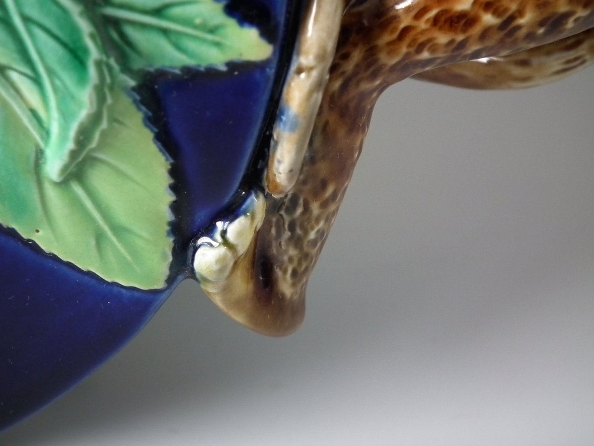 Victorian, circa 1870. 5.9ins high, 9.8ins wide, 3.1ins depth. George Jones Majolica teapot which features a handle in the form of a monkey.