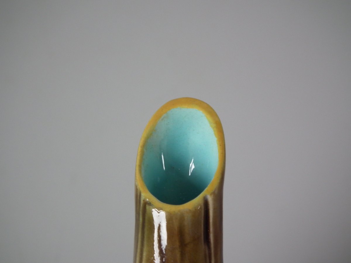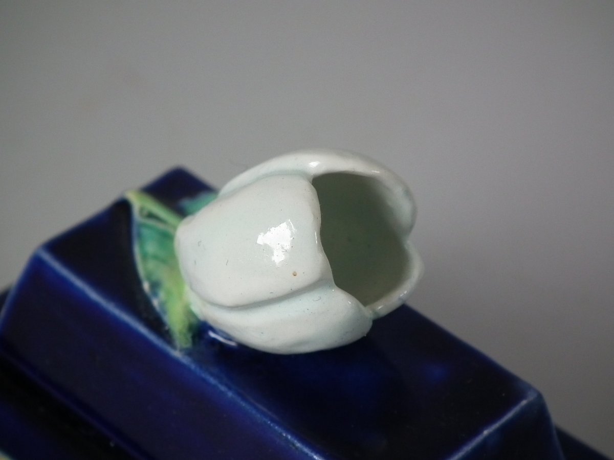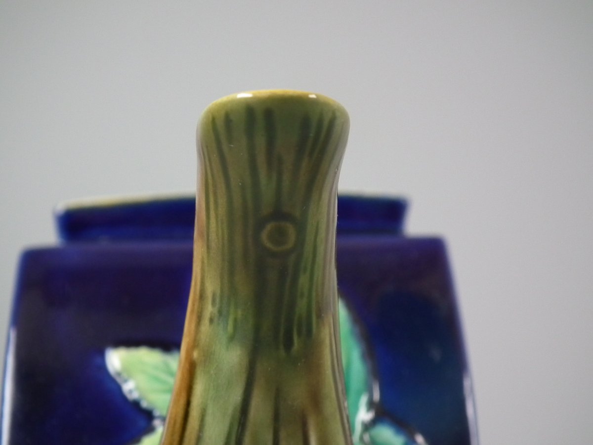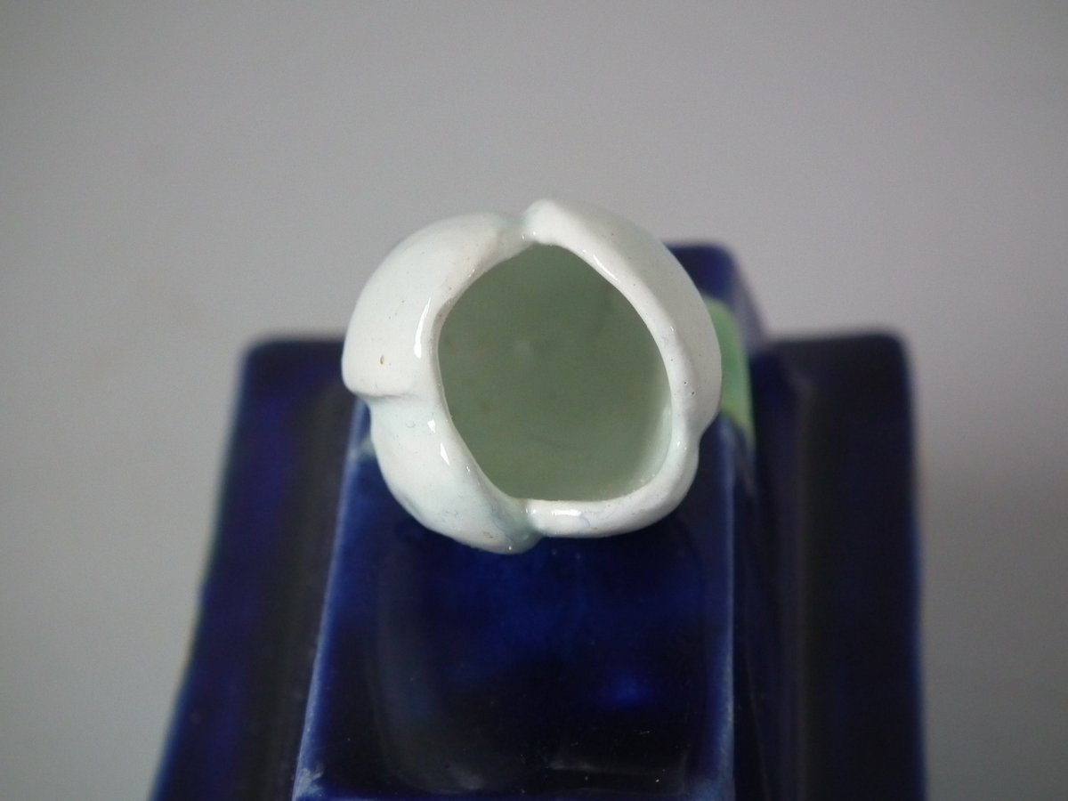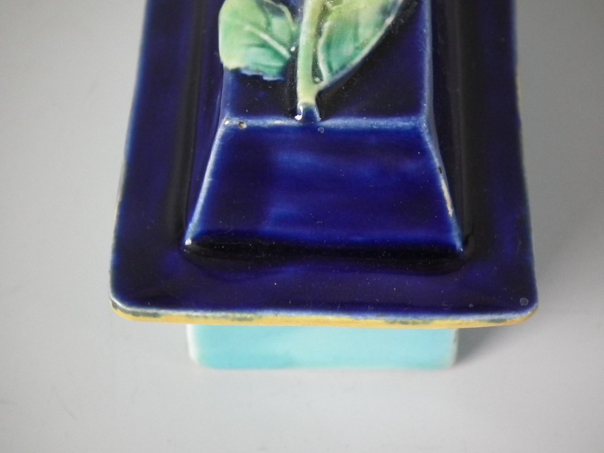 Victorian, circa 1870. 5.9ins high, 9.8ins wide, 3.1ins depth. George Jones Majolica teapot which features a handle in the form of a monkey.
