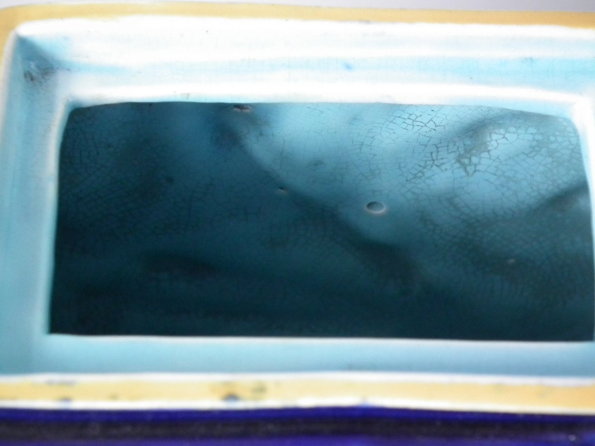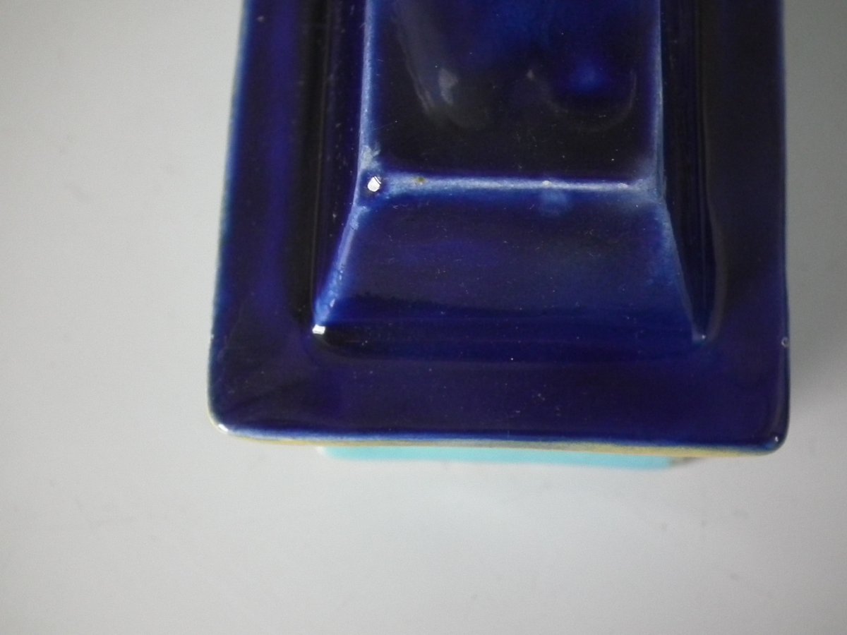 Colouration: cobalt blue, green, brown, are predominant.