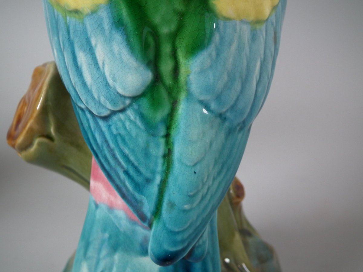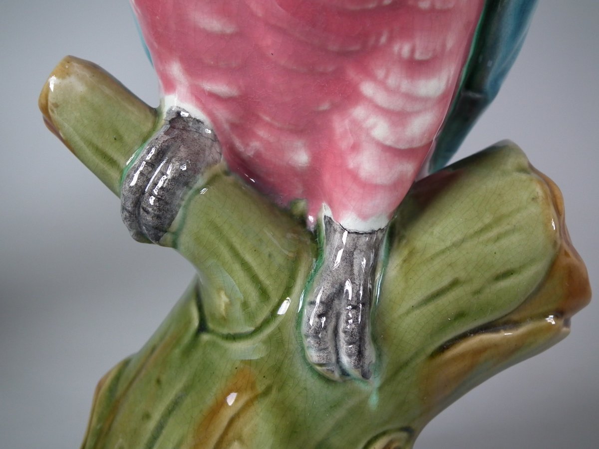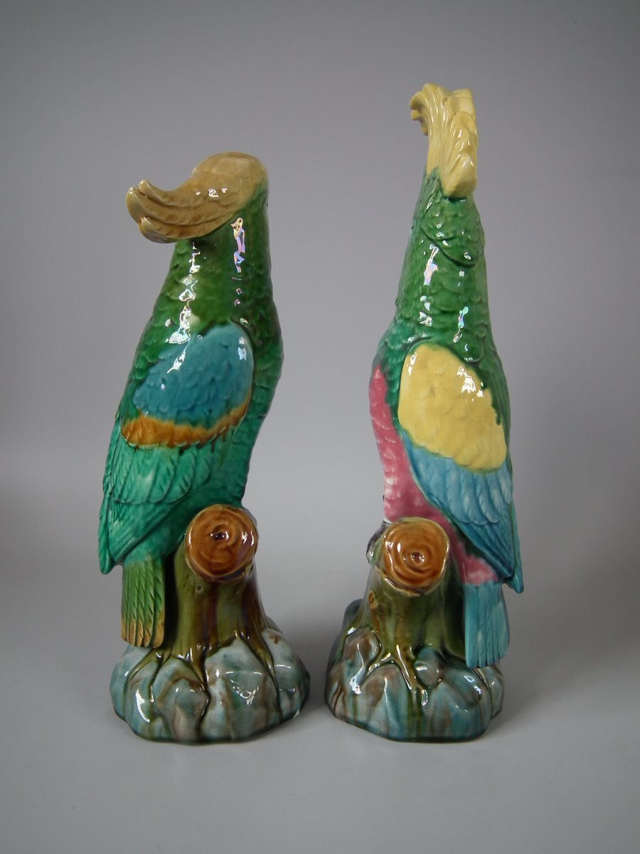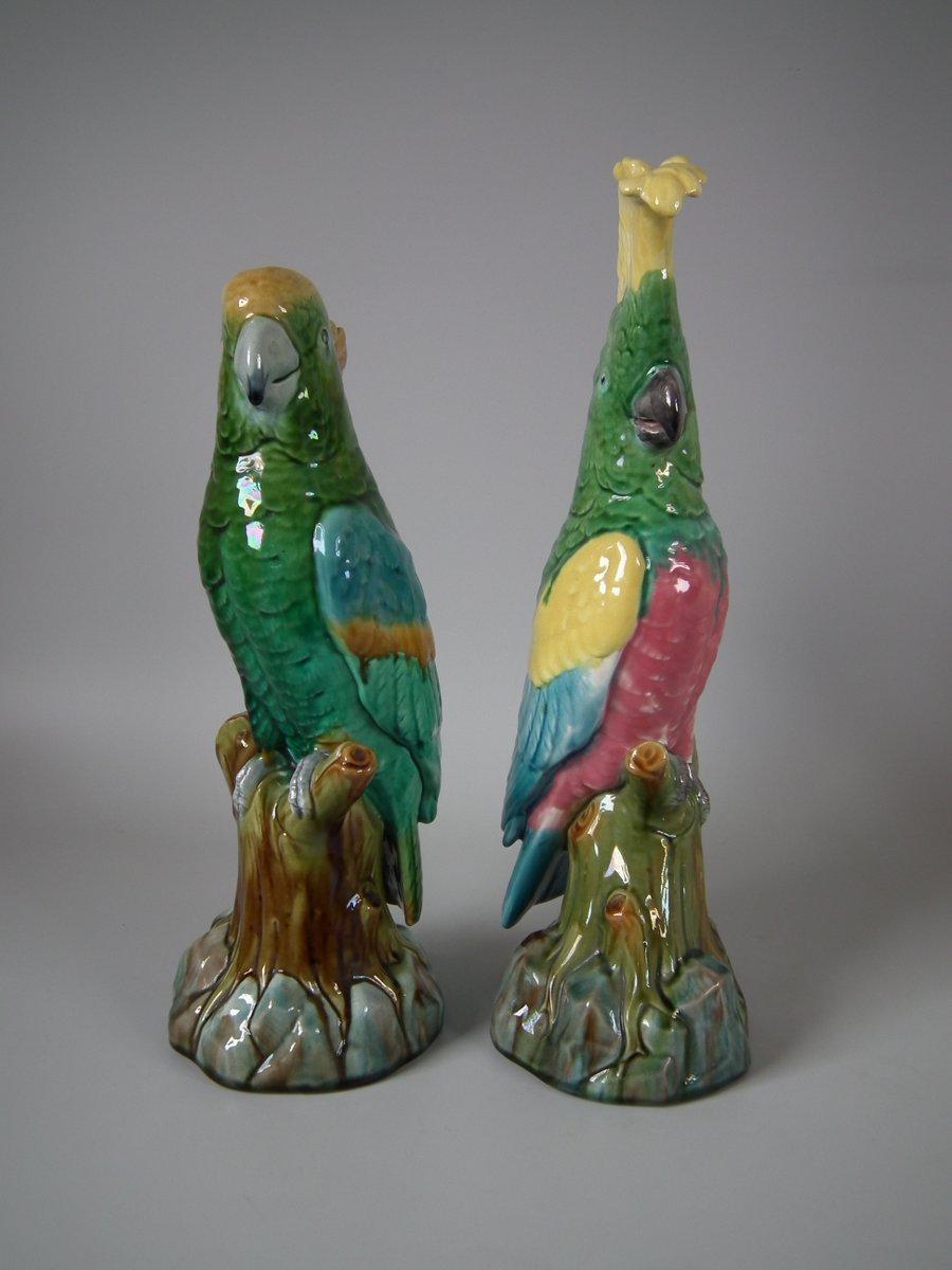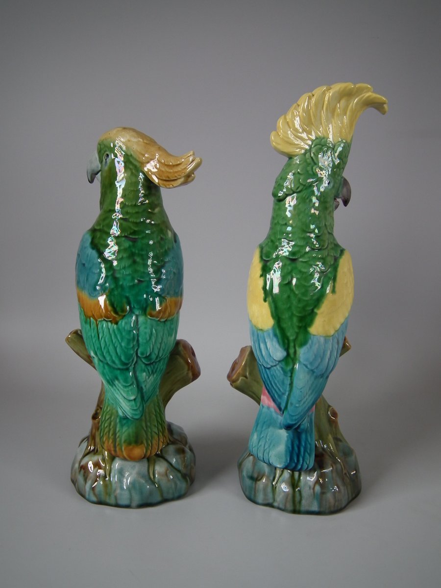 Pair of Mintons Majolica figures which feature cockatoos/parrots perched on a branch.