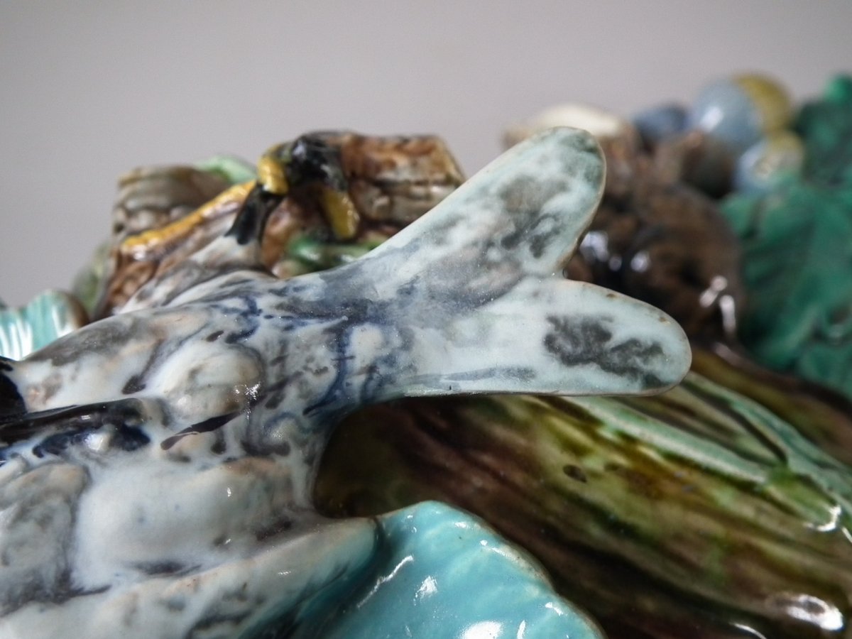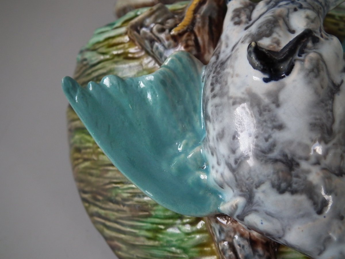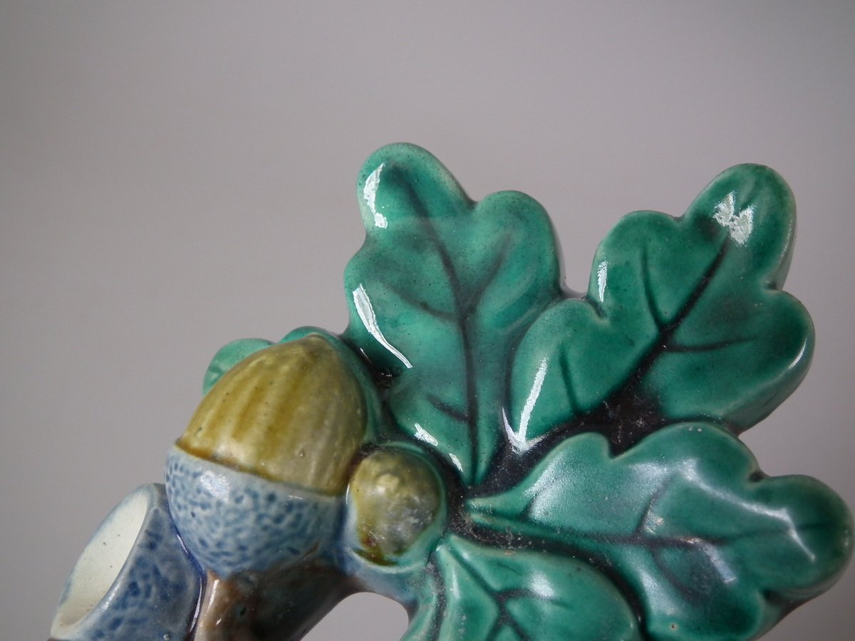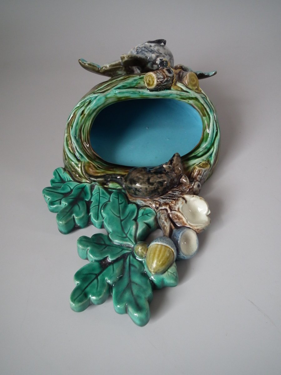 Victorian, circa 1876. 10.2ins high, 5.5ins wide, 3.9ins depth. Holdcroft Majolica wall pocket which features a bird and a mouse on a nest,