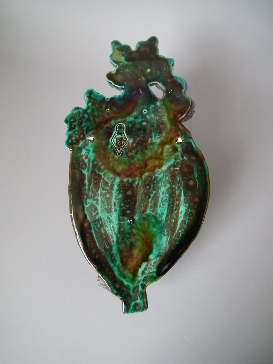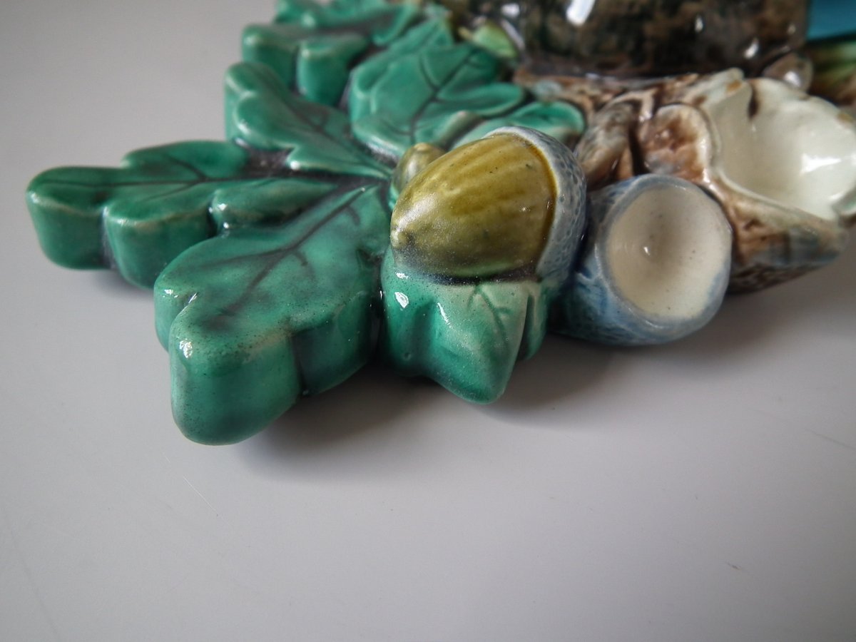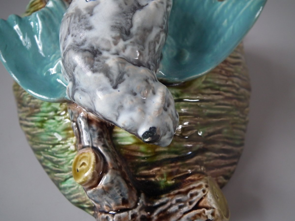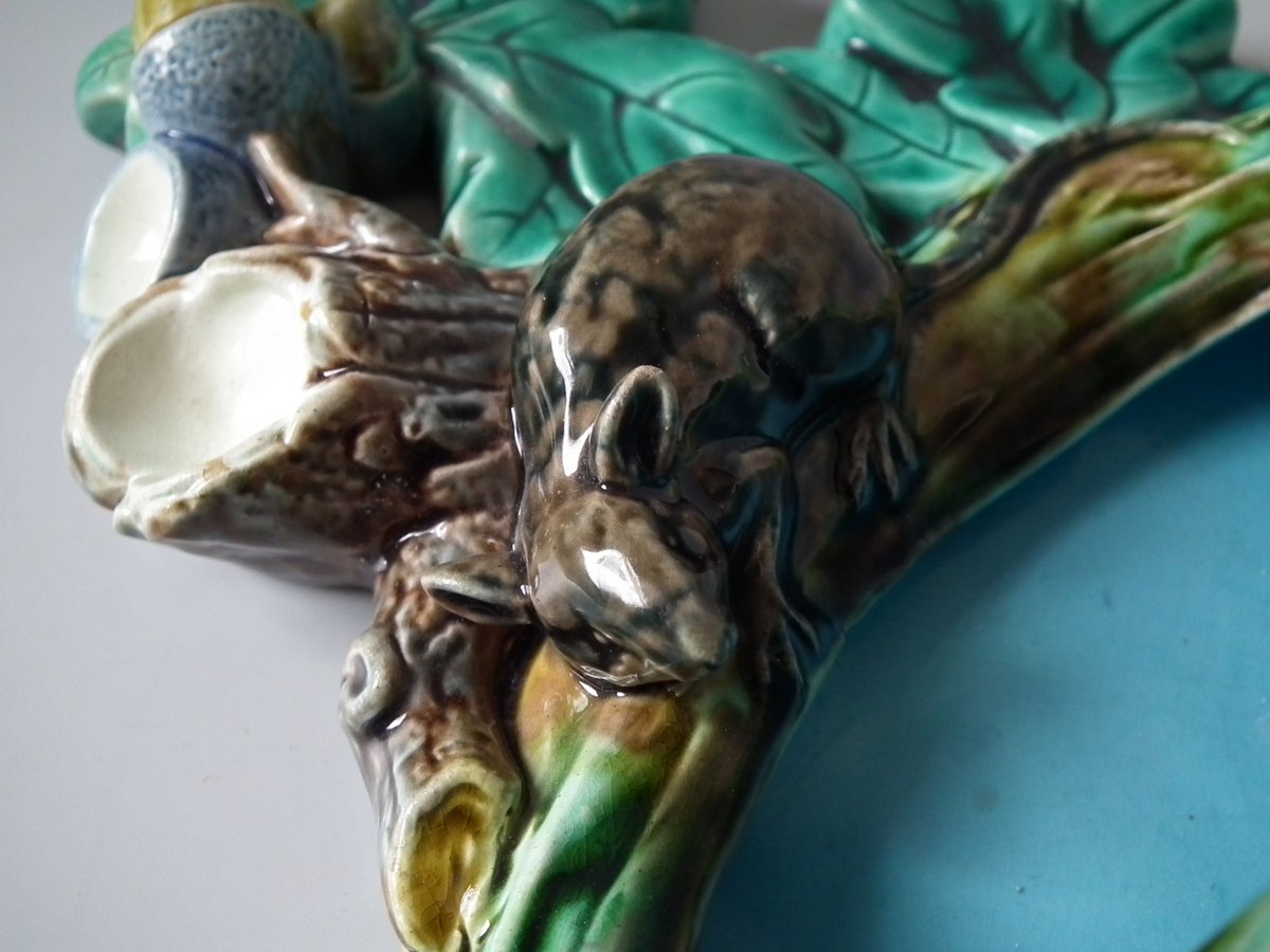 Victorian, circa 1876. 10.2ins high, 5.5ins wide, 3.9ins depth. Holdcroft Majolica wall pocket which features a bird and a mouse on a nest,