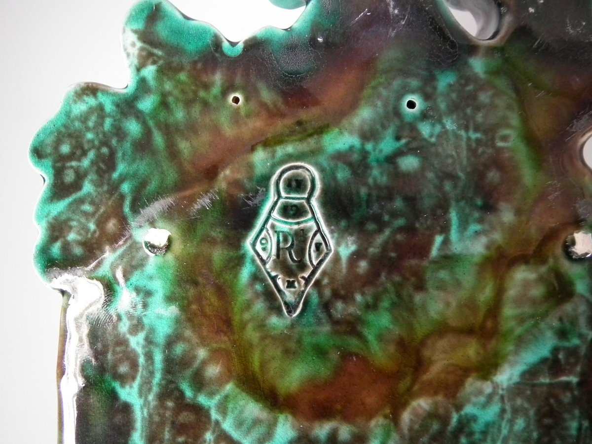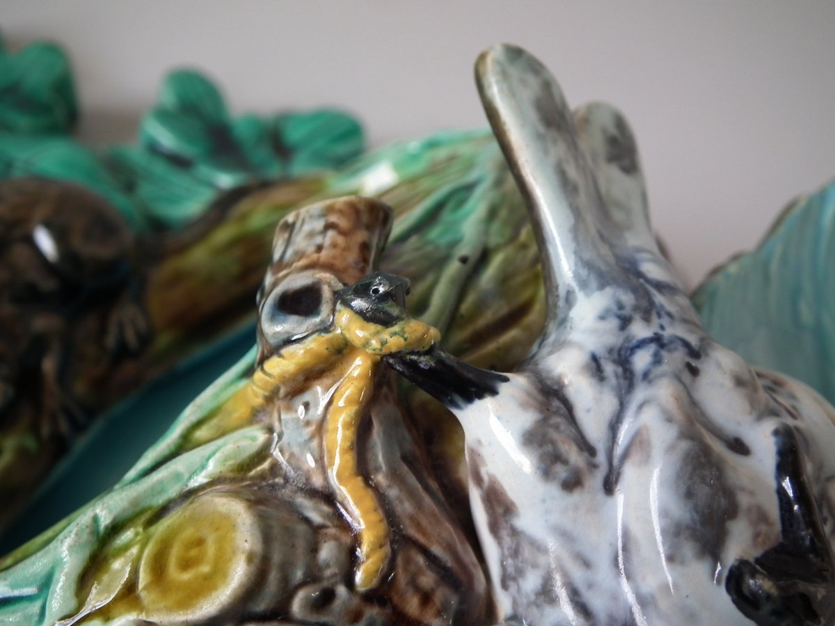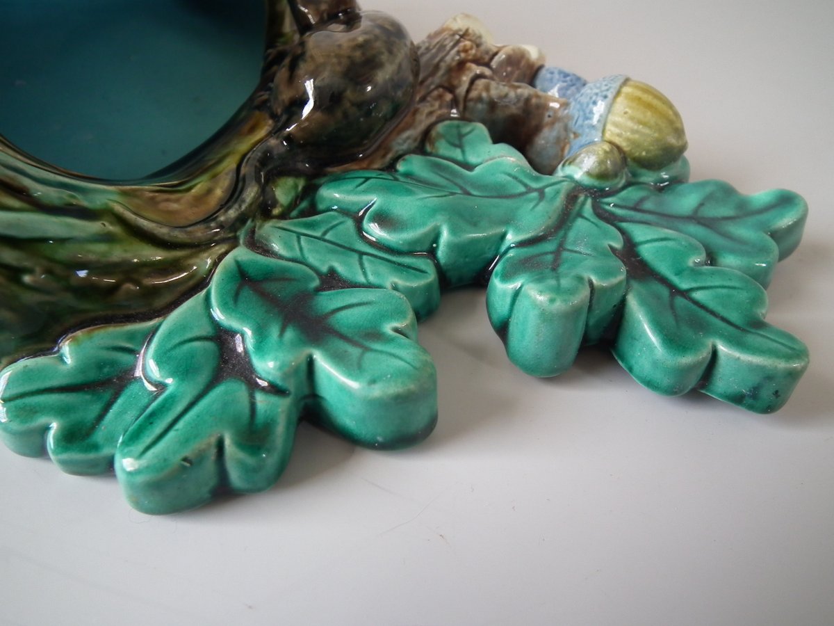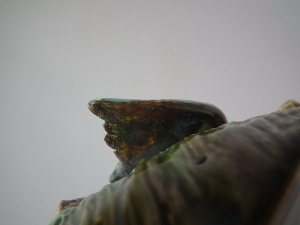 Victorian, circa 1876. 10.2ins high, 5.5ins wide, 3.9ins depth. Holdcroft Majolica wall pocket which features a bird and a mouse on a nest,