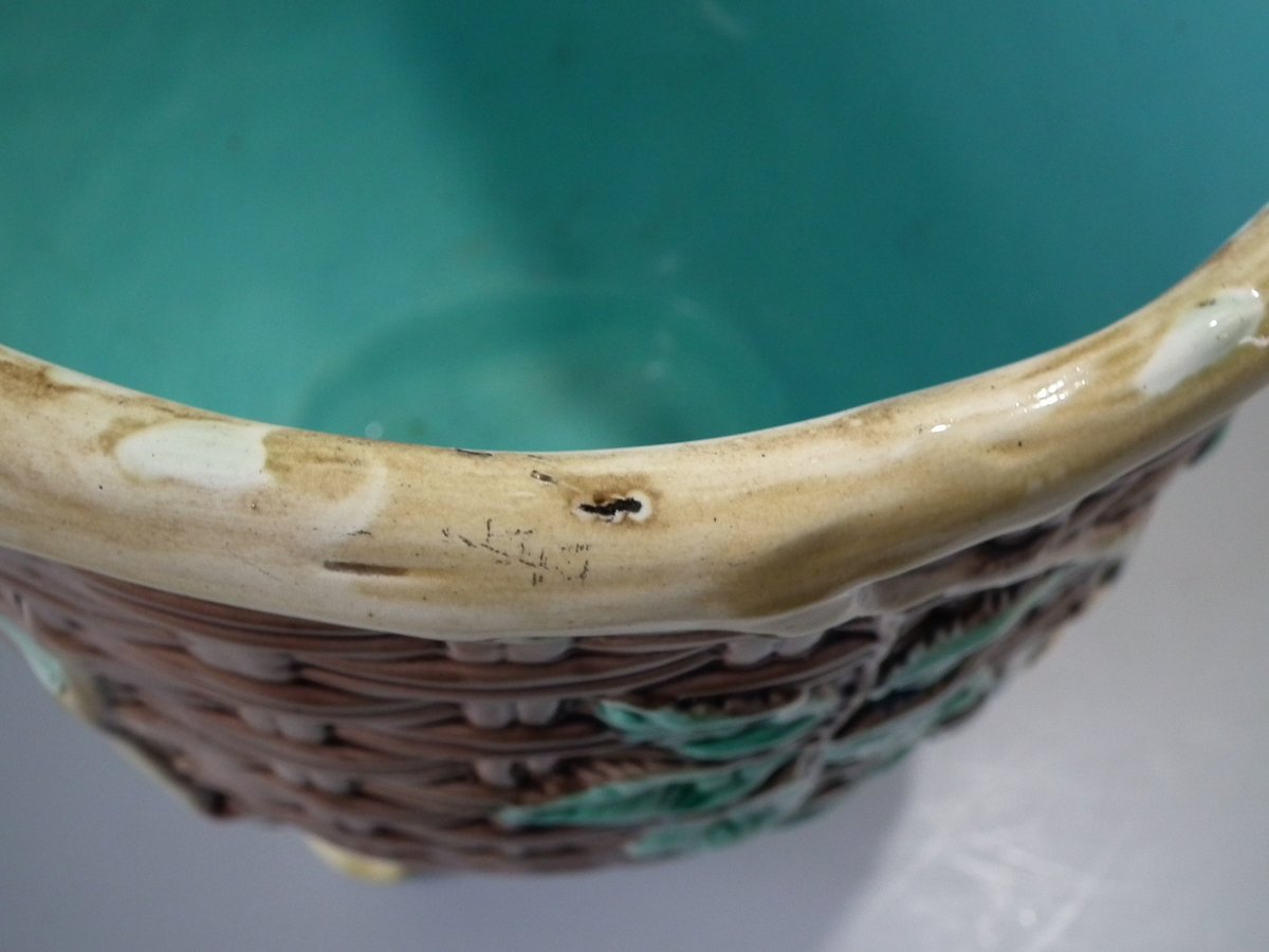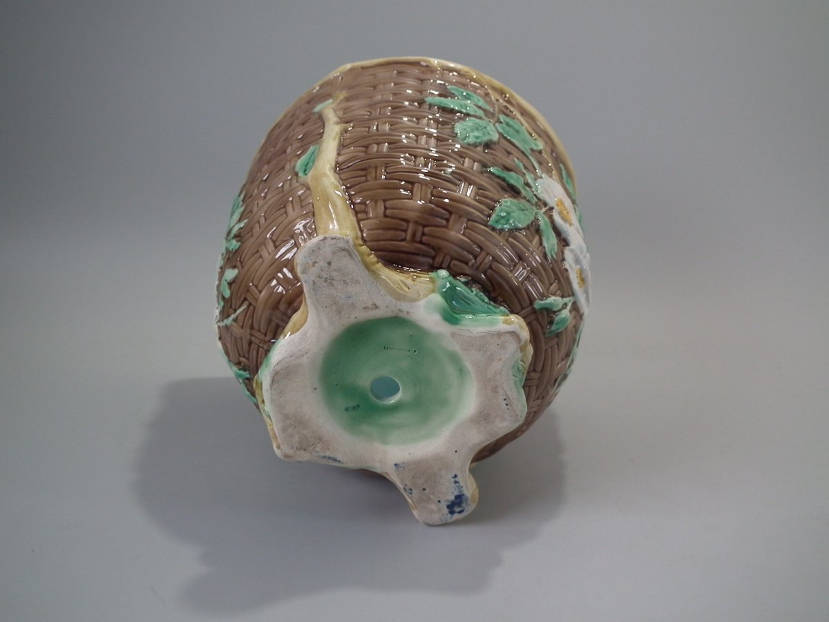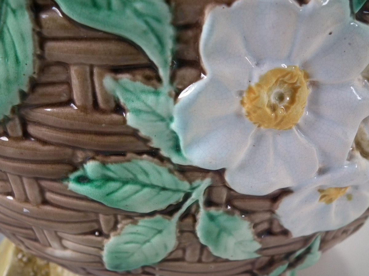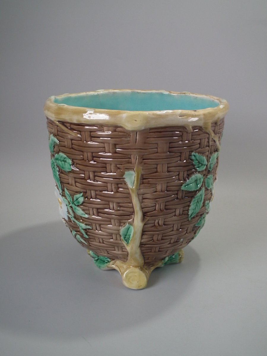 Victorian, circa 1875. 8.9ins high, 8.9ins wide, 8.9ins depth. Holdcroft Majolica jardinière which features a basket weave exterior