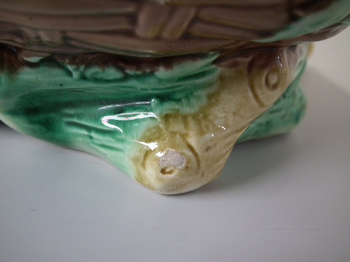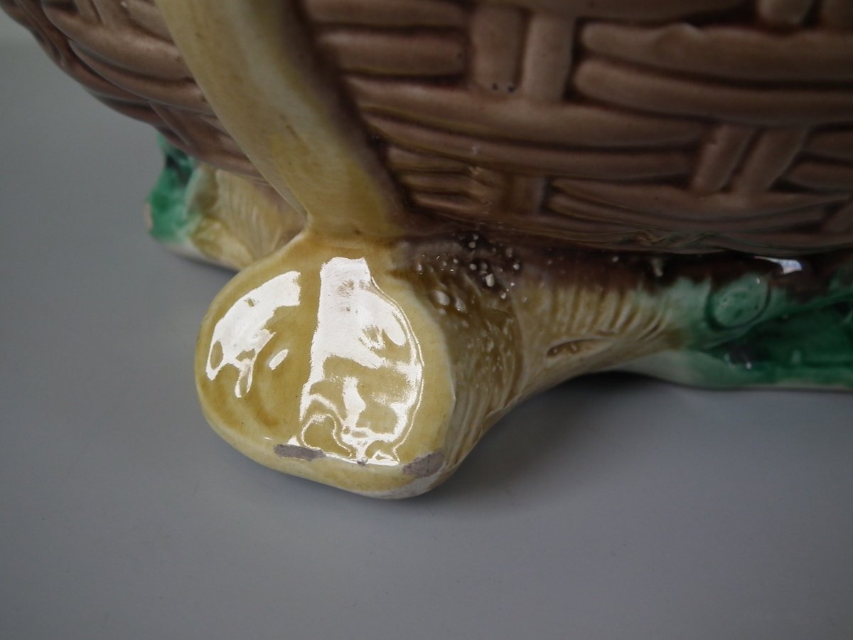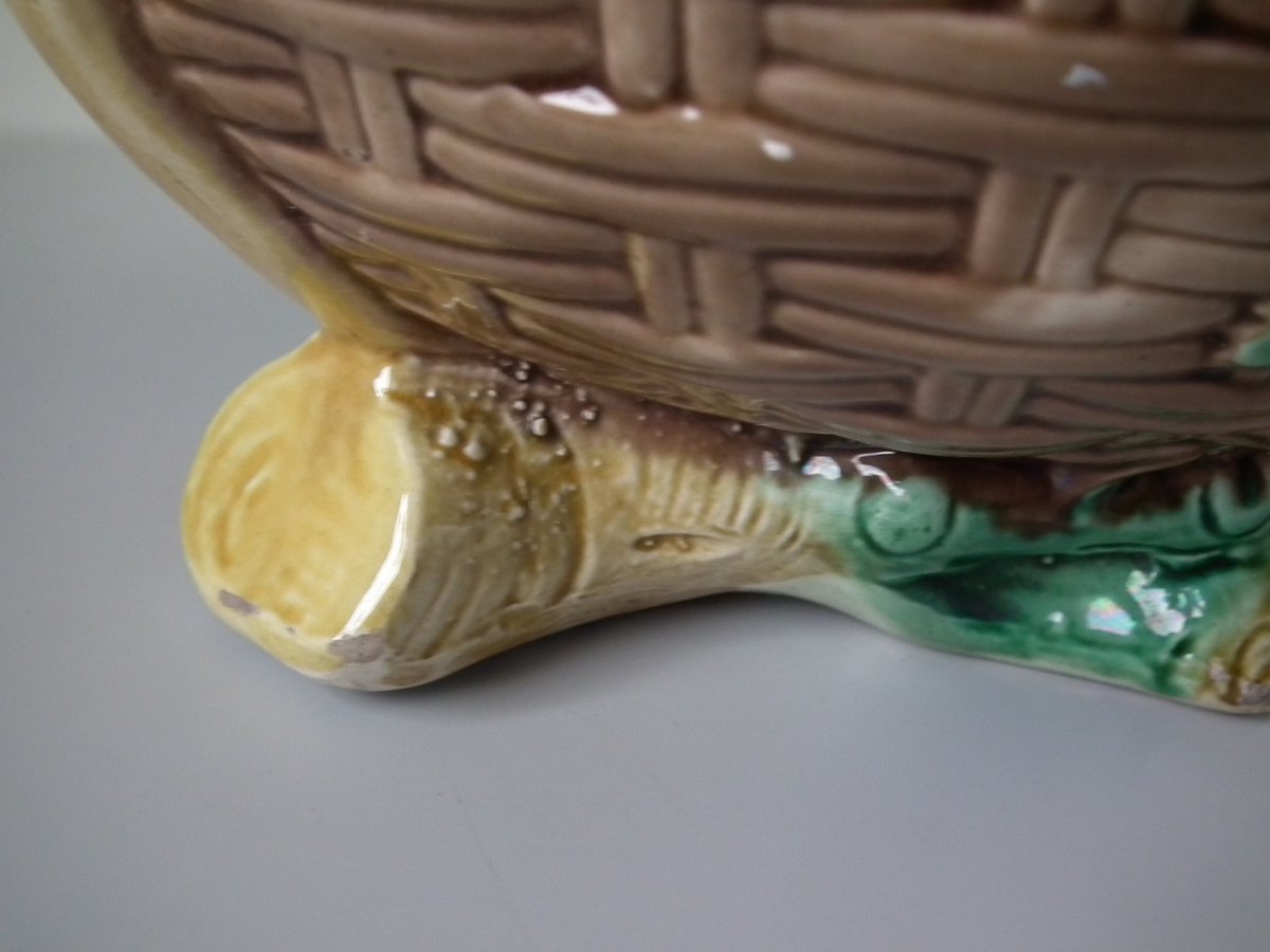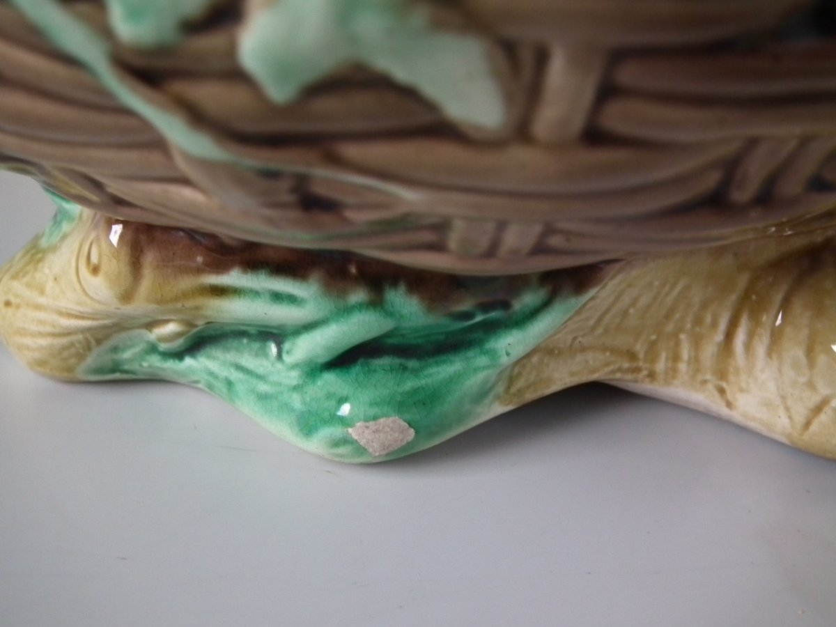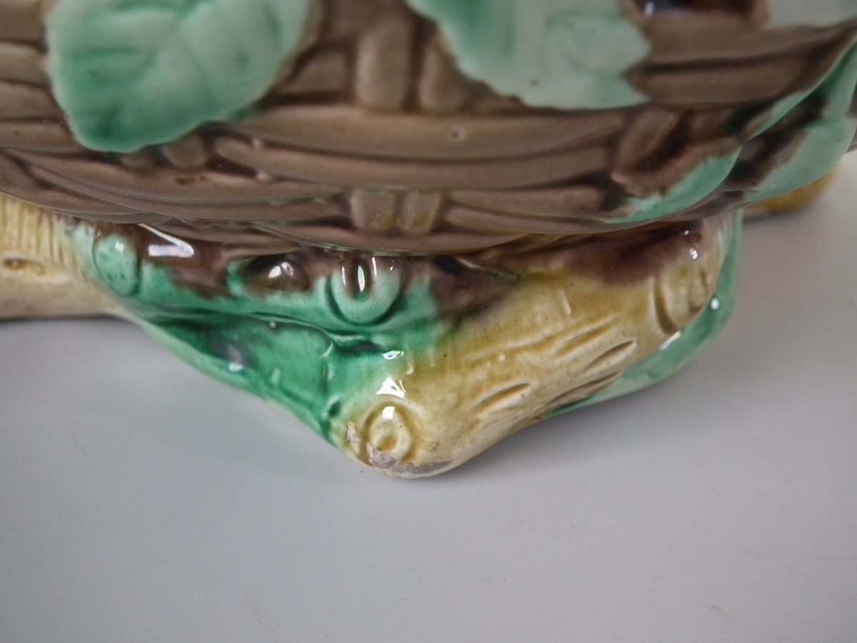 Victorian, circa 1875. 8.9ins high, 8.9ins wide, 8.9ins depth. Holdcroft Majolica jardinière which features a basket weave exterior