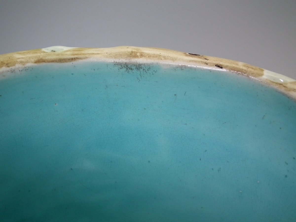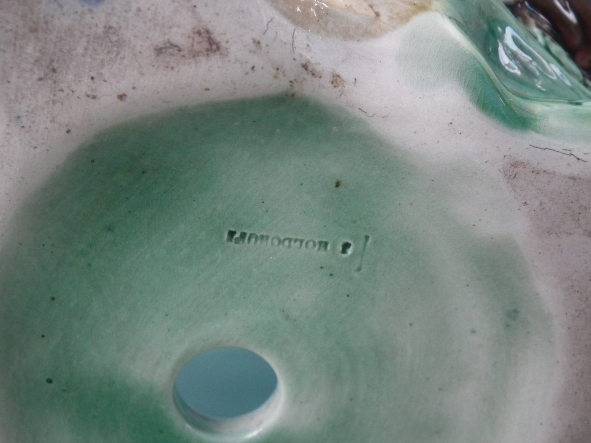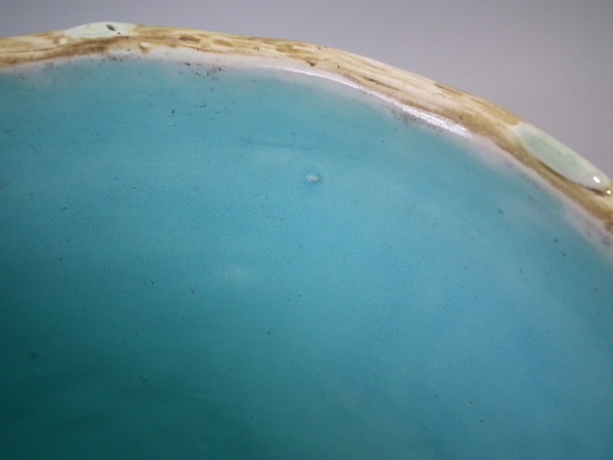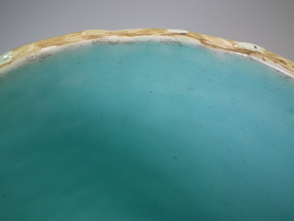 Victorian, circa 1875. 8.9ins high, 8.9ins wide, 8.9ins depth. Holdcroft Majolica jardinière which features a basket weave exterior