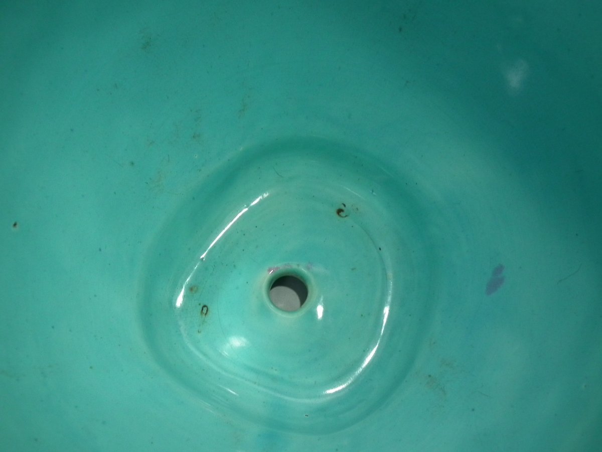 KILN EFFECTS: kiln detritus caught in the glaze to the feet and interior.