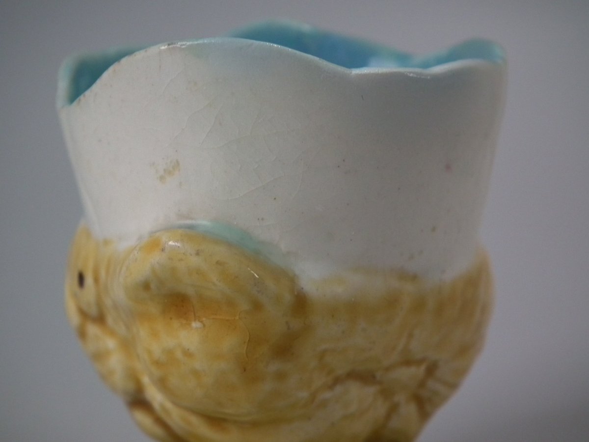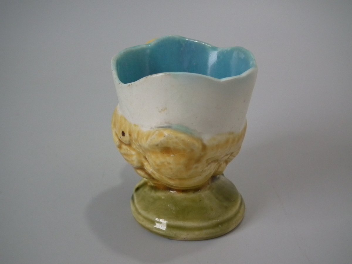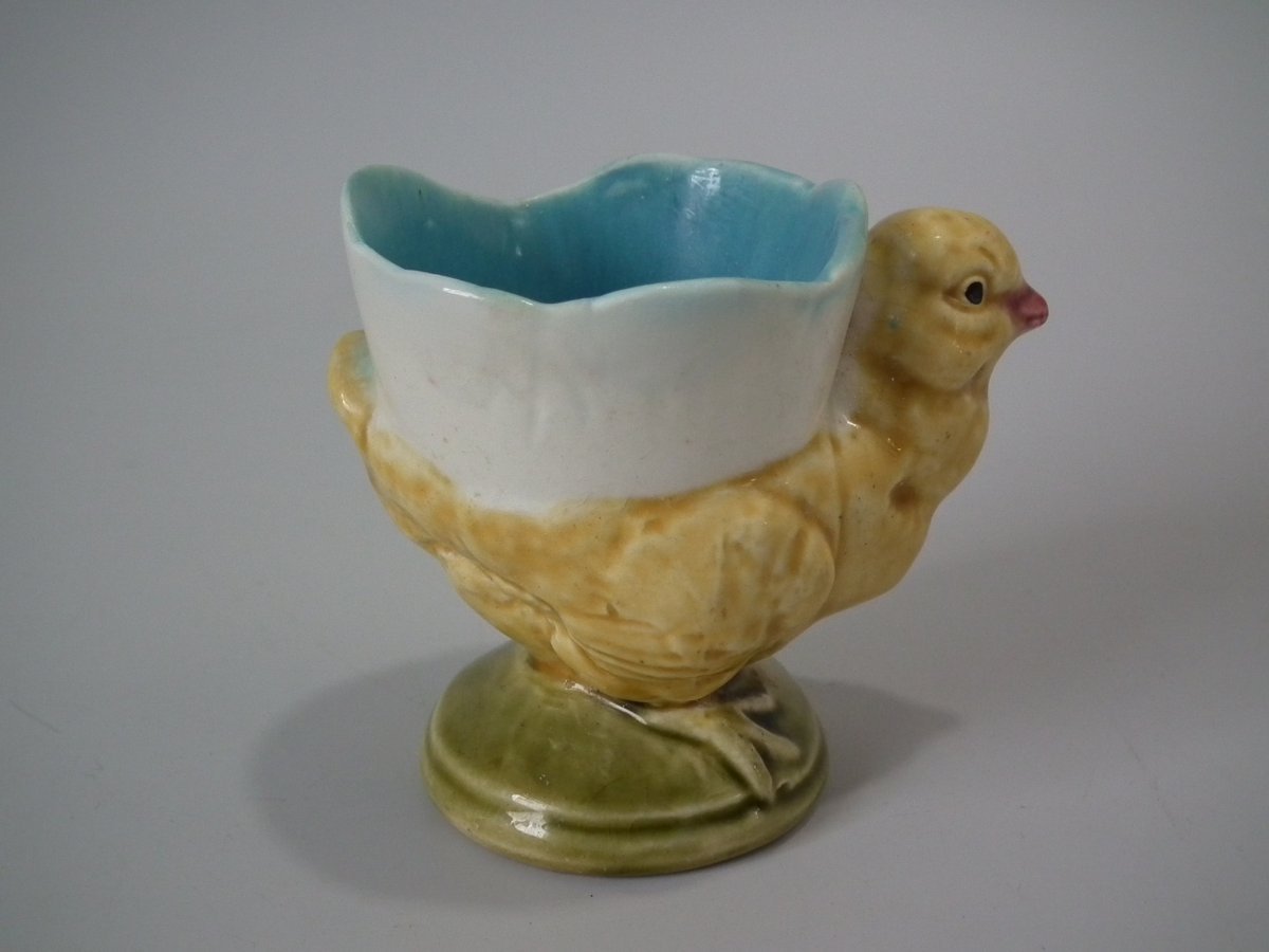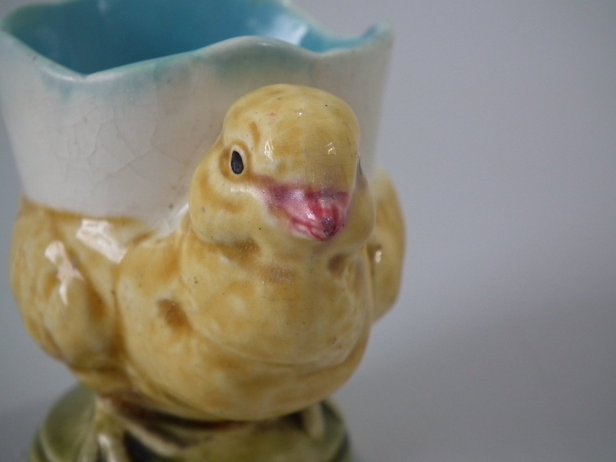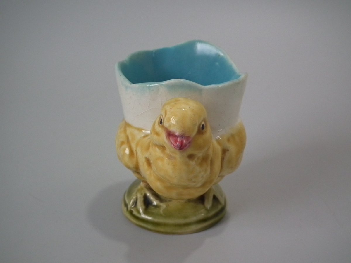 Circa 1880. 2.6ins high, 3ins wide, 2.2ins depth. George Dreyfus Majolica egg cup holder which features a chick with an egg shell on its back.