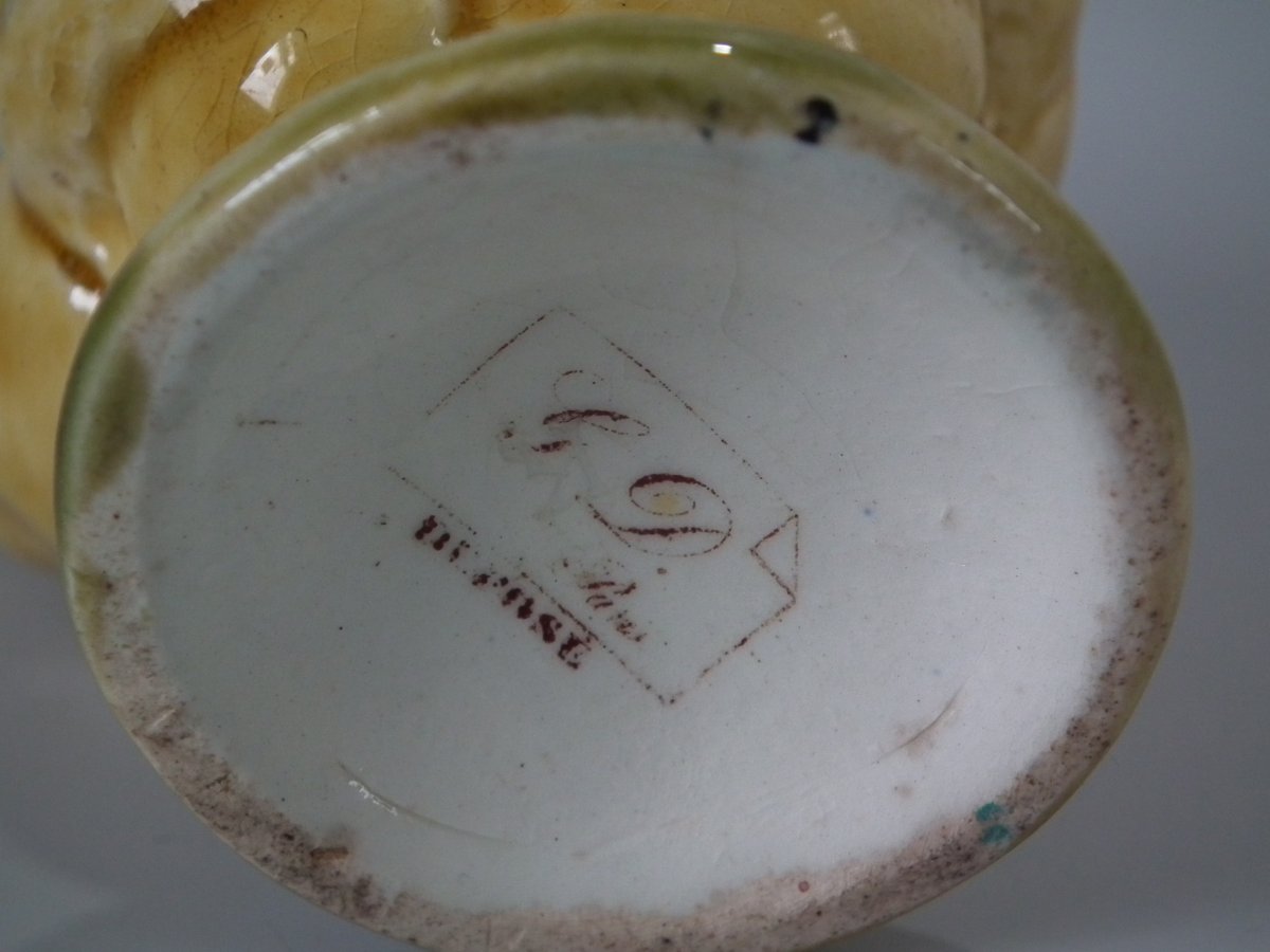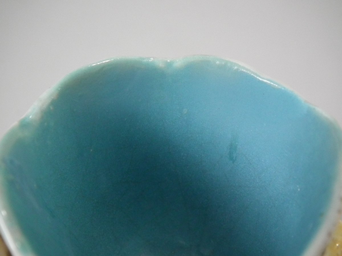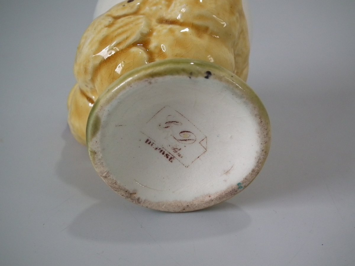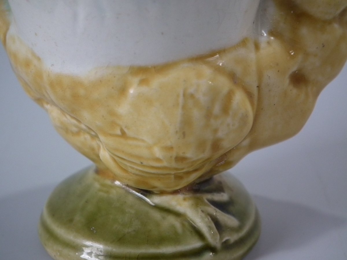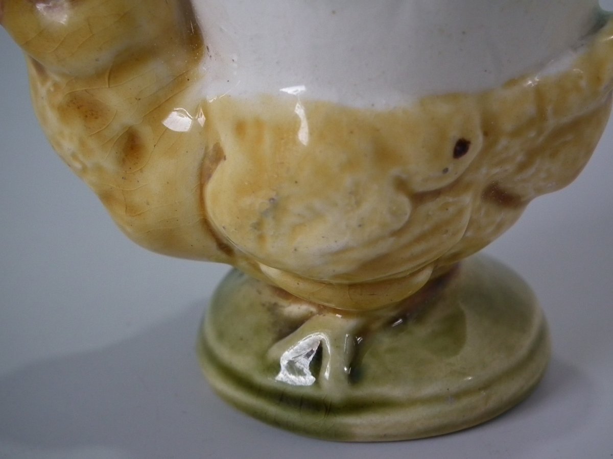 Circa 1880. 2.6ins high, 3ins wide, 2.2ins depth. George Dreyfus Majolica egg cup holder which features a chick with an egg shell on its back.