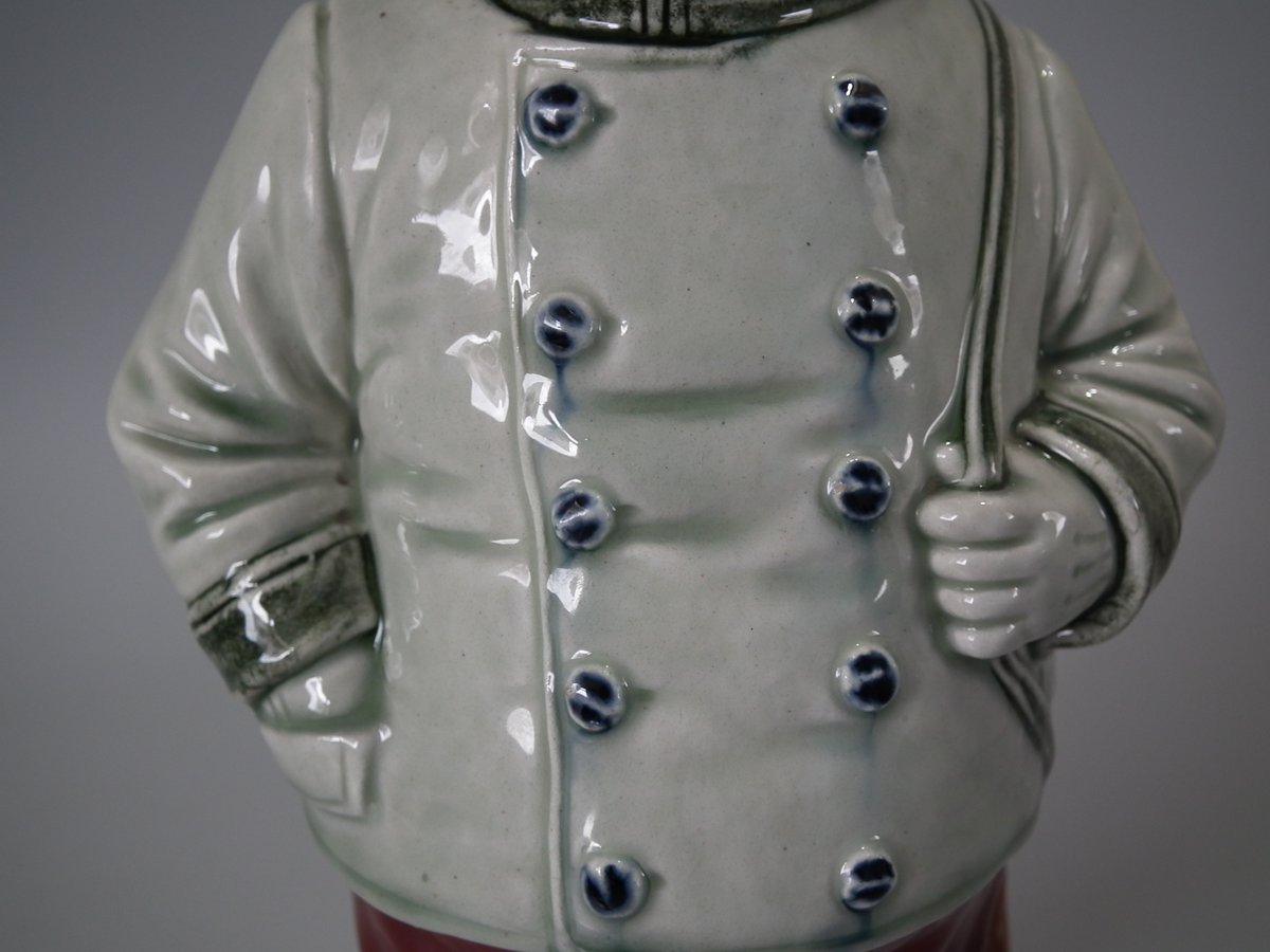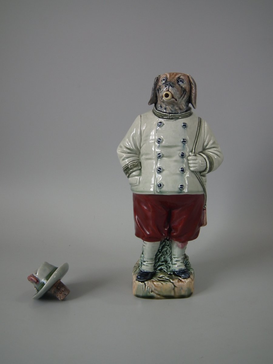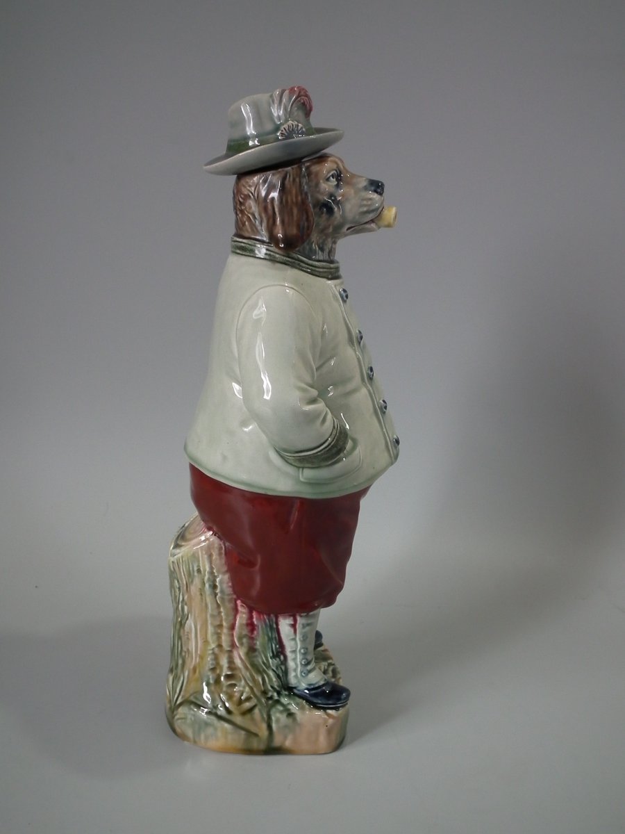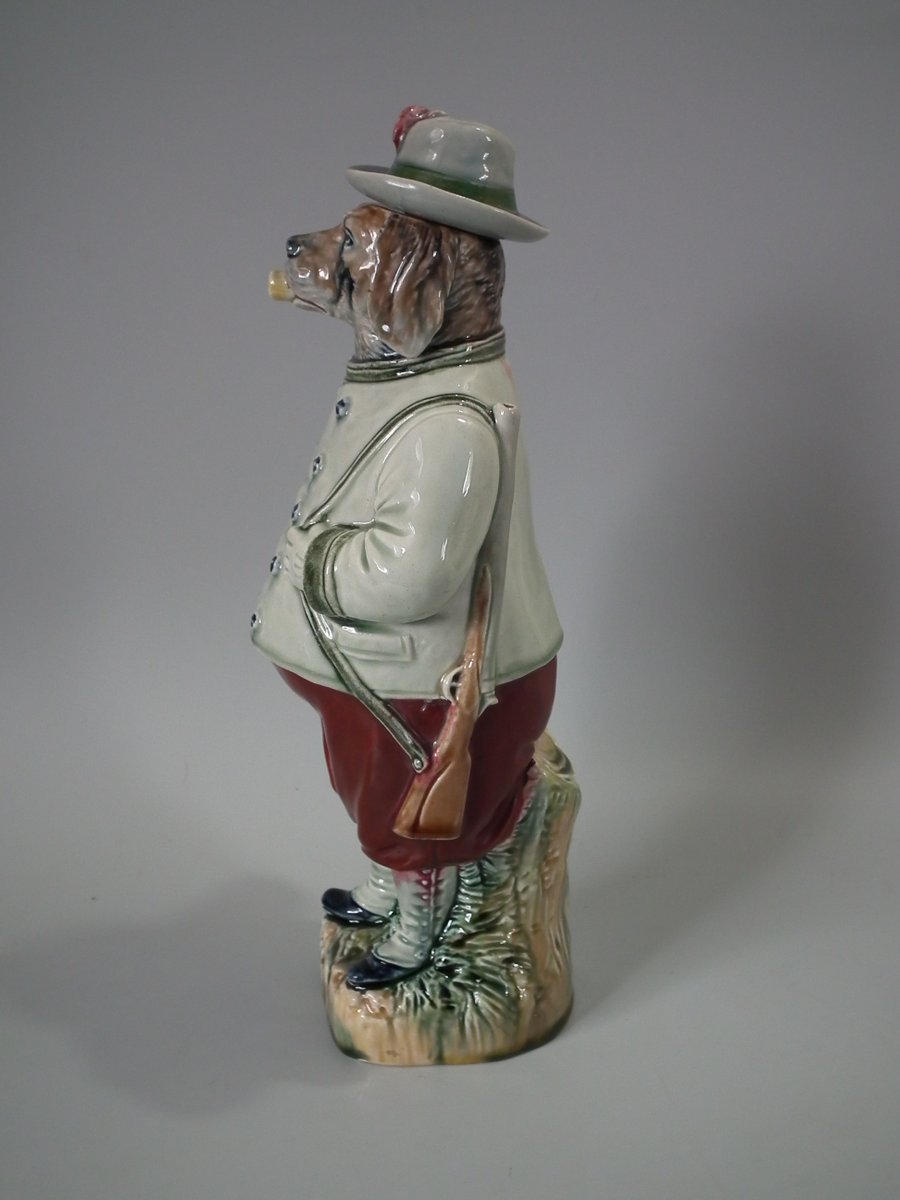 Circa 1890. 12.4ins high, 5.3ins wide, 4.3ins depth. B & L Majolica figural bottle which features a dog in hunting attire, carrying a rifle and smoking a pipe.