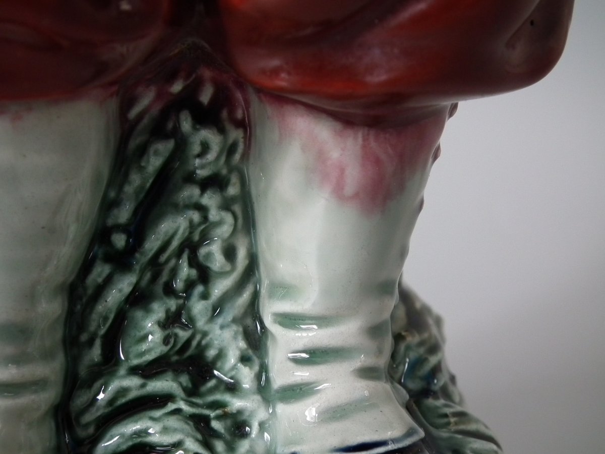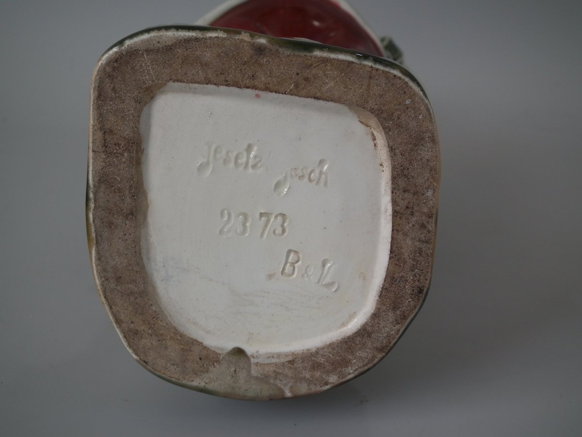 The pipe forms a pouring spout. The dog's hat forms the lid. Colouration: brown, red, grey, are predominant.