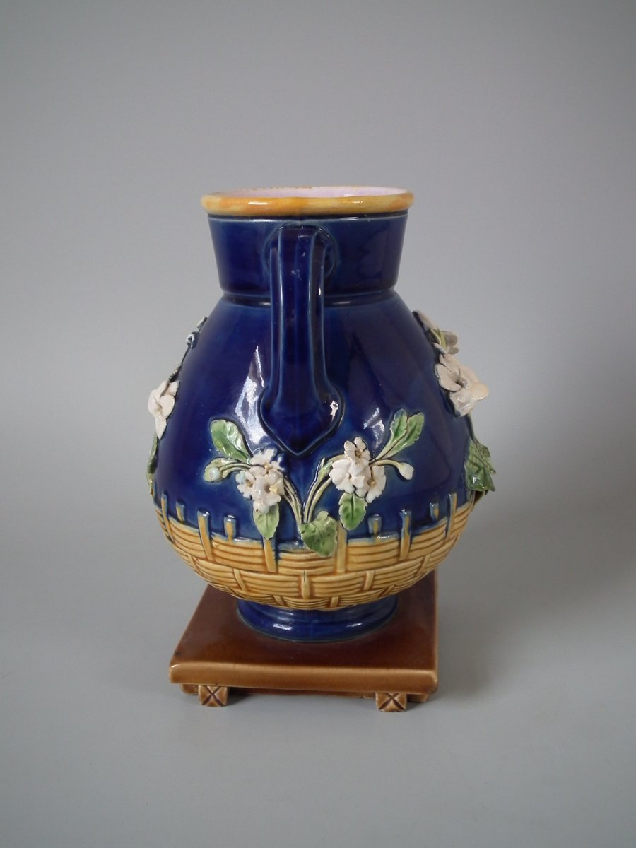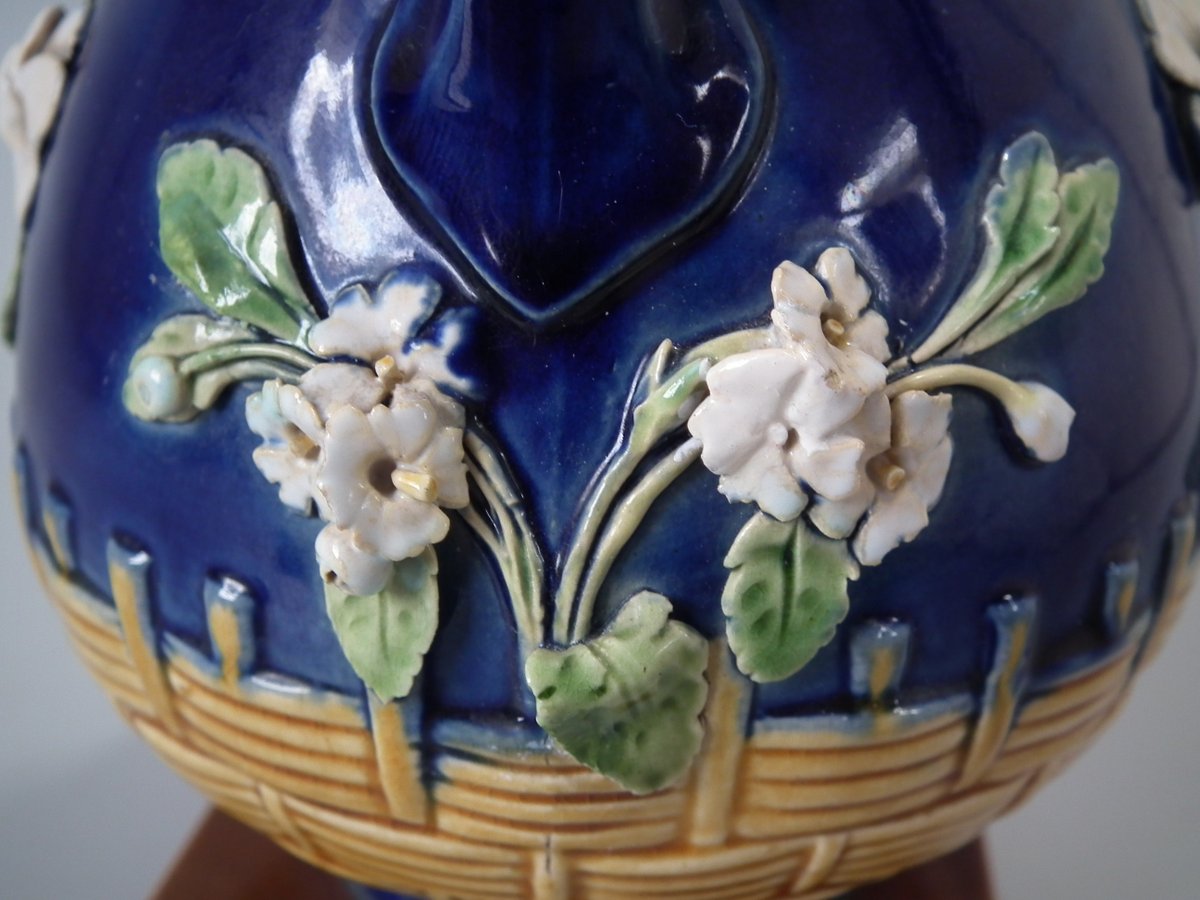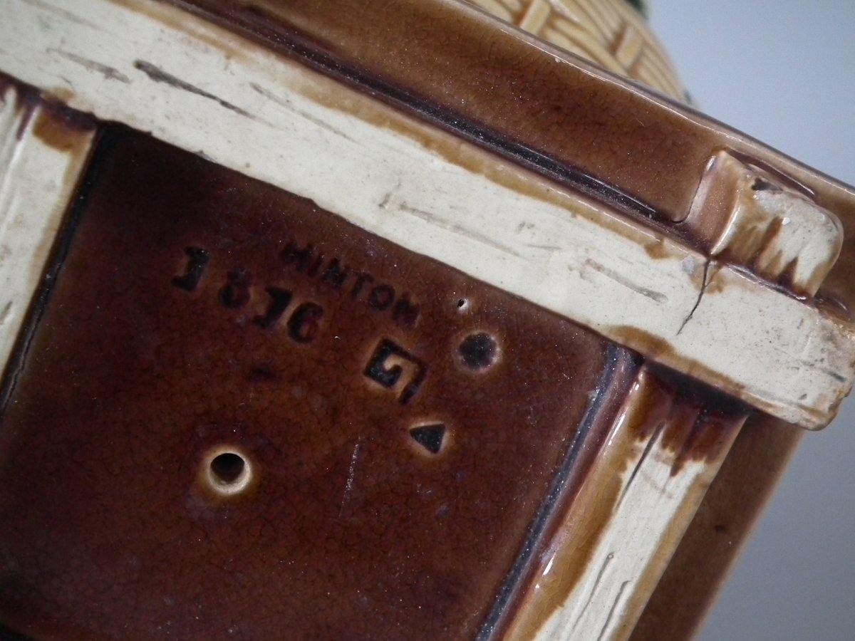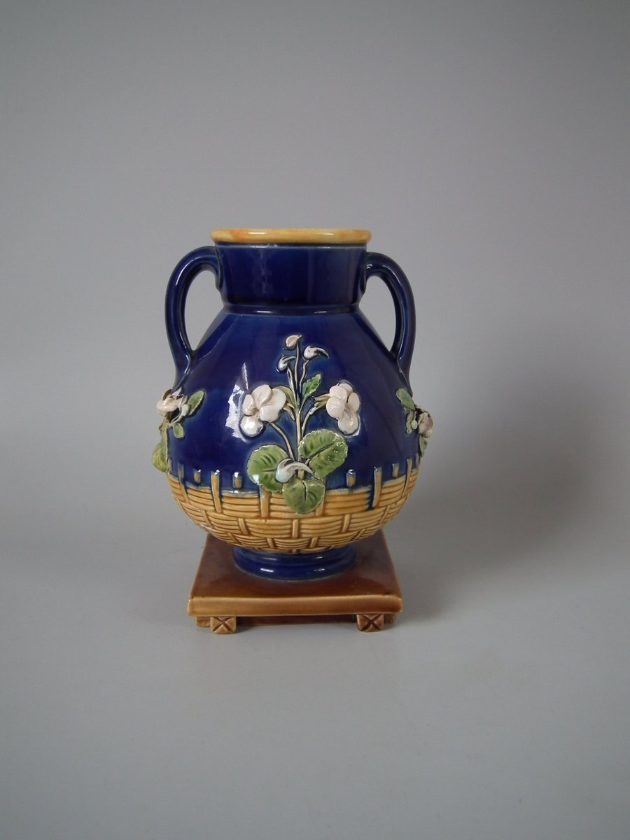 Victorian, circa 1869. 6.7ins high, 4.7ins wide, 4.7ins depth. Minton Majolica vase which features flowers above a basket weave trellis.