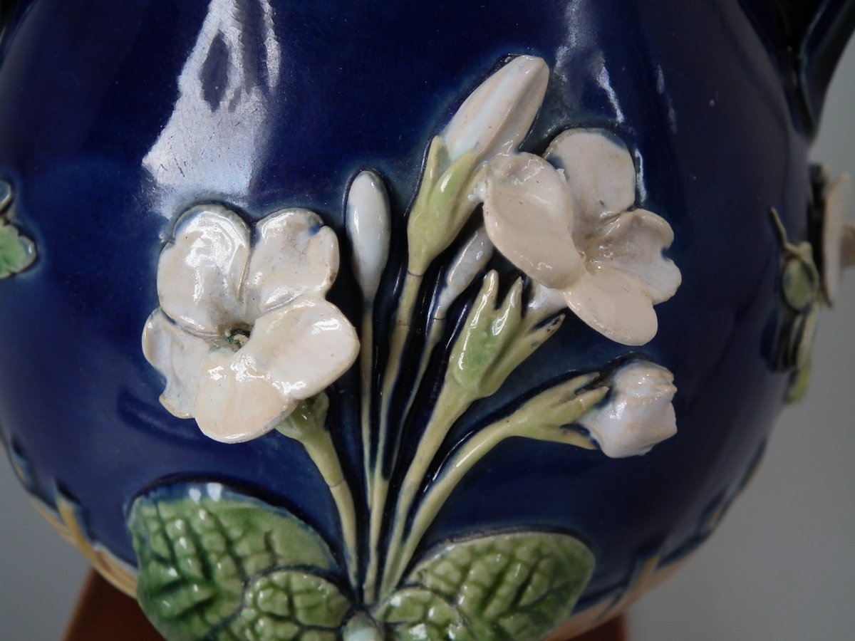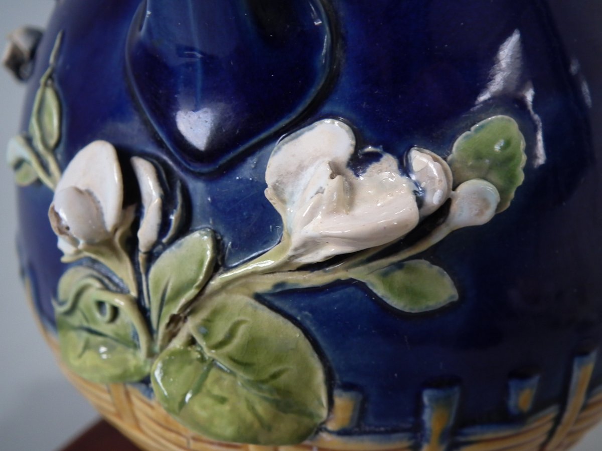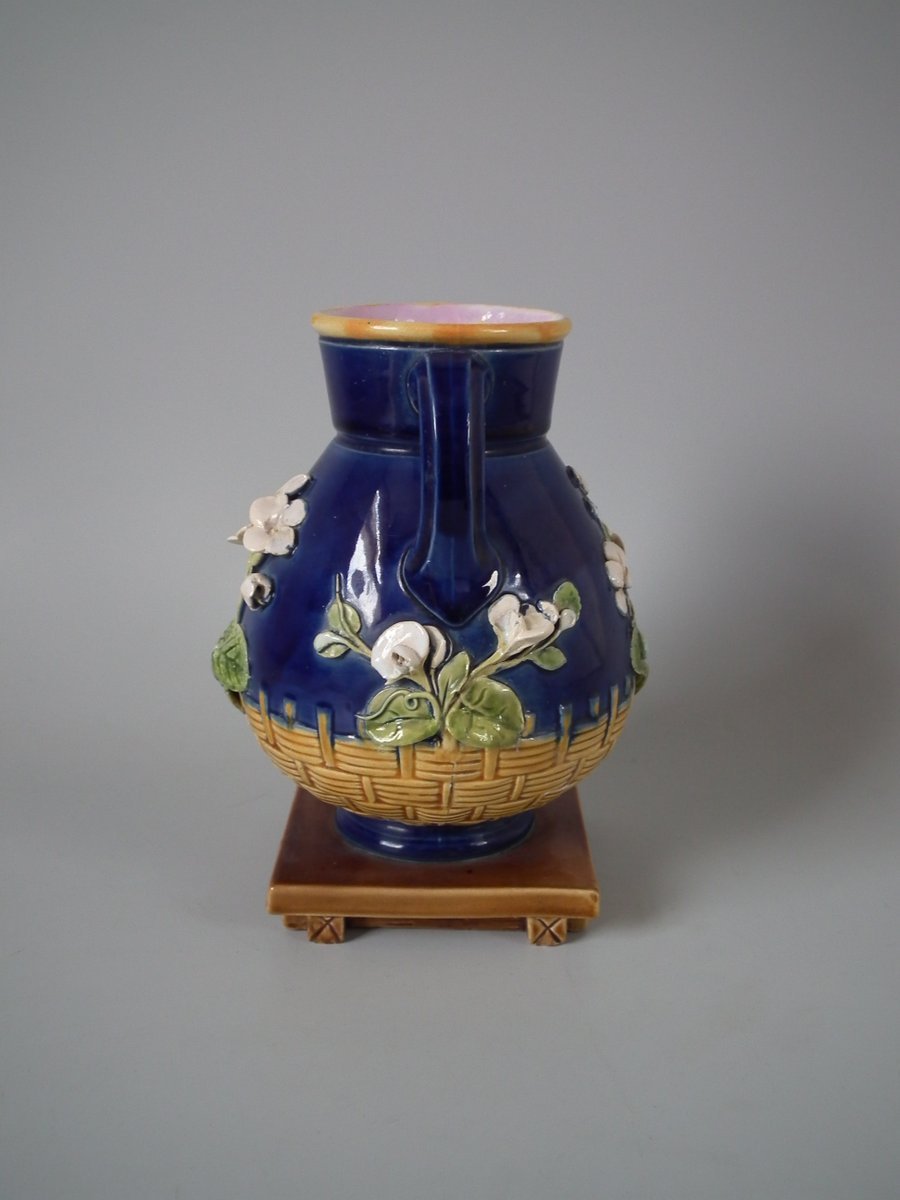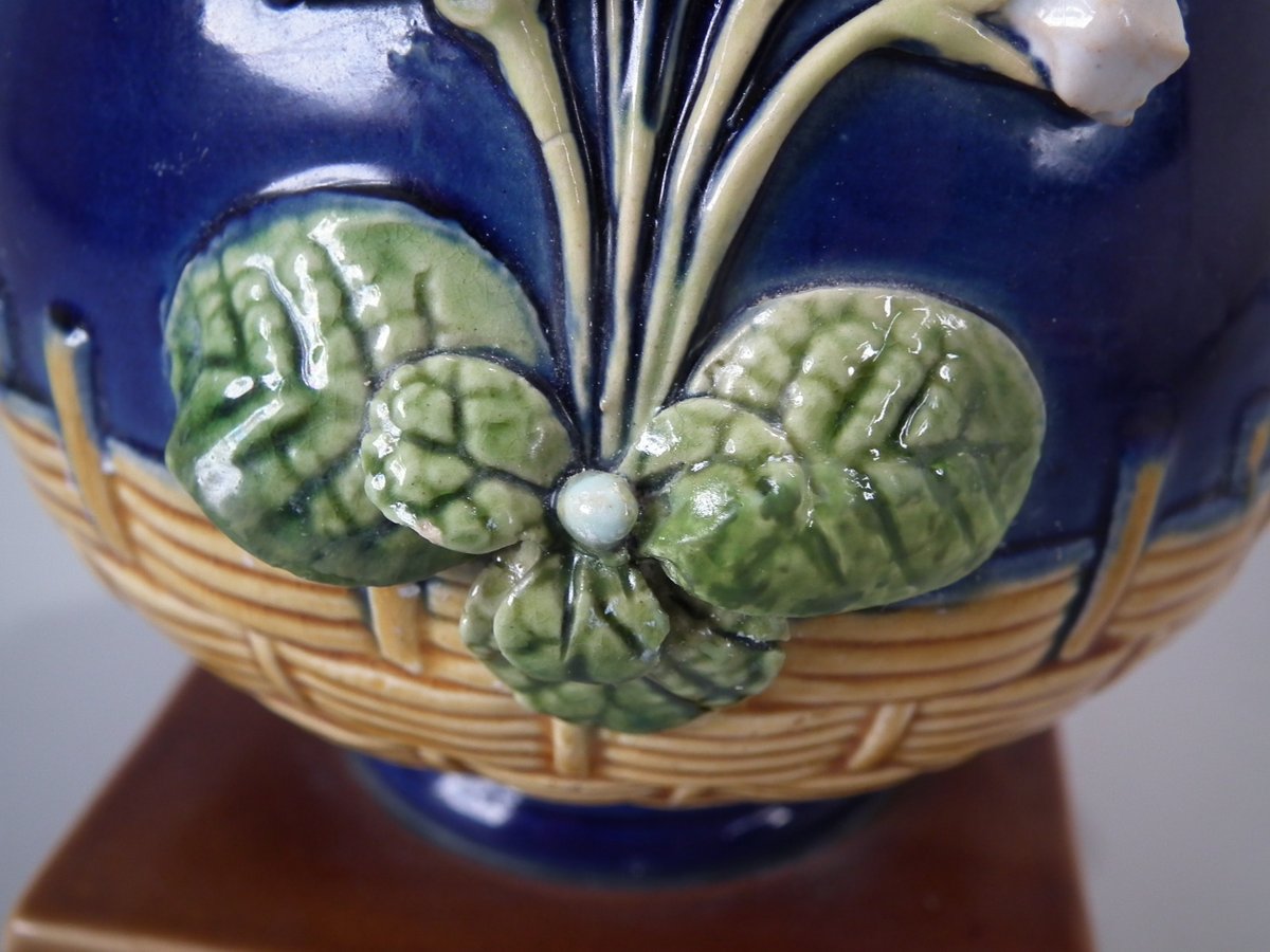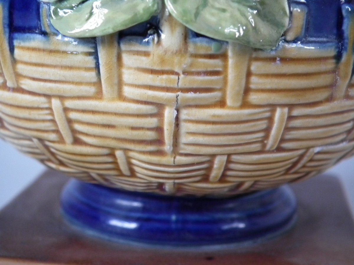Victorian, circa 1869. 6.7ins high, 4.7ins wide, 4.7ins depth. Minton Majolica vase which features flowers above a basket weave trellis.