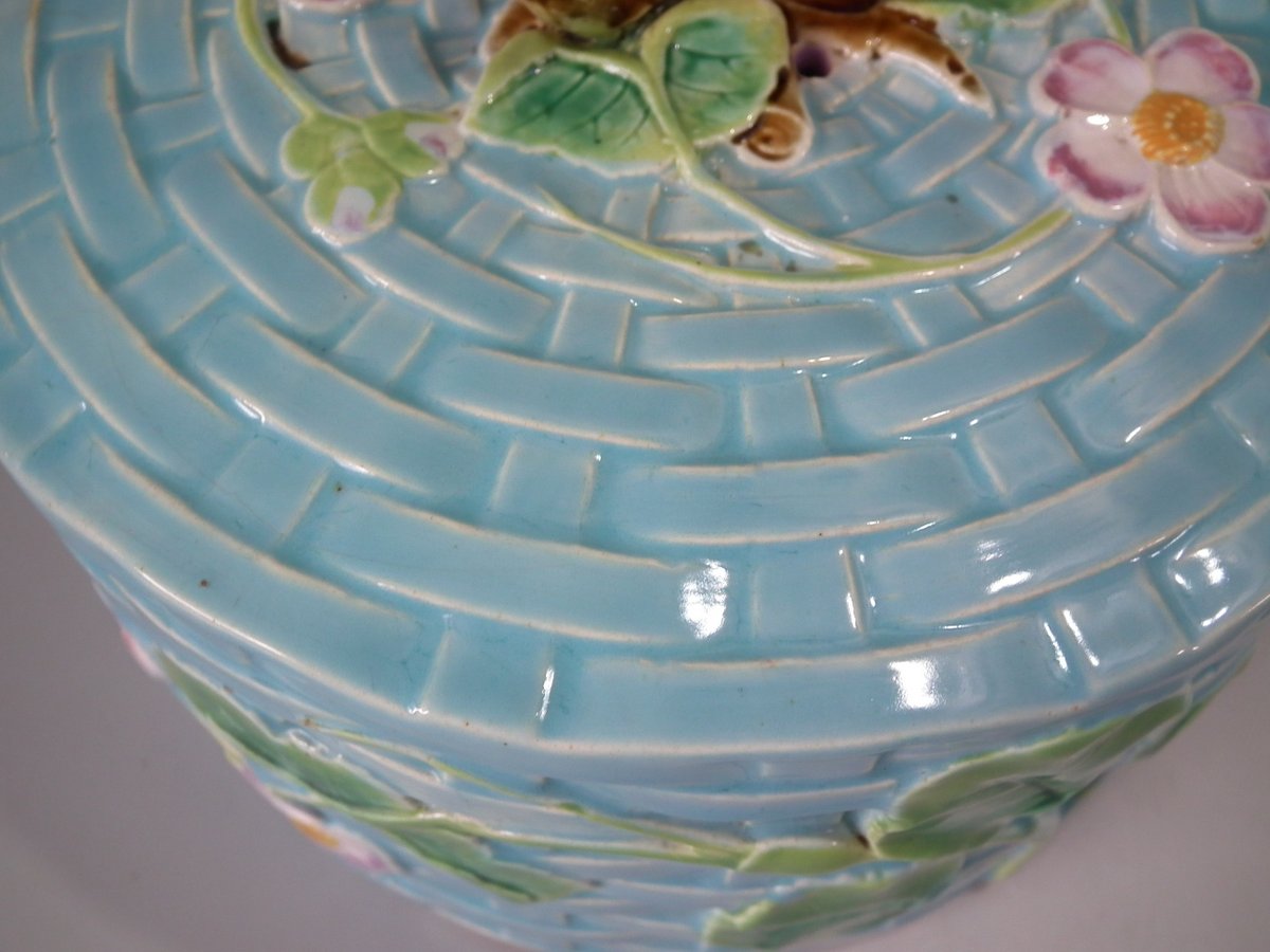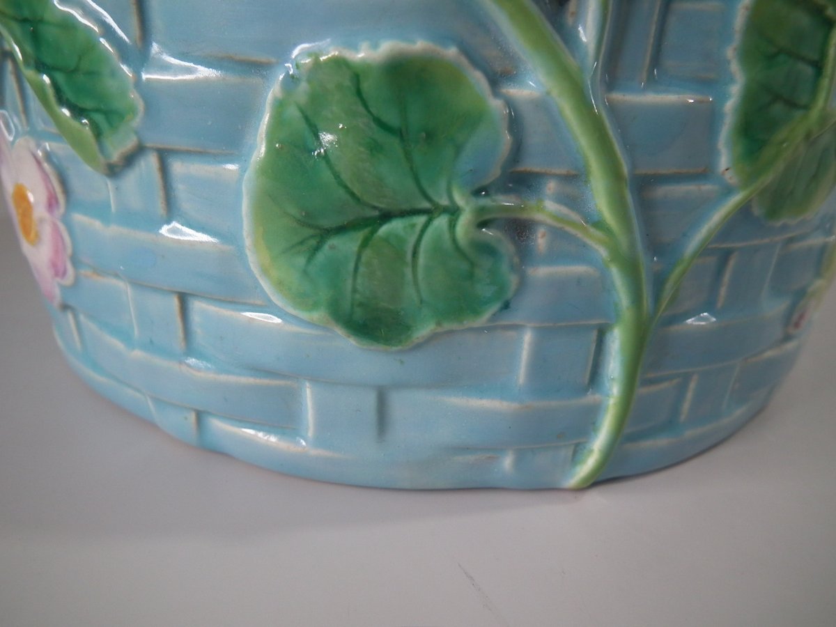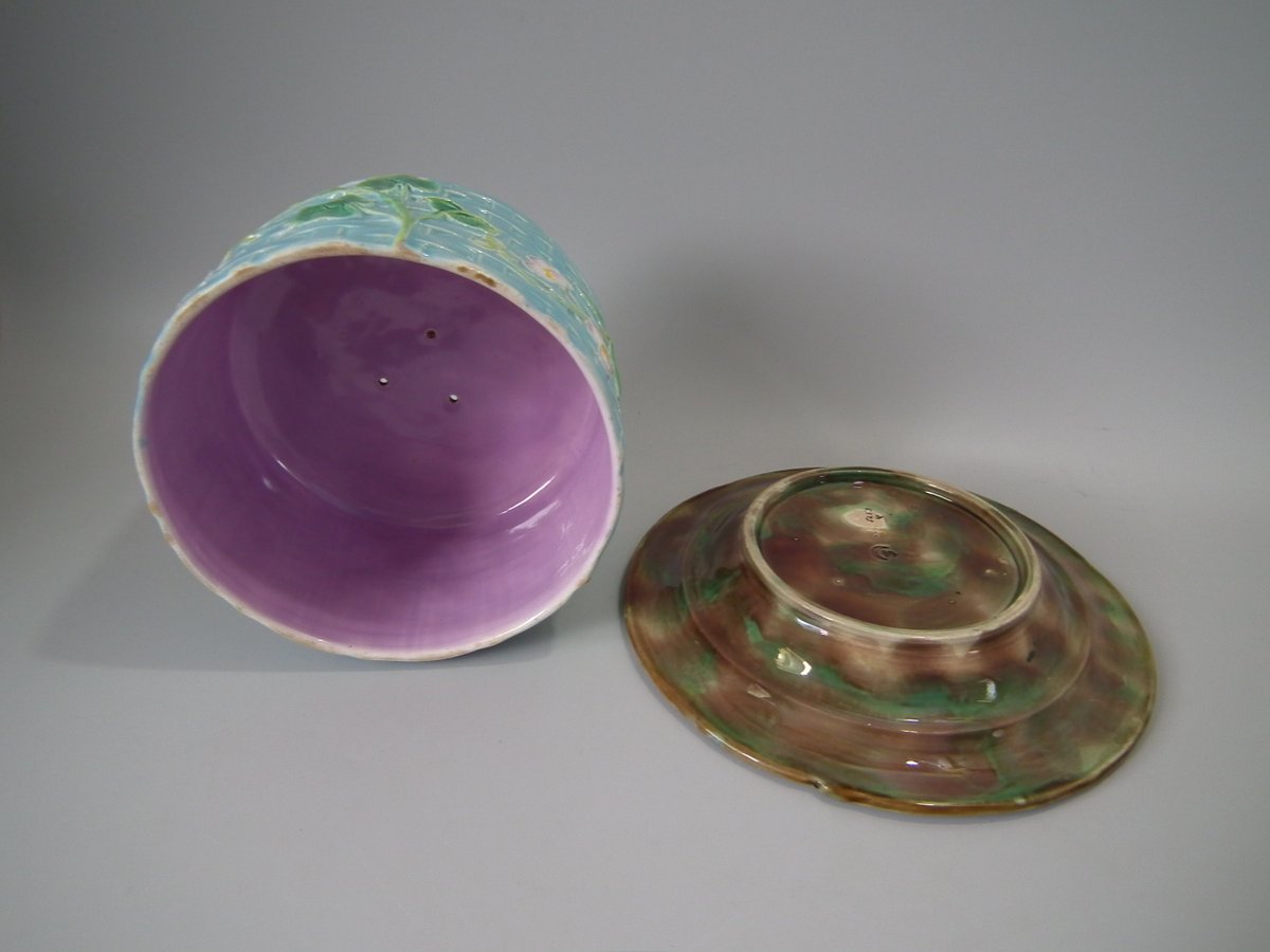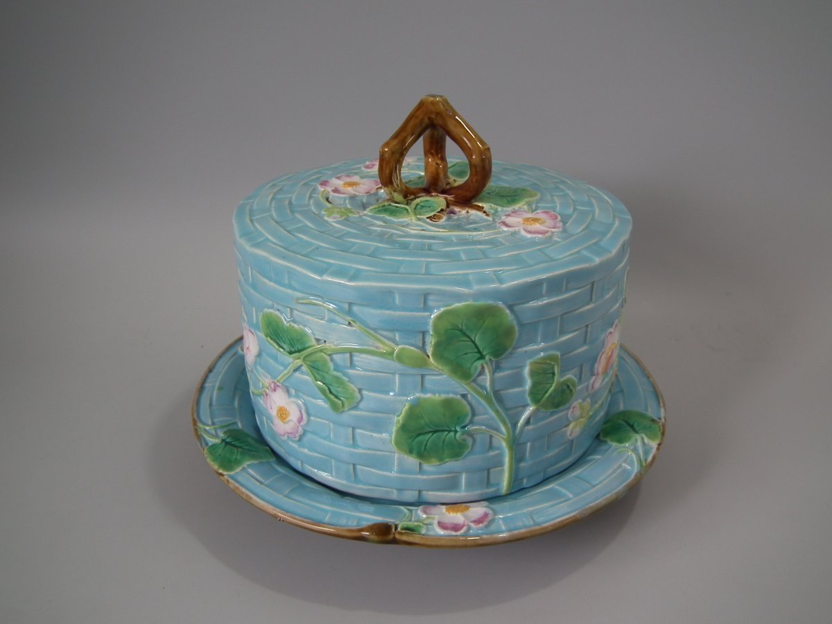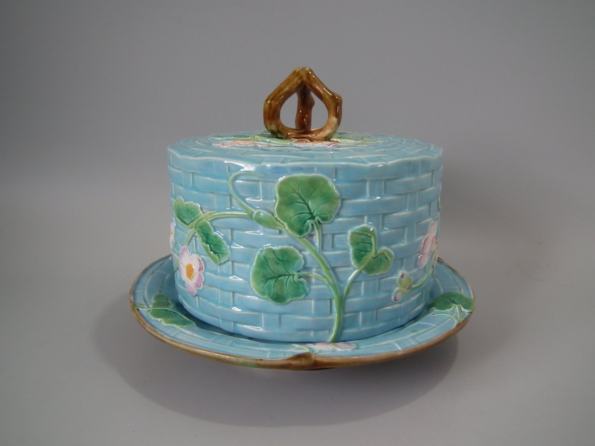 Victorian, circa 1880. 7.9ins high, 10.2ins wide, 10.2ins depth. George Jones & Sons Majolica cheese keep which features pansy leaves and flowers.
