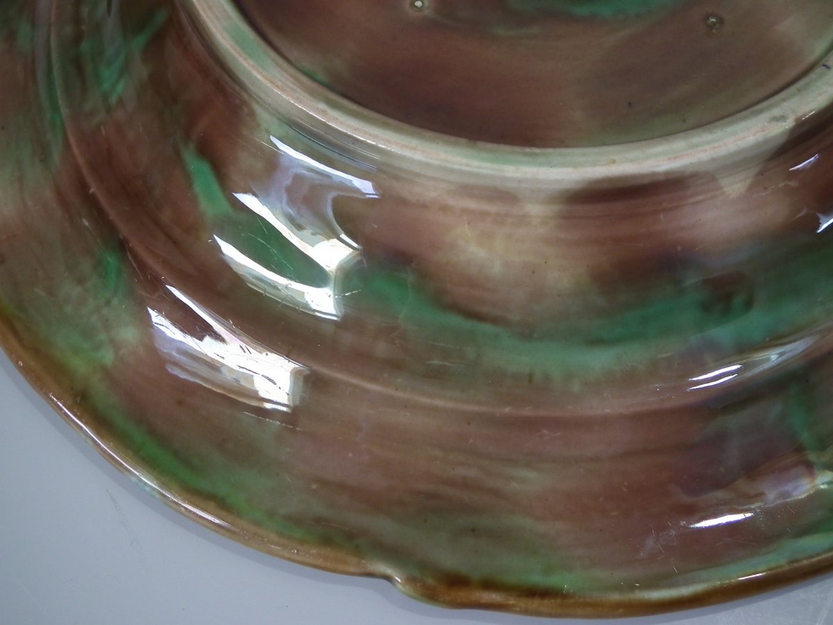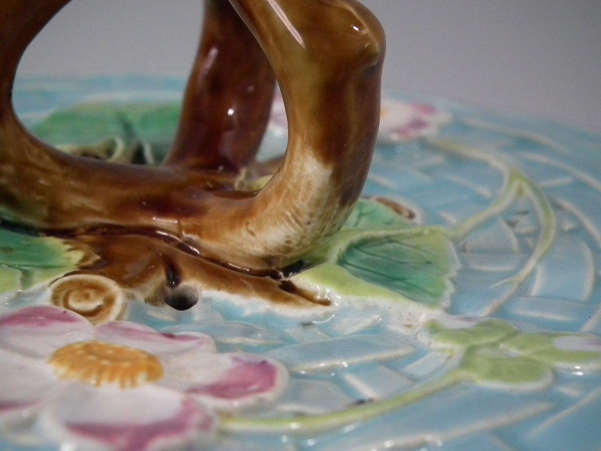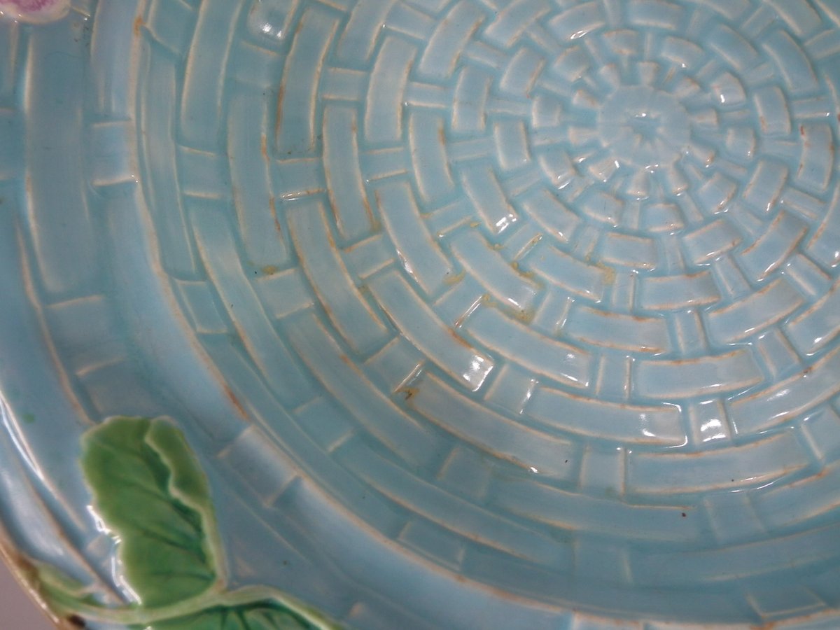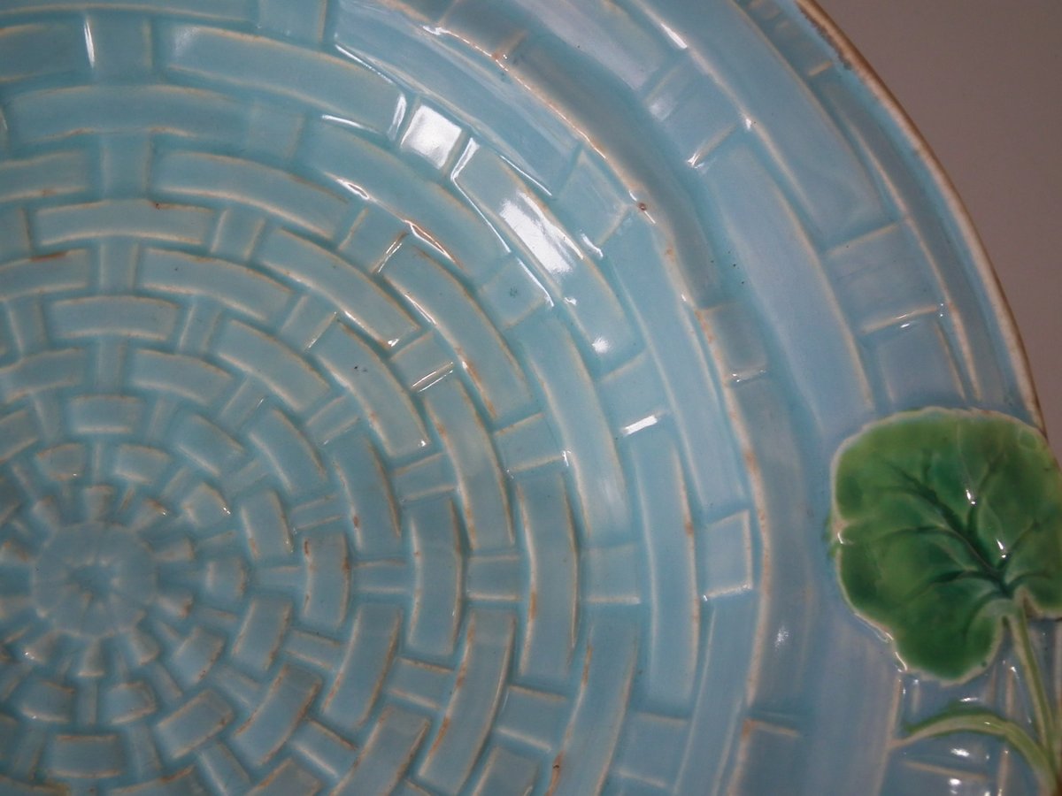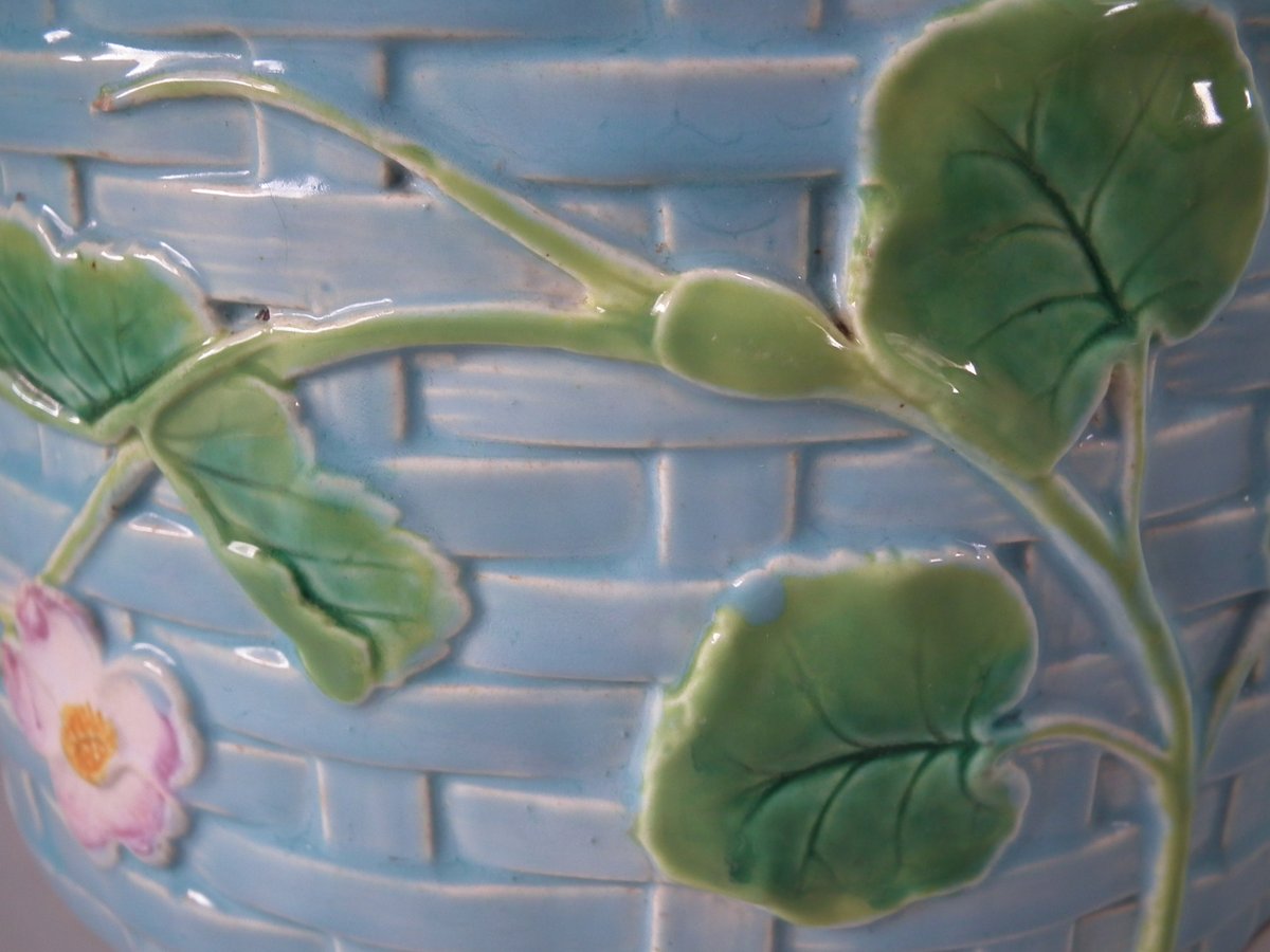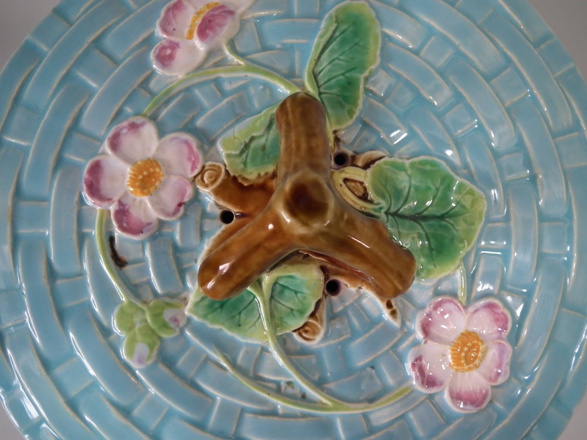 Victorian, circa 1880. 7.9ins high, 10.2ins wide, 10.2ins depth. George Jones & Sons Majolica cheese keep which features pansy leaves and flowers.
