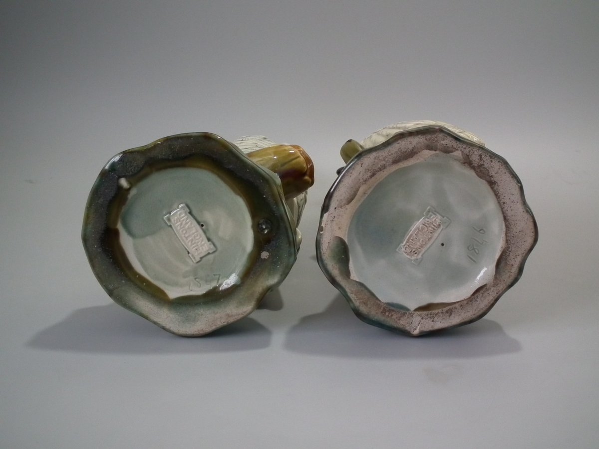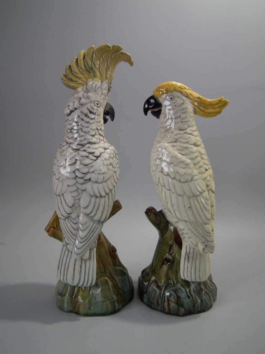 Edwardian, circa 1910. Tallest is 14.2ins high, 4.7ins wide, 4.7ins depth. Pair of Mintons Majolica figures which feature cockatoos/parrots perched on a branch.