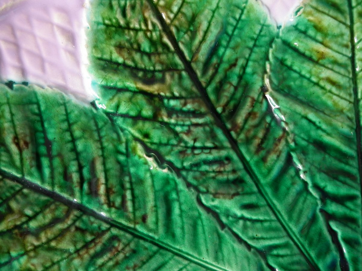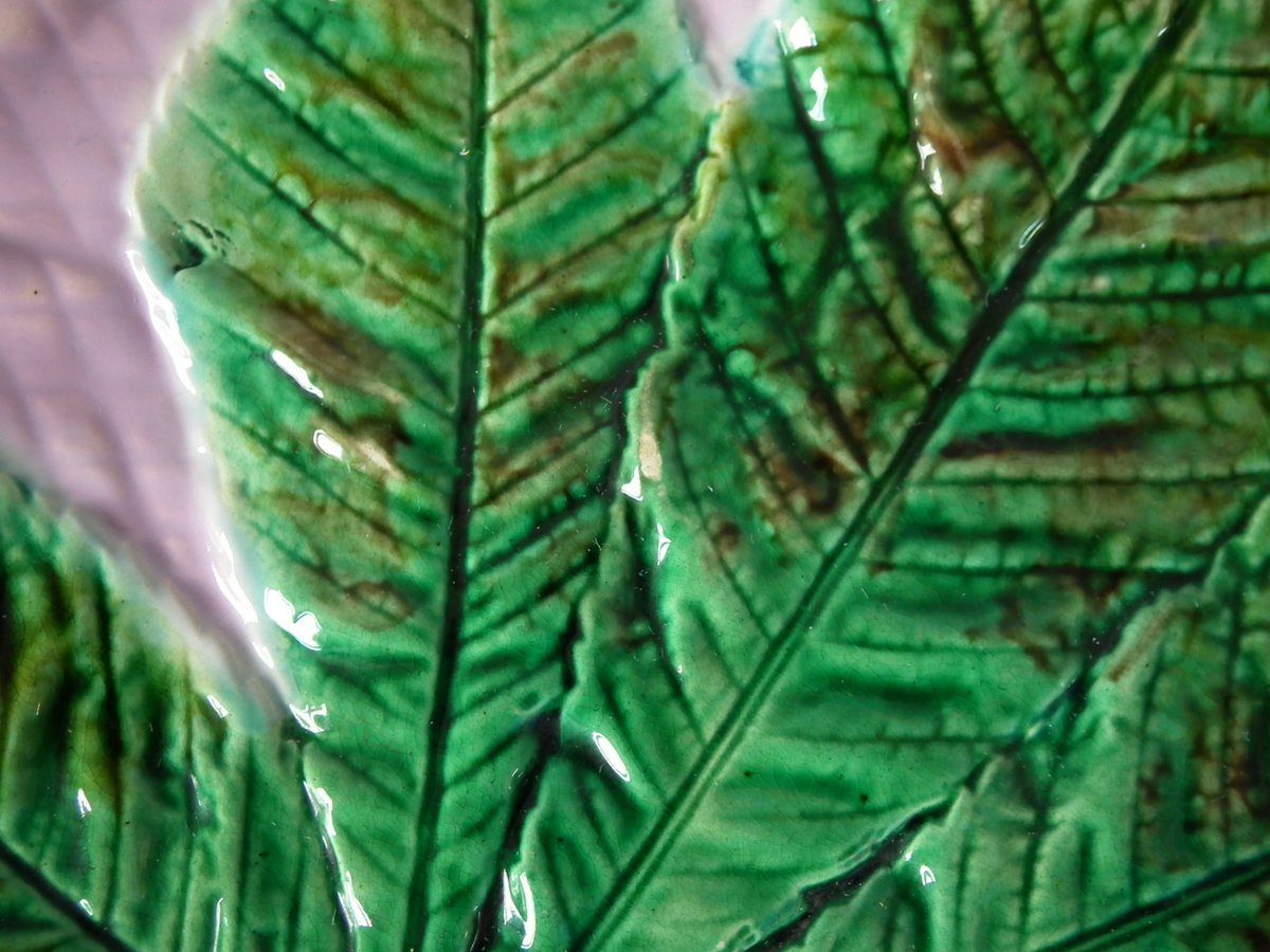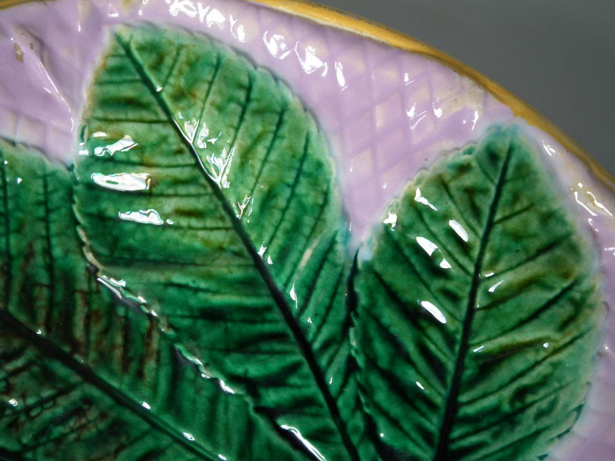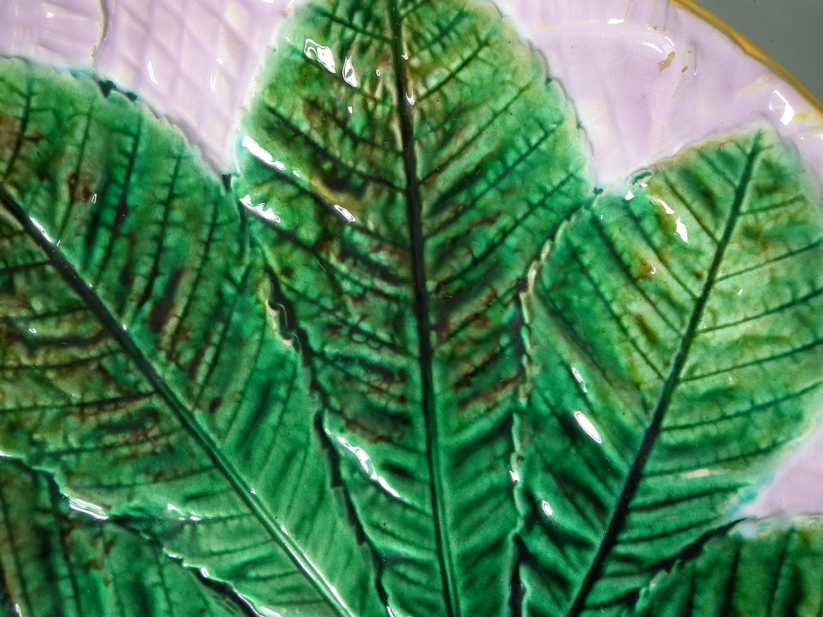 Victorian, circa 1870. 9.1ins high, 9.1ins wide, 1ins depth. George Jones Majolica plate which features a horse chestnut leaf to the front.