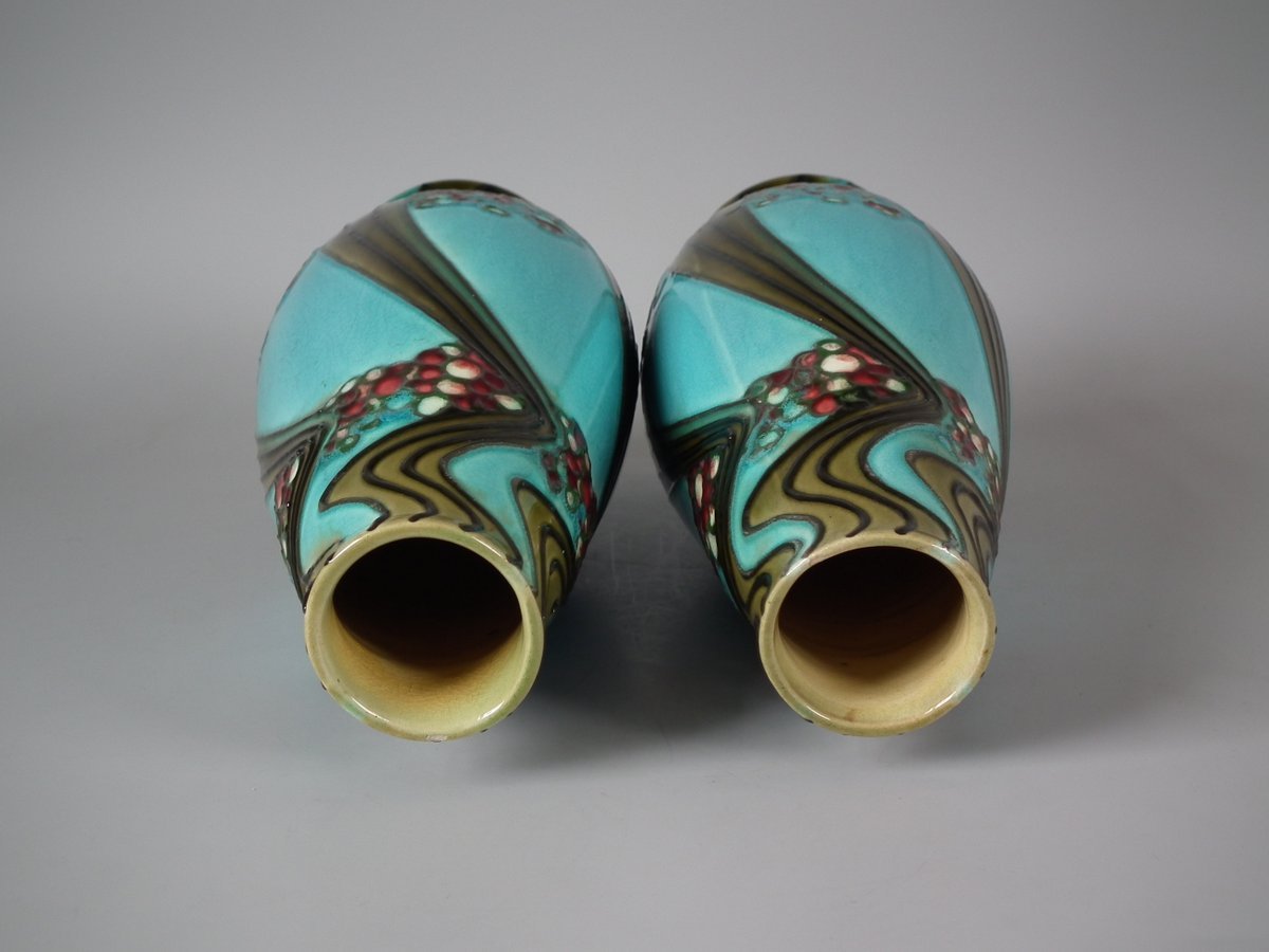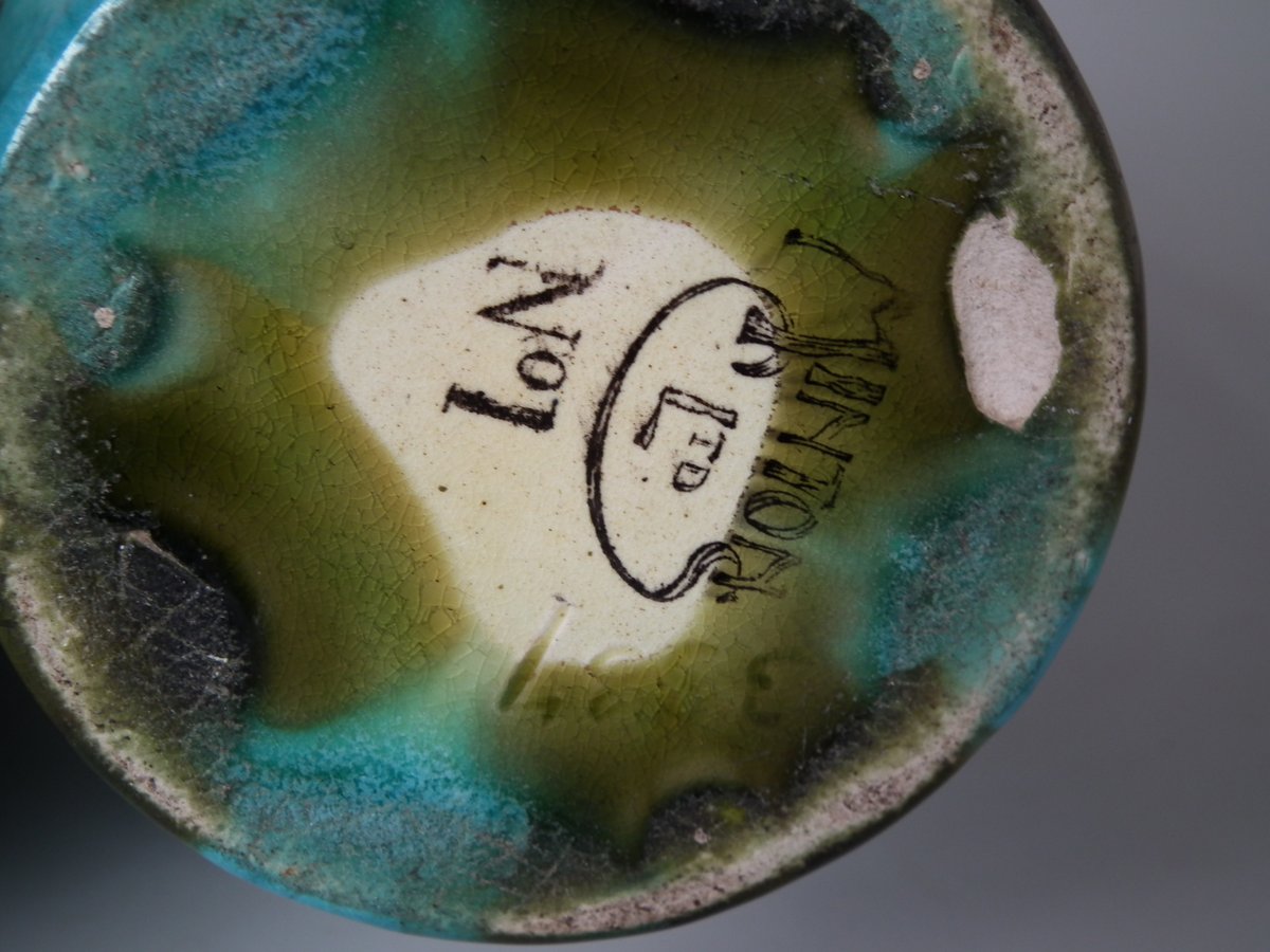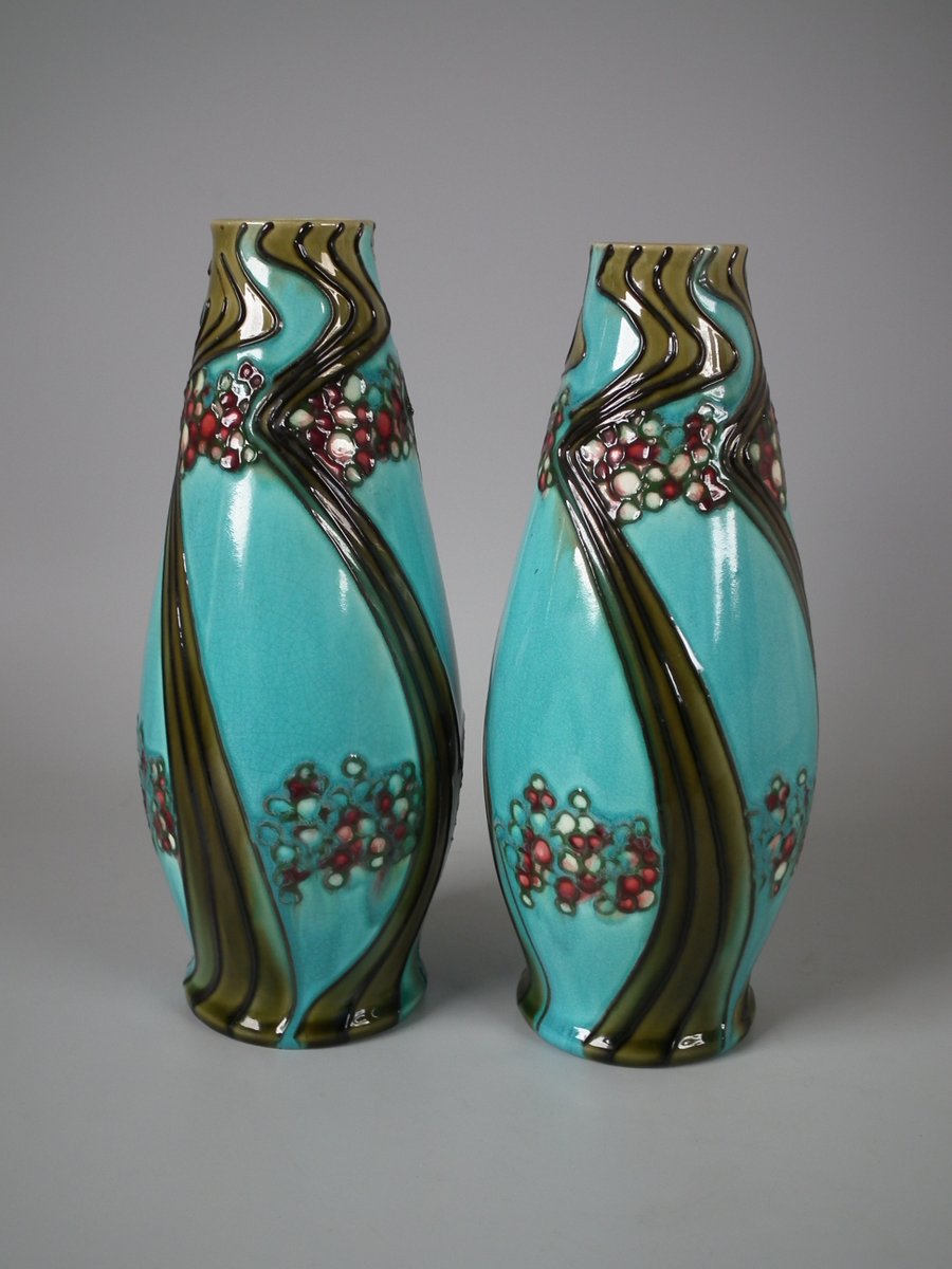 Circa 1910. 9.5ins high by 3.5ins wide. Pair Minton Secessionist No.1 vases. Wave effect tube linings in dark green with green glaze inbetween.