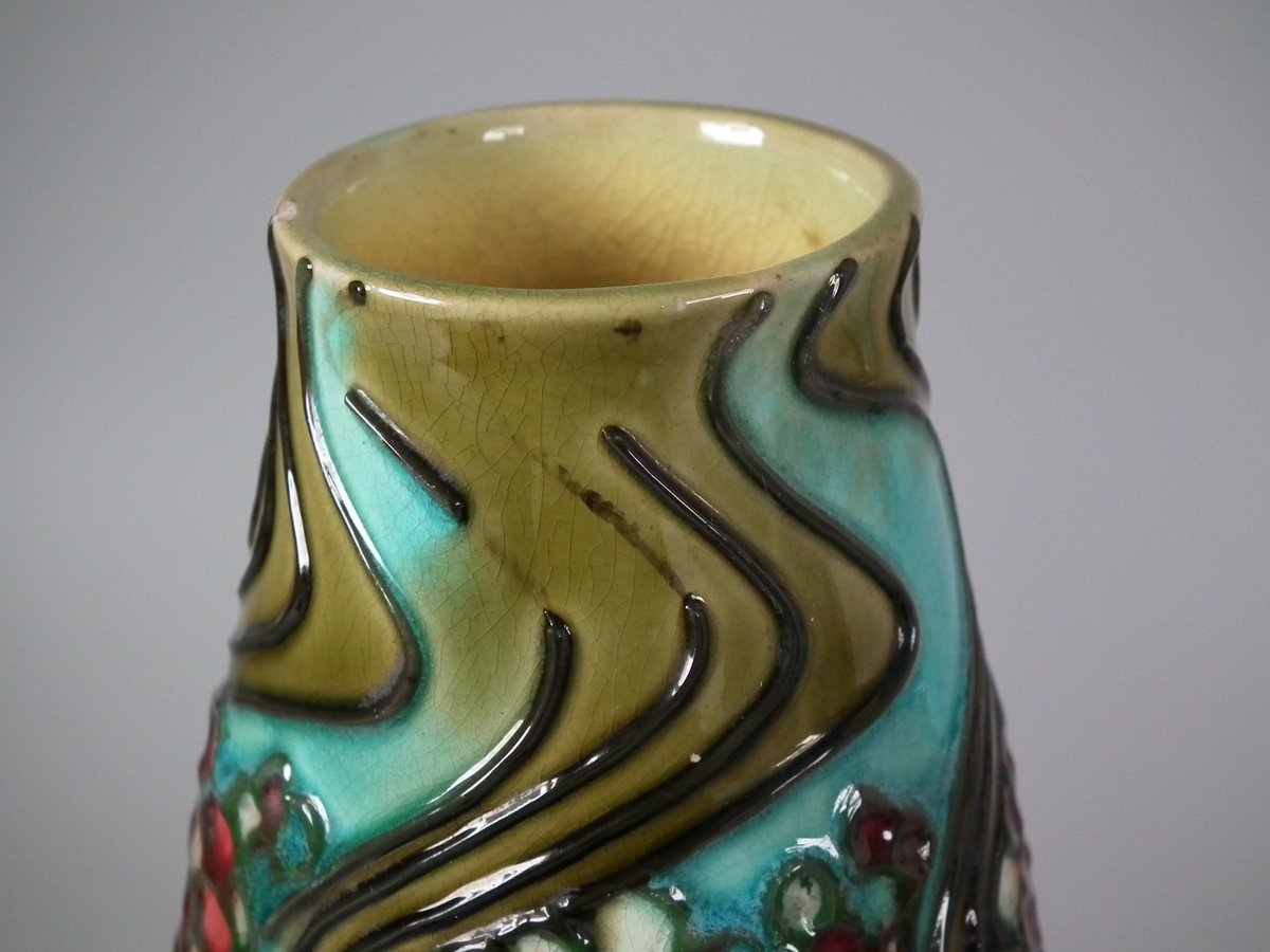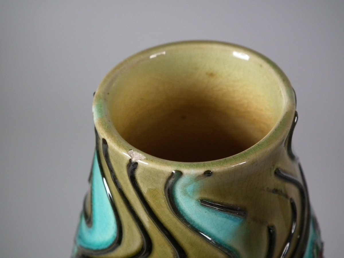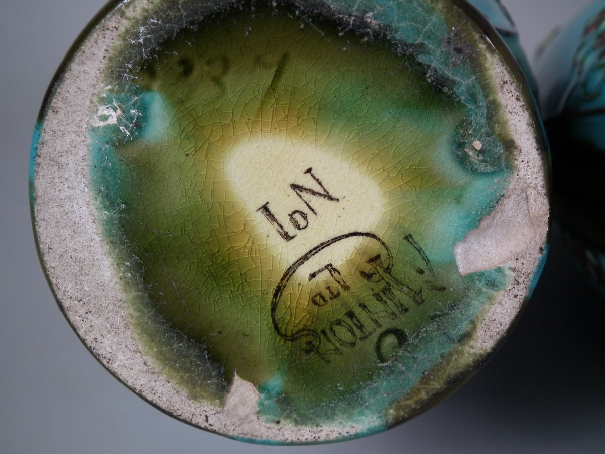 Circa 1910. 9.5ins high by 3.5ins wide. Pair Minton Secessionist No.1 vases. Wave effect tube linings in dark green with green glaze inbetween.