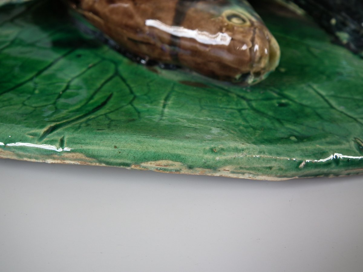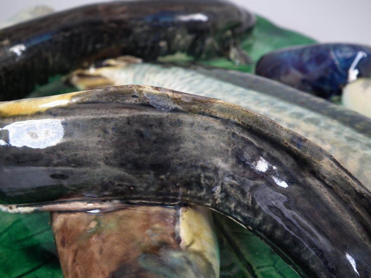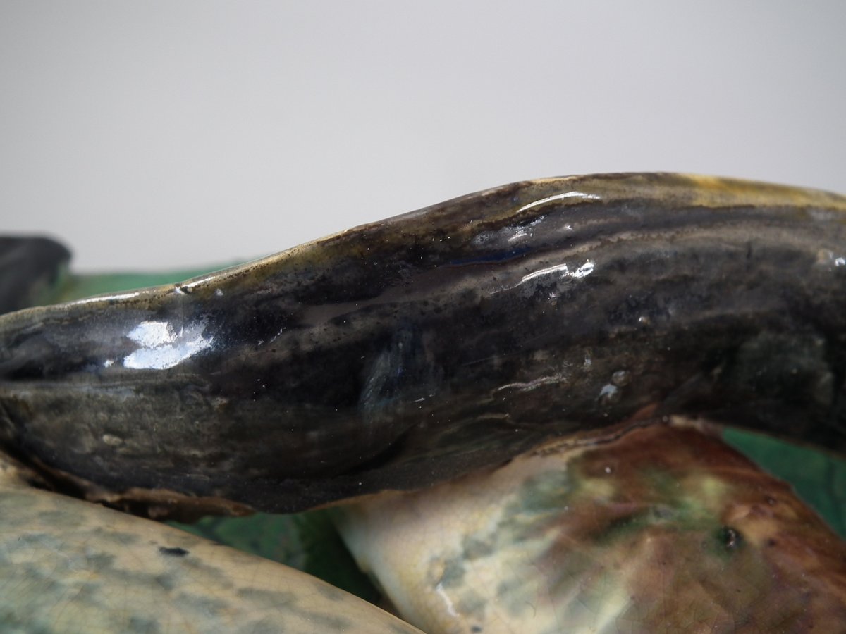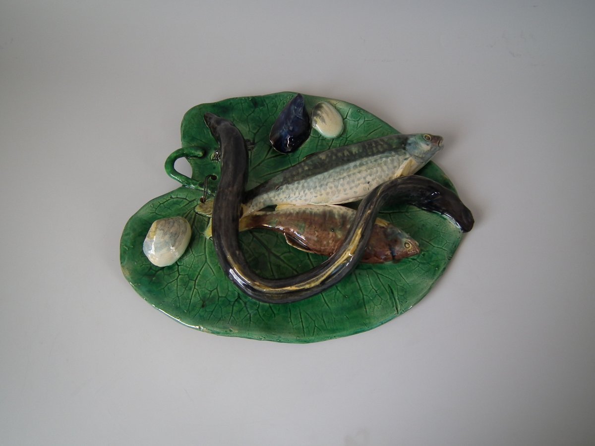 Circa 1890. 12.6ins high, 9.8ins wide, 2.6ins depth. Alfred Renoleau French Palissy Majolica wall plaque which features an eel, fish and shellfish on a leaf.