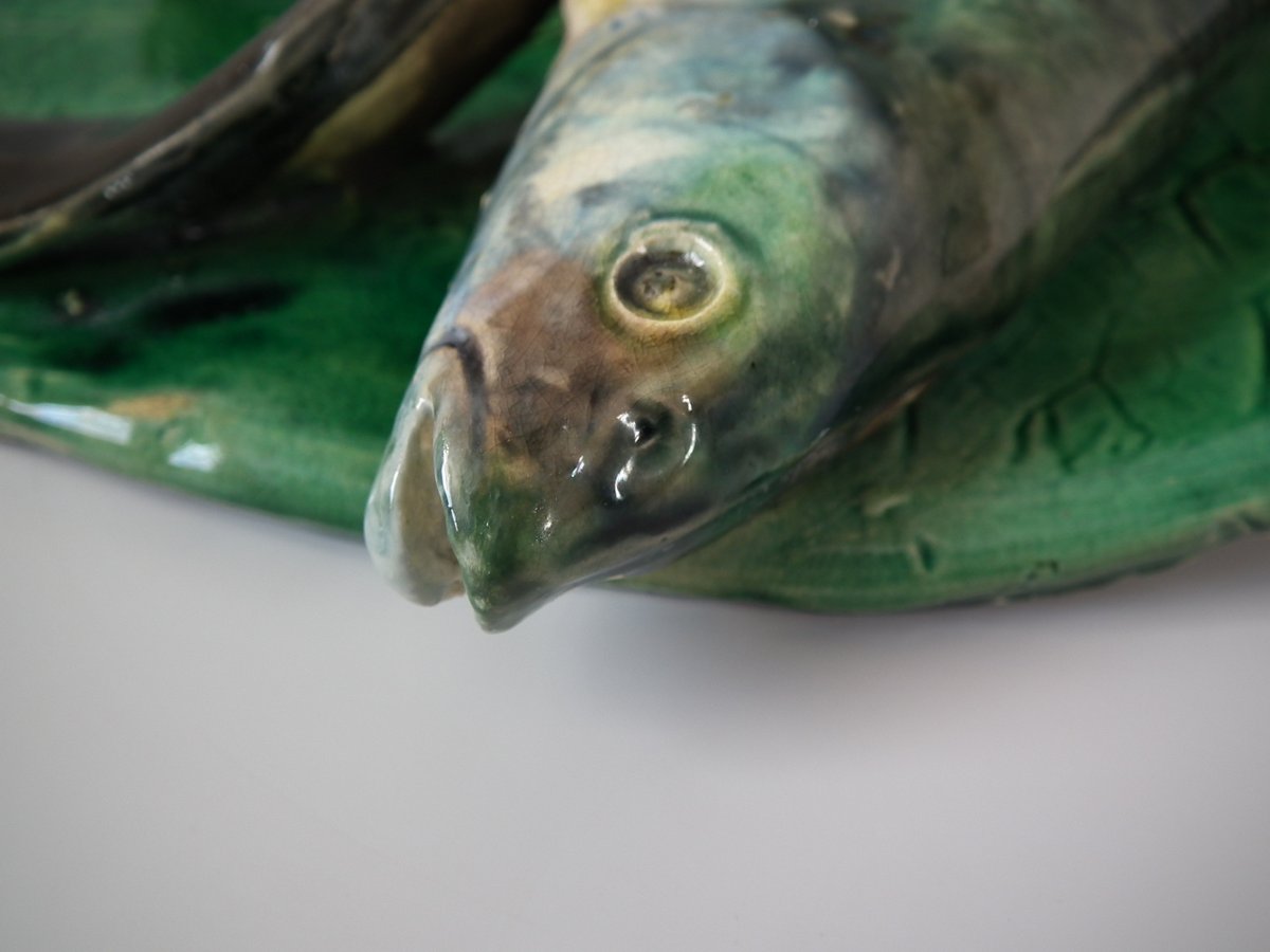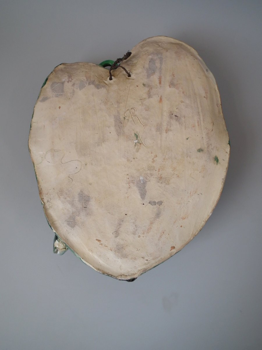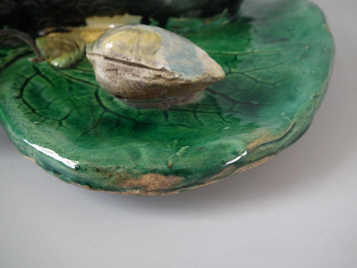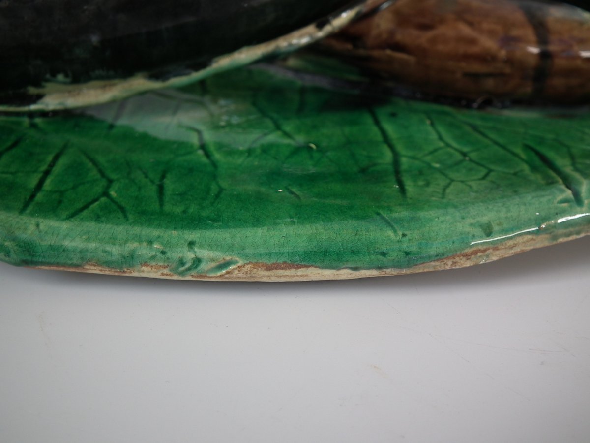 Circa 1890. 12.6ins high, 9.8ins wide, 2.6ins depth. Alfred Renoleau French Palissy Majolica wall plaque which features an eel, fish and shellfish on a leaf.