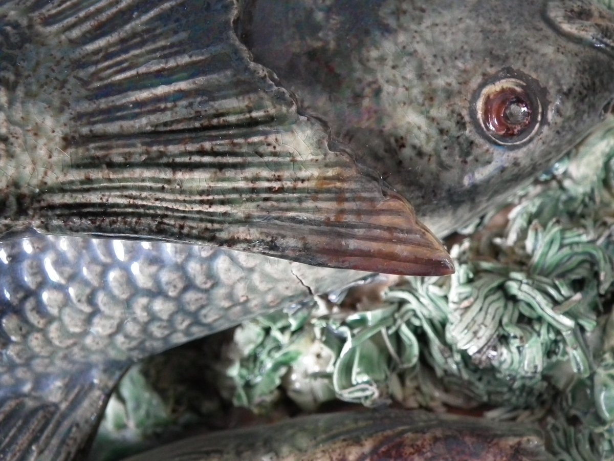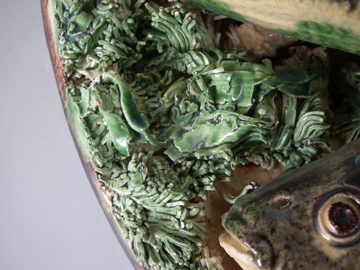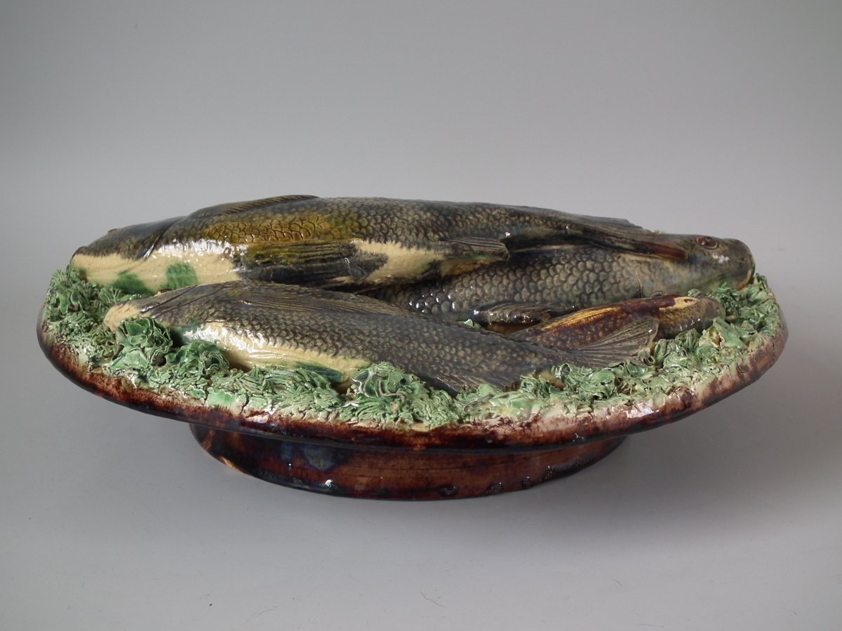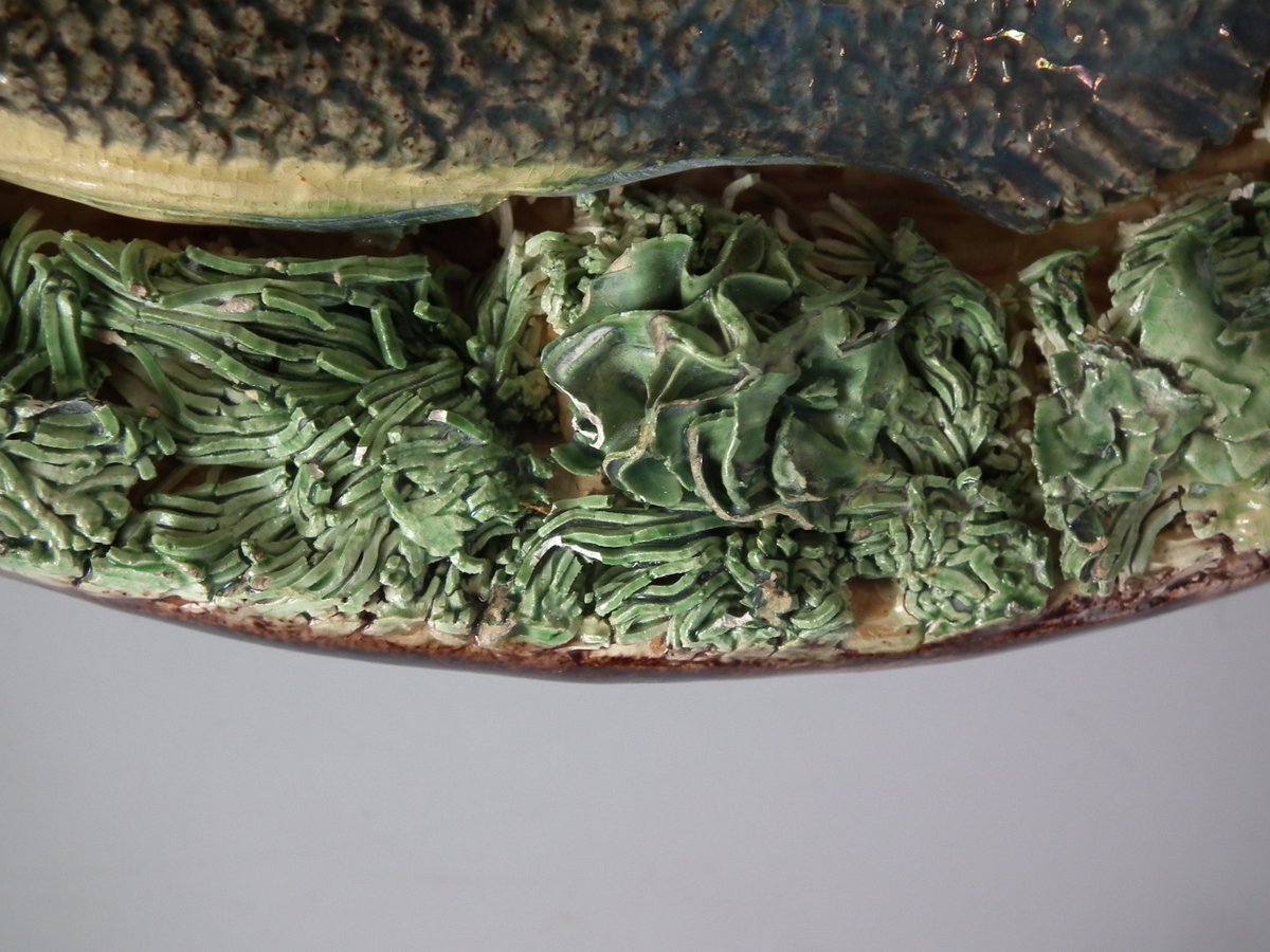 Circa 1890. 11.8ins high, 11.8ins wide, 3.9ins depth. Jose Francisco de Sousa Portuguese Palissy Majolica wall plate which features six fish.