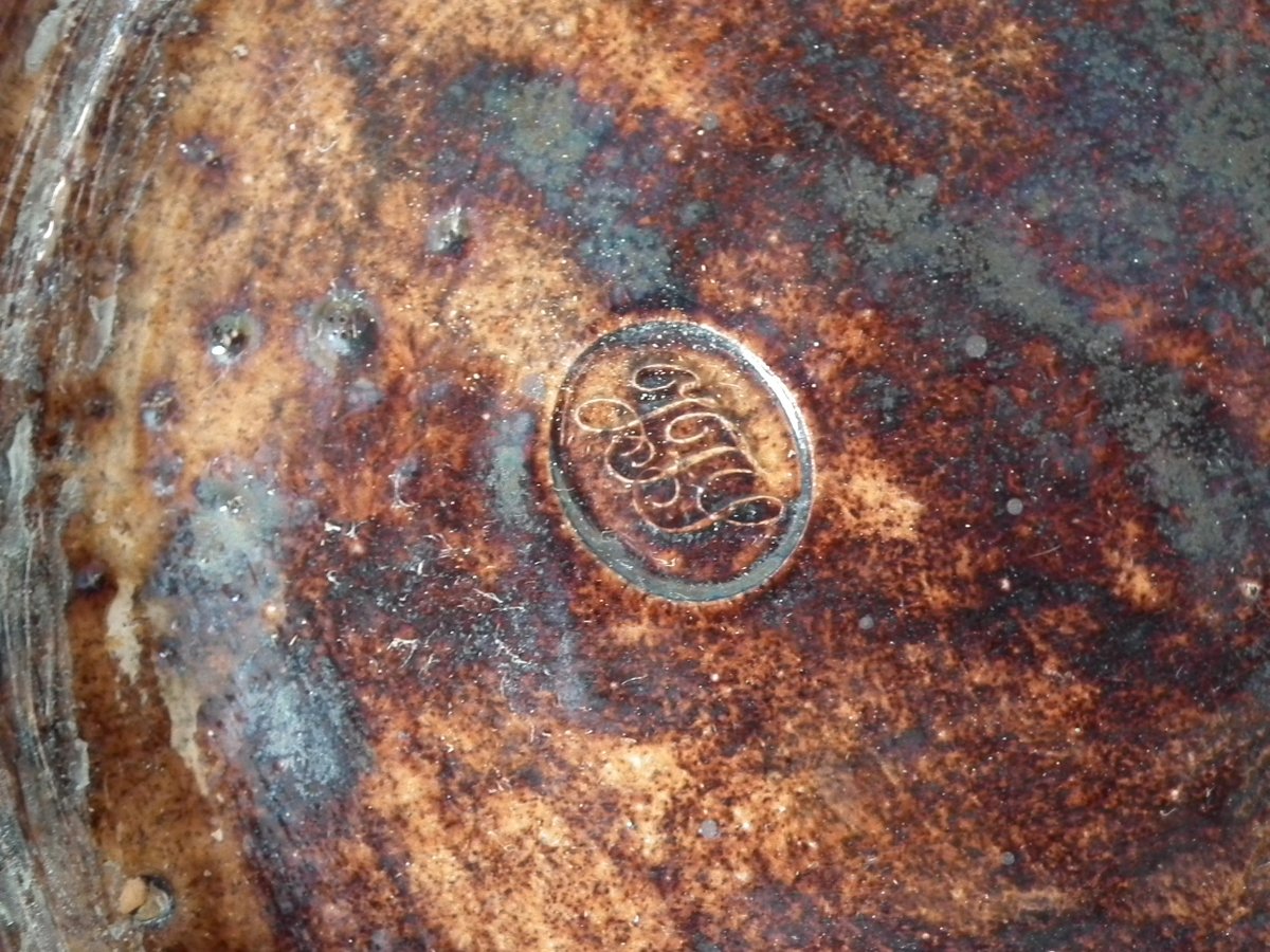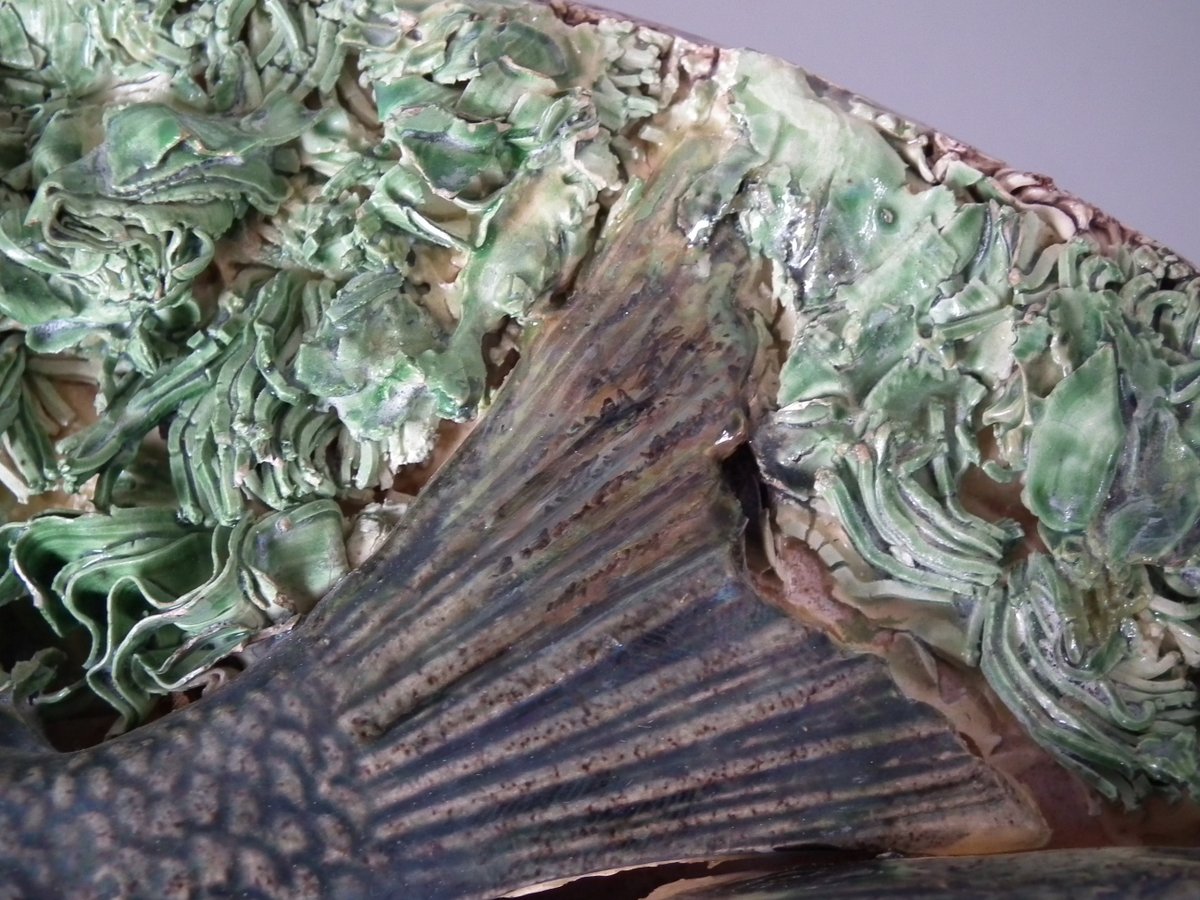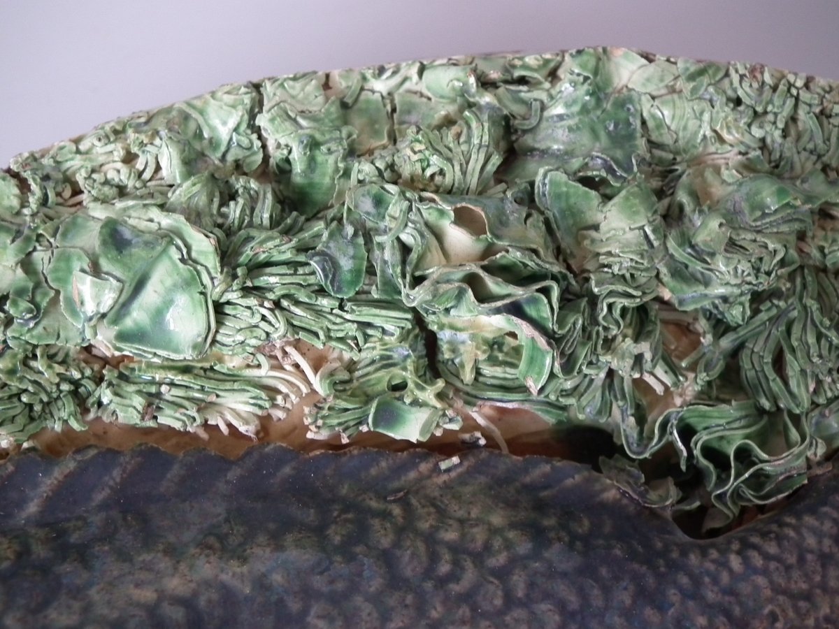 Colouration: green, grey, cream, are predominant. The piece bears maker's marks for the Jose Francisco de Sousa pottery.