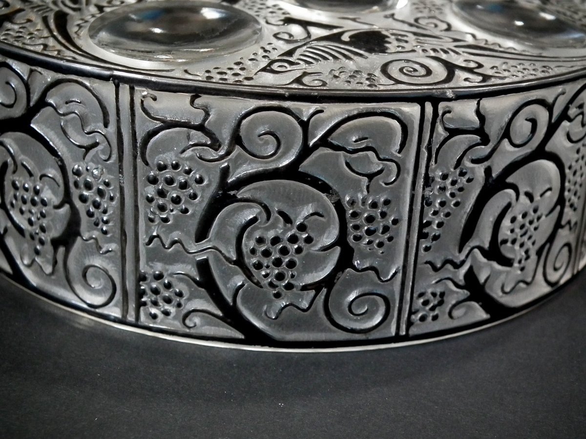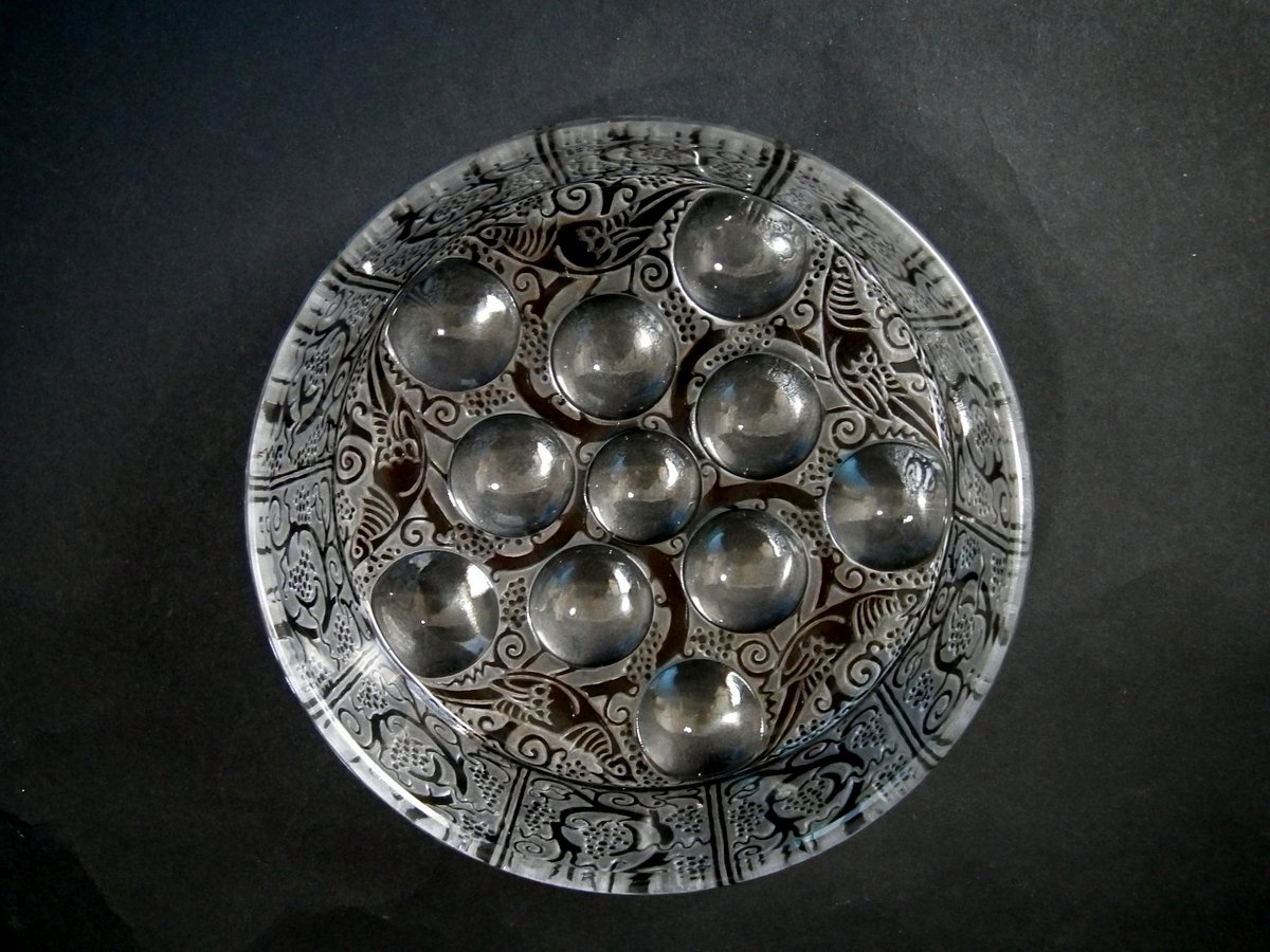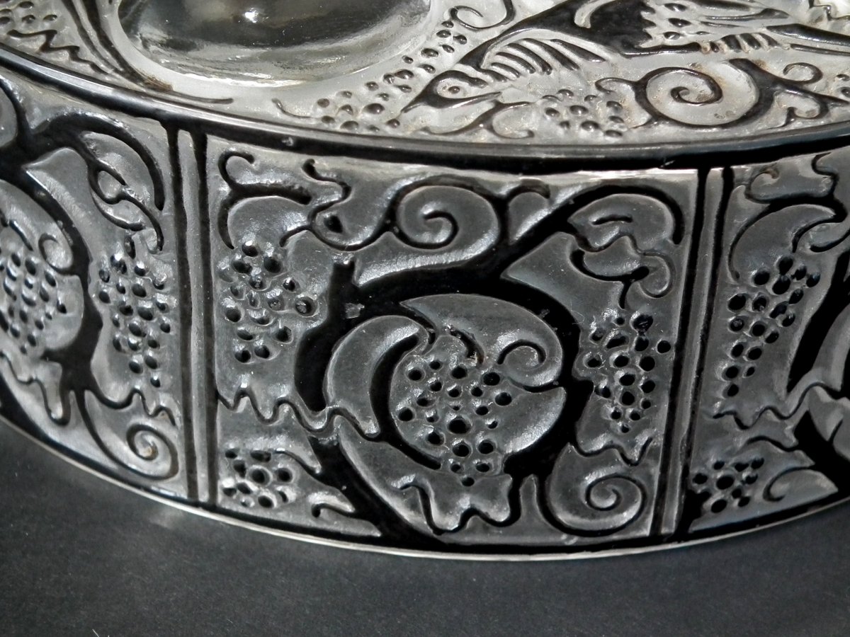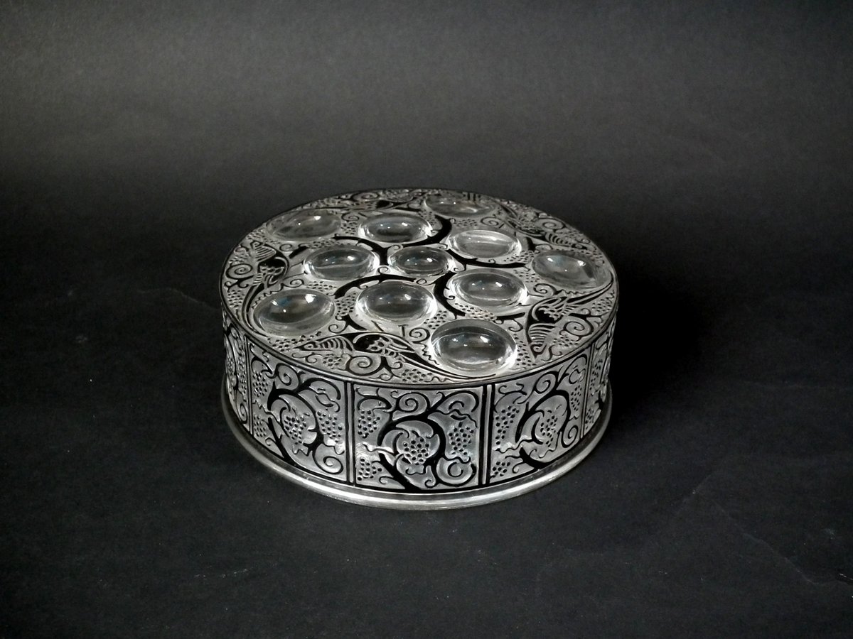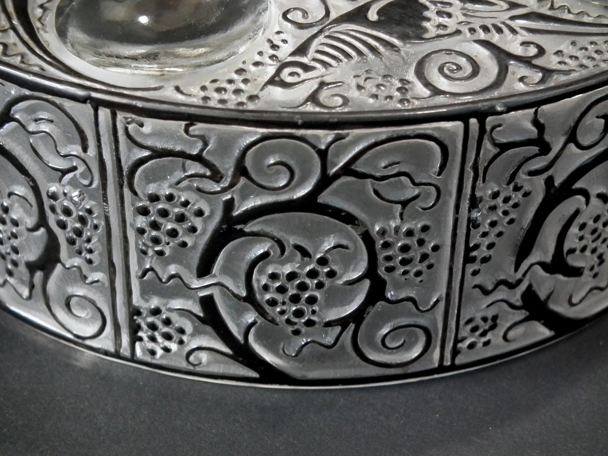 Introduced in 1926. Height: 5cm (1.97ins). Width: 13.5cm (5.31ins). Depth: 13.5cm (5.31ins). Rene Lalique clear and frosted glass box, with black enamelled details. '