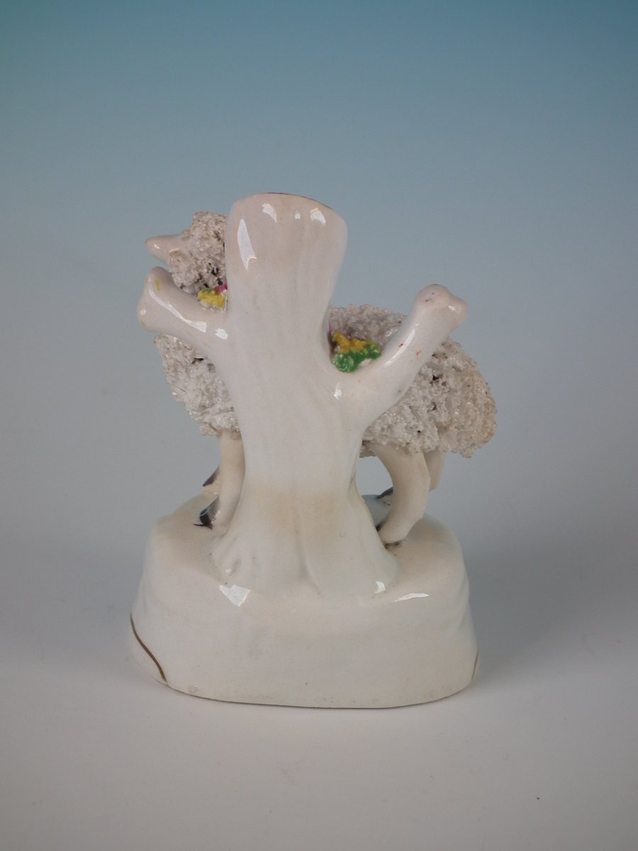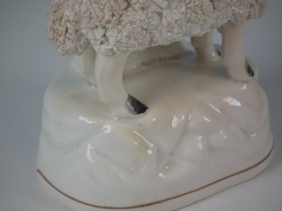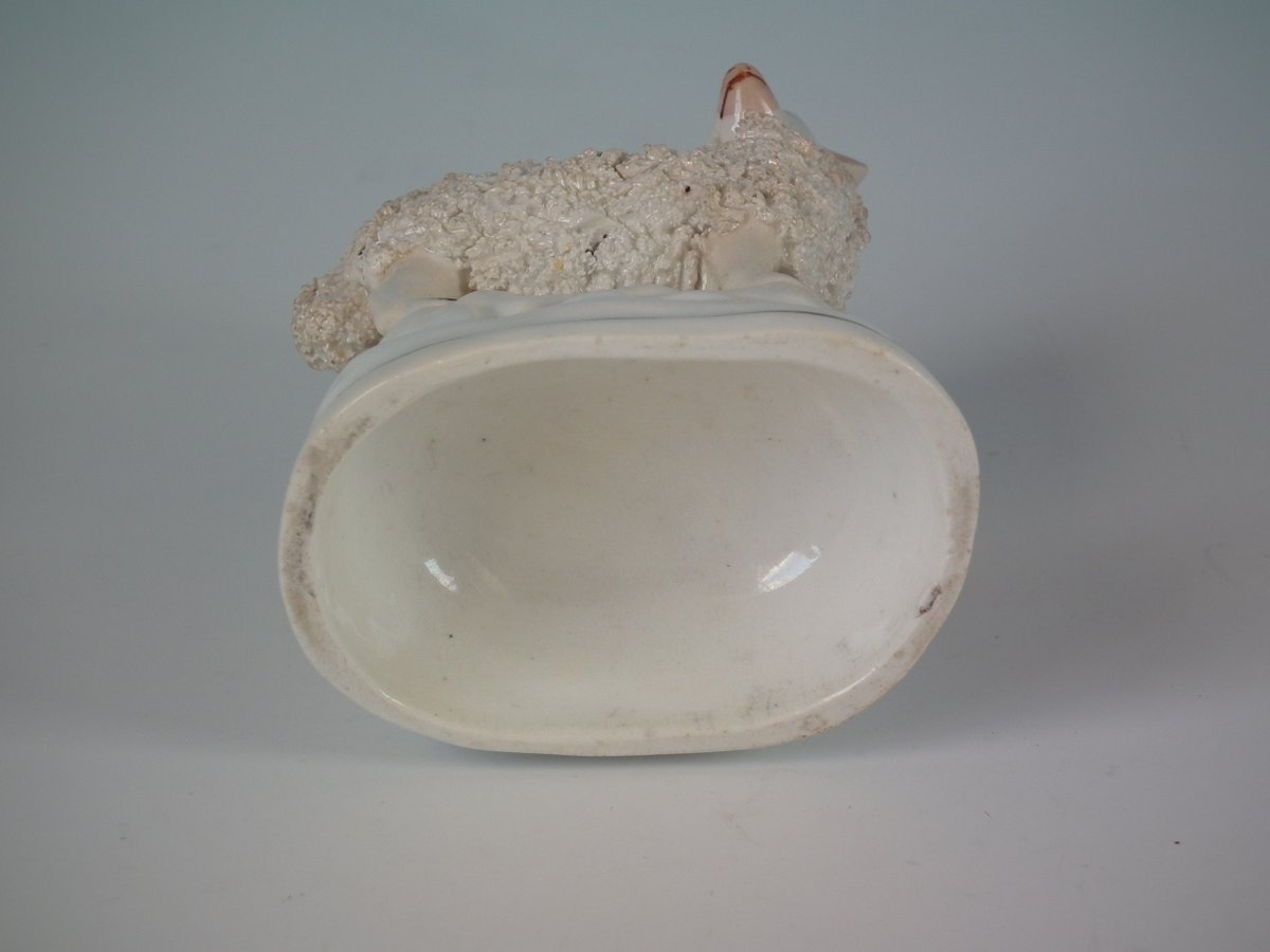 Victorian, circa 1860. 4.7ins high, 3.3ins wide, 2.4ins depth. Staffordshire Pottery spill vase which features a sheep, stood on an oval base.