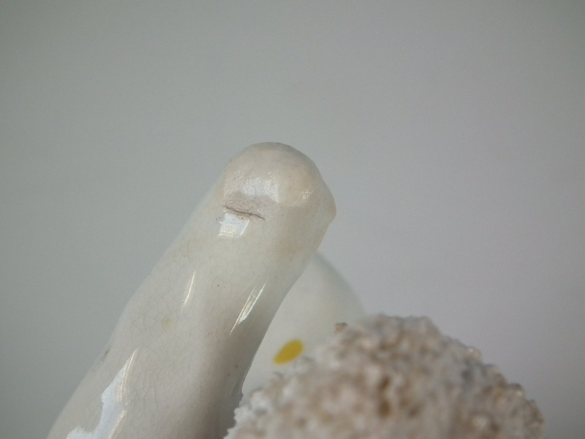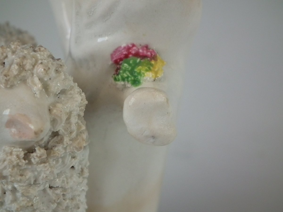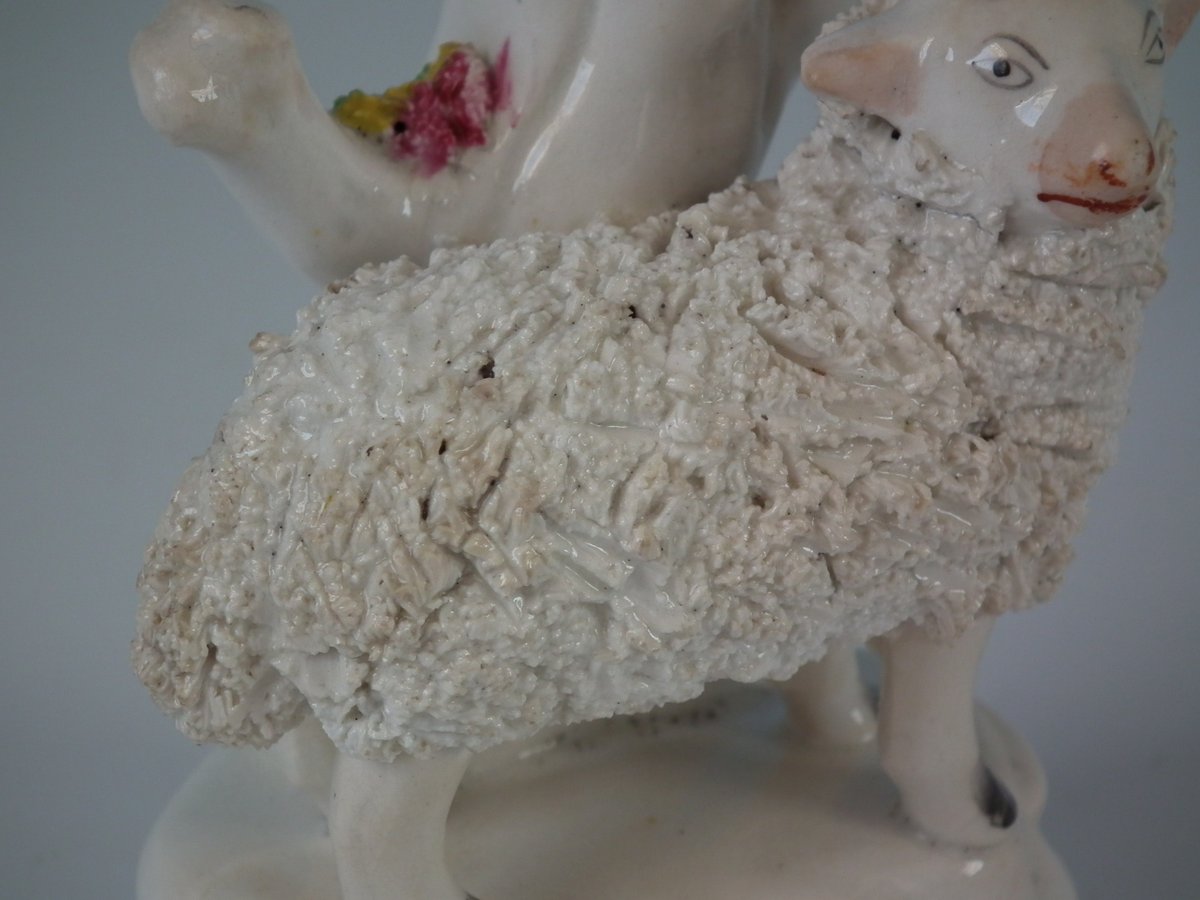 Victorian, circa 1860. 4.7ins high, 3.3ins wide, 2.4ins depth. Staffordshire Pottery spill vase which features a sheep, stood on an oval base.