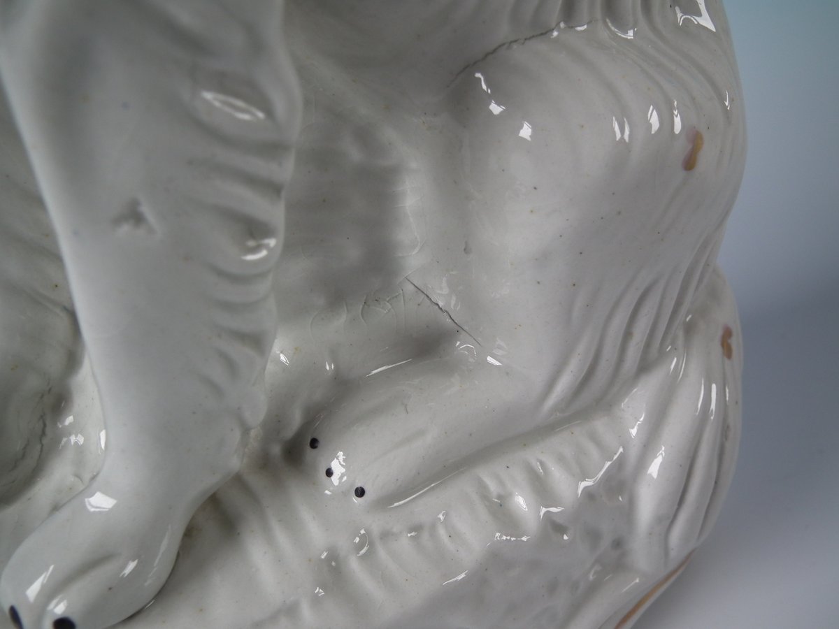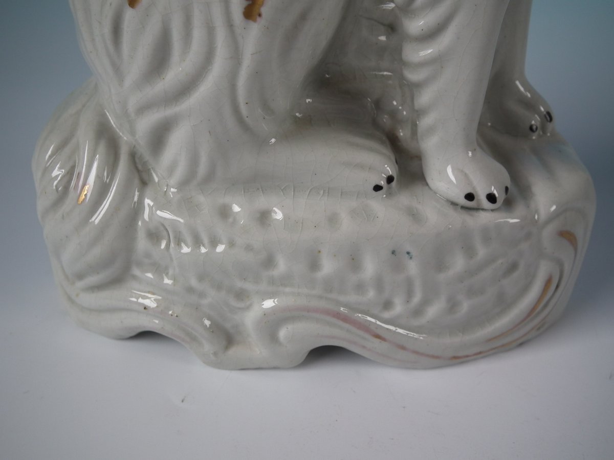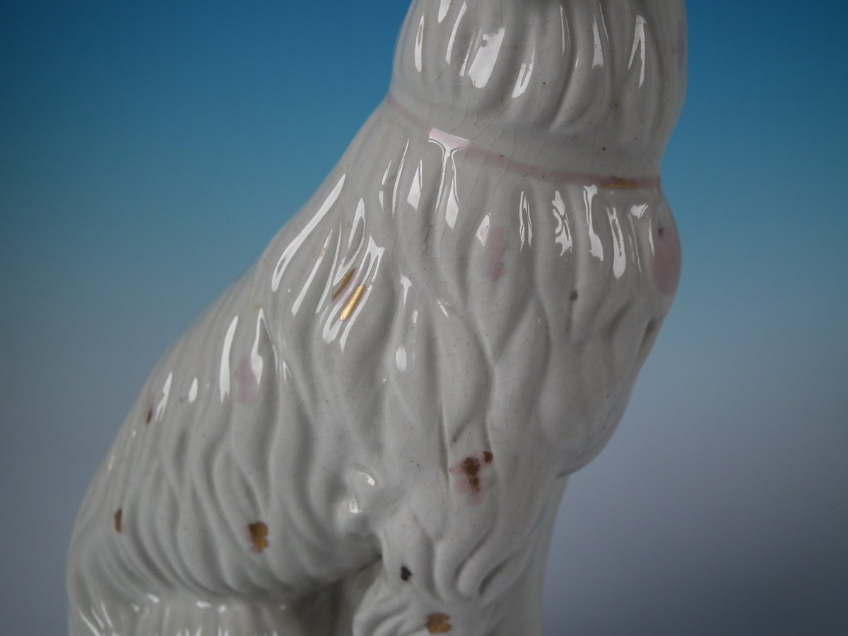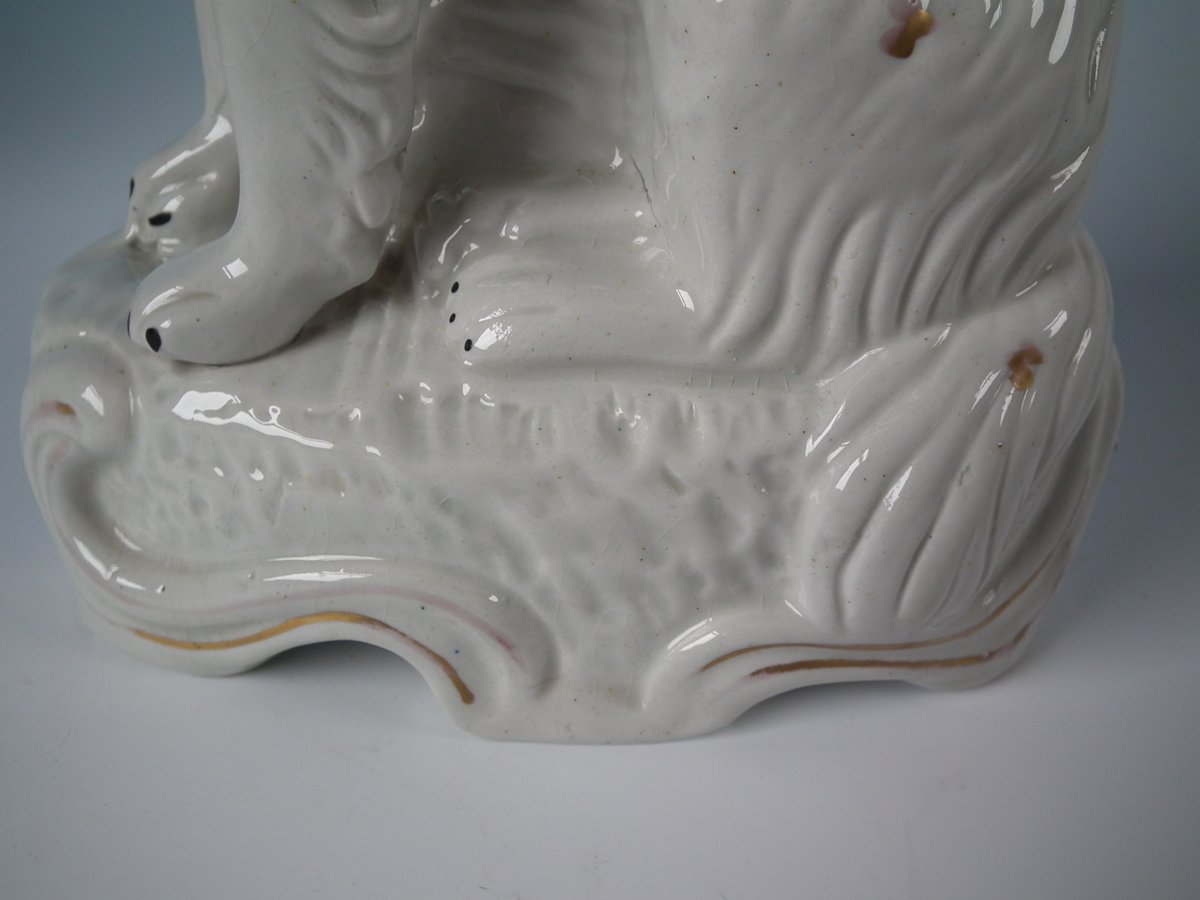 Victorian, circa 1860. Tallest is 11.8ins high, 6.7ins wide, 3.5ins depth. Pair of Staffordshire Pottery figures which feature Irish Setter, seated on a scroll work base.