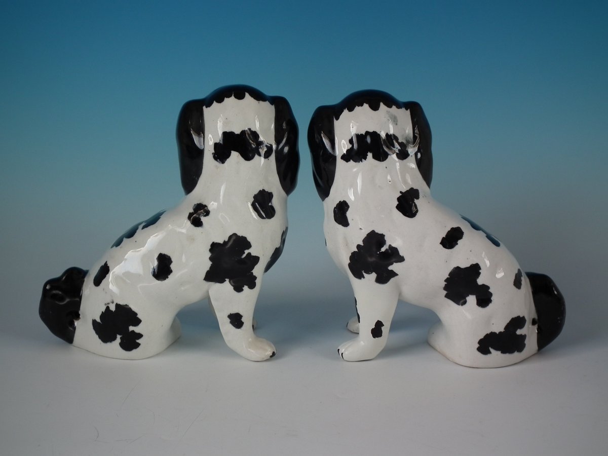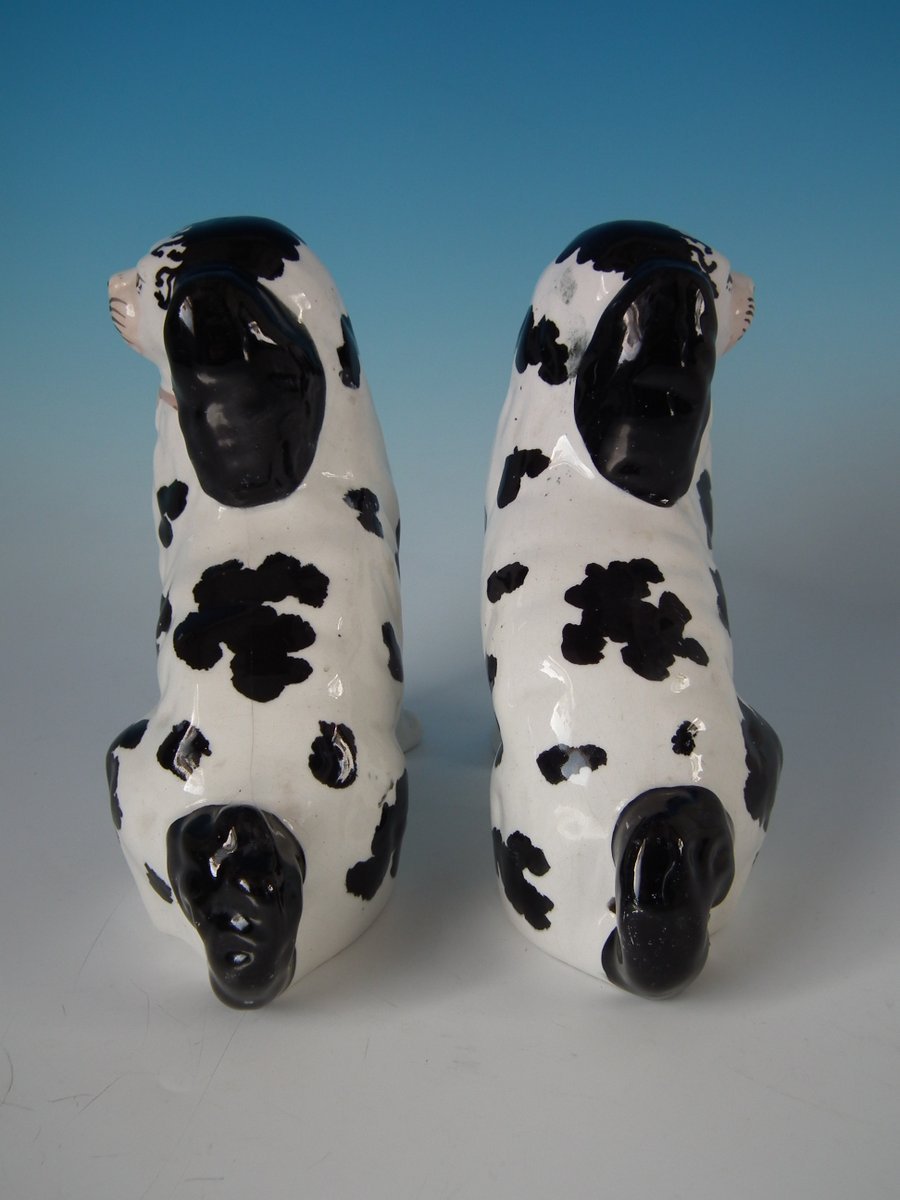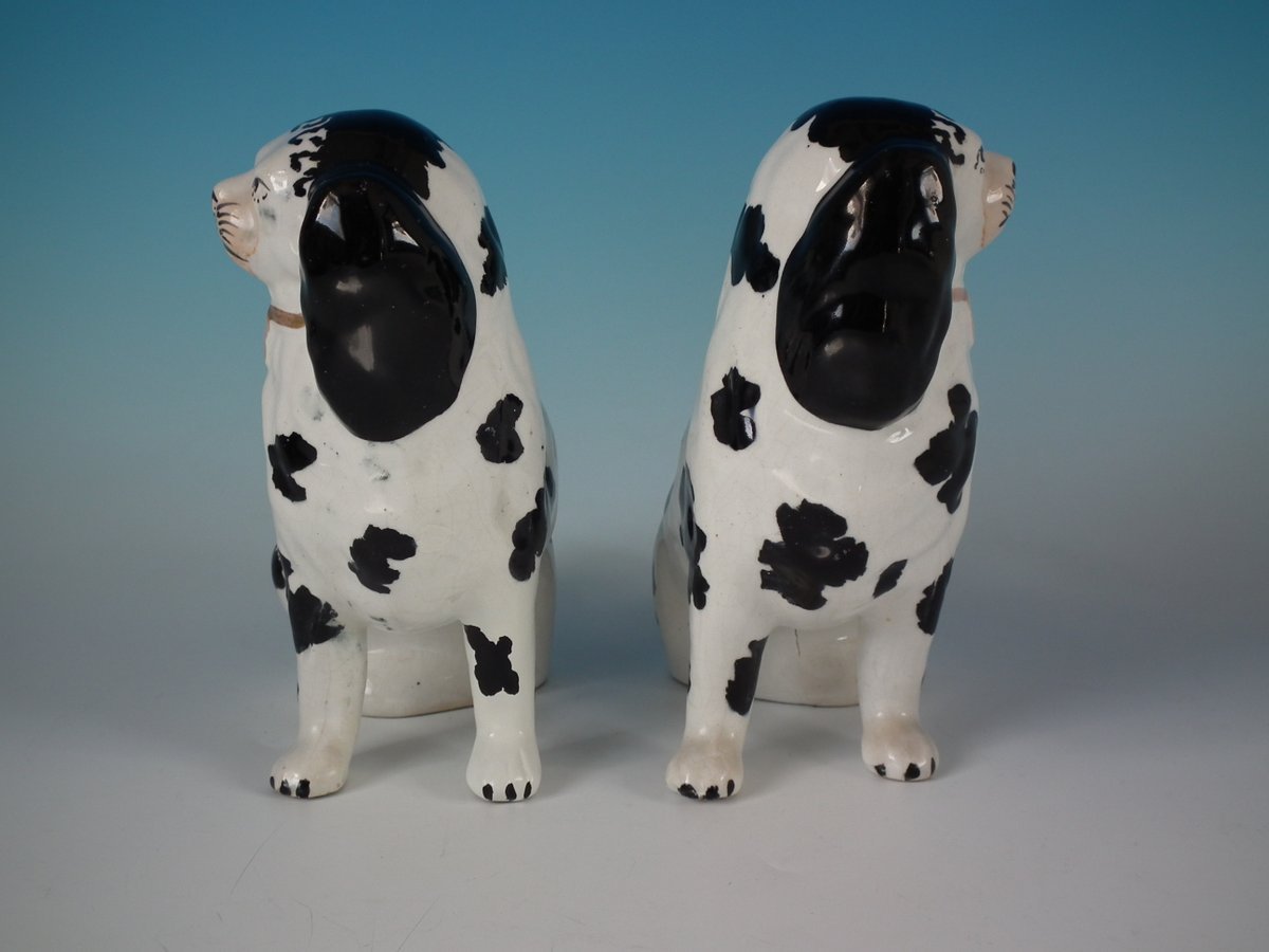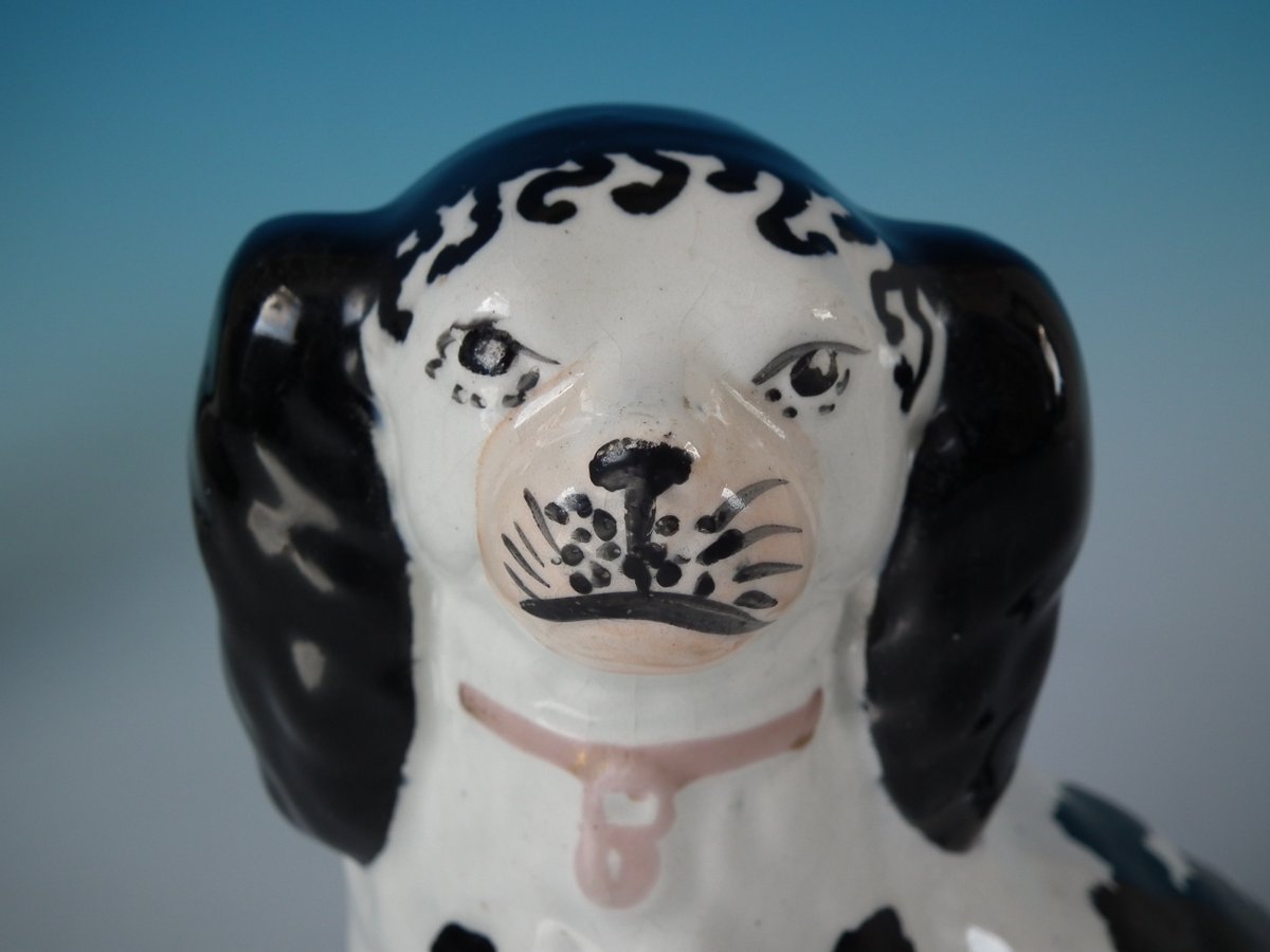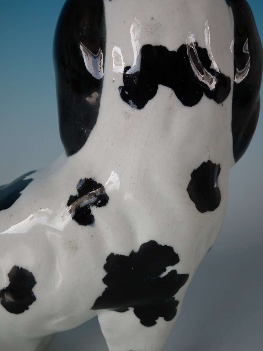 Pair of Staffordshire Pottery figures which feature a Disraeli spaniel with both front legs free, seated directly on the ground, no base.