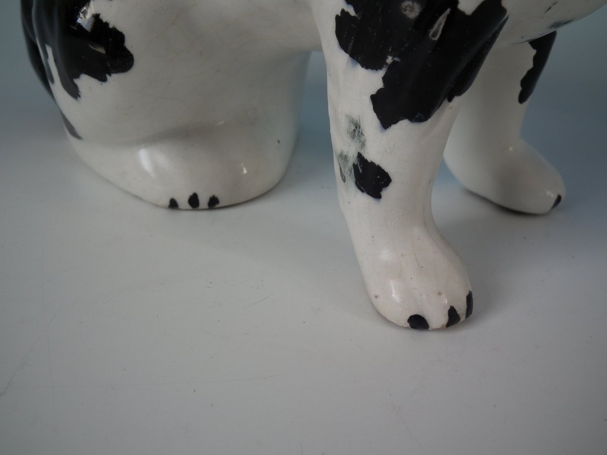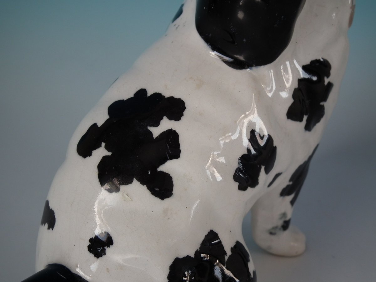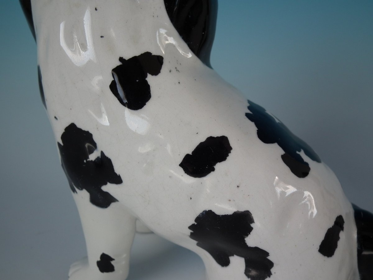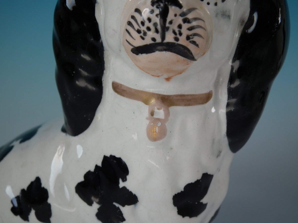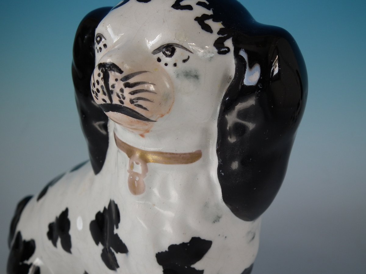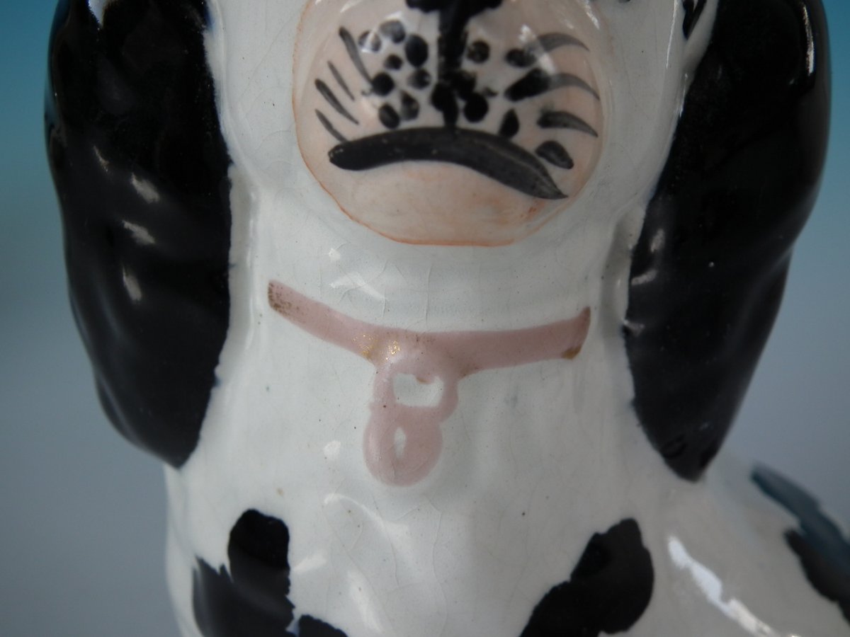 Pair of Staffordshire Pottery figures which feature a Disraeli spaniel with both front legs free, seated directly on the ground, no base.