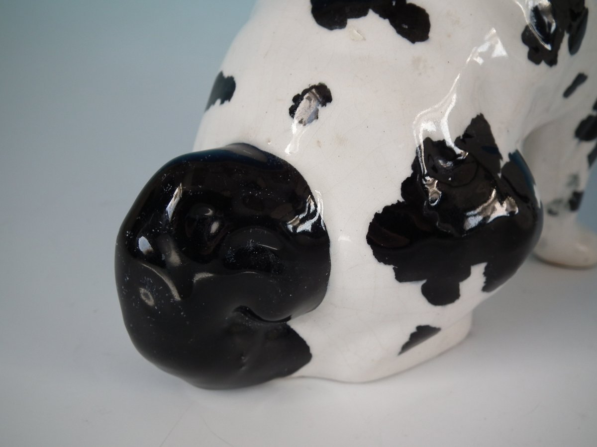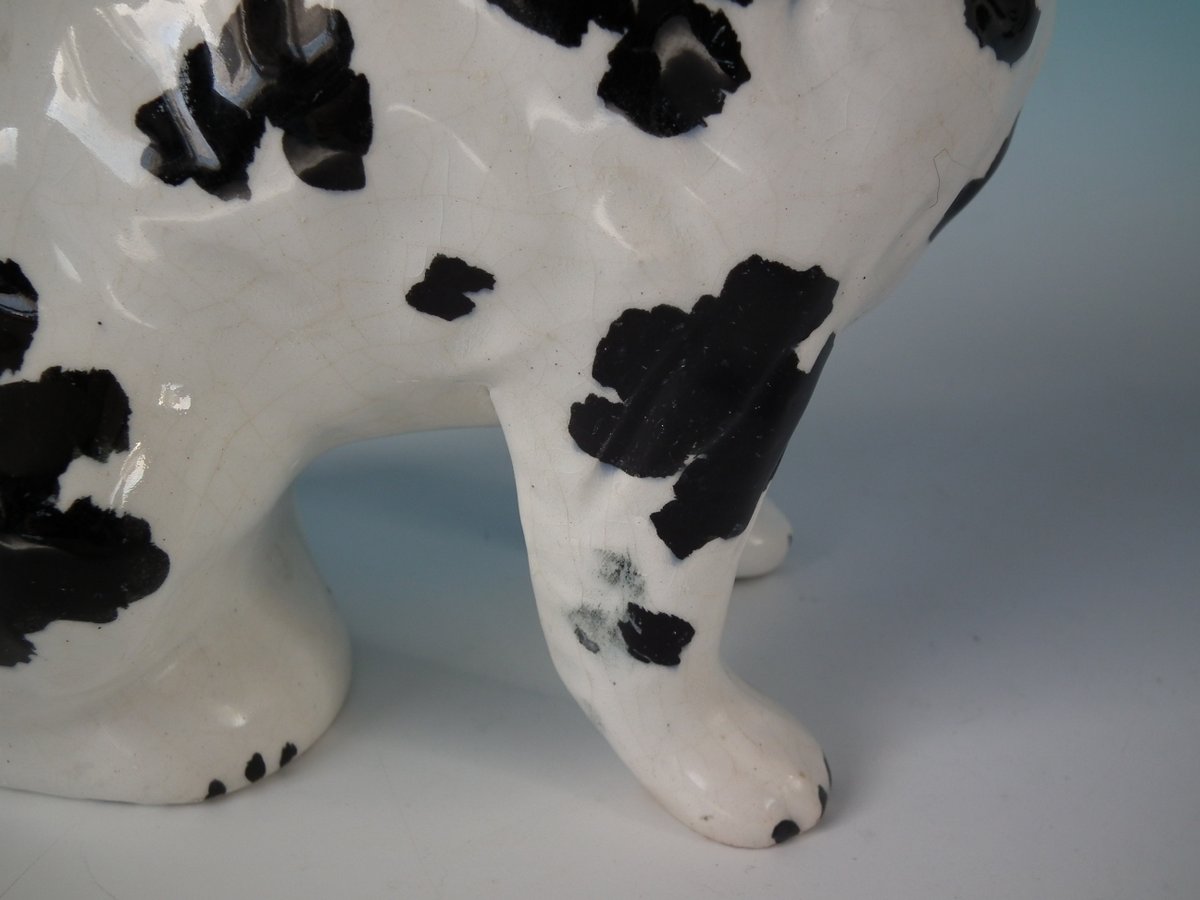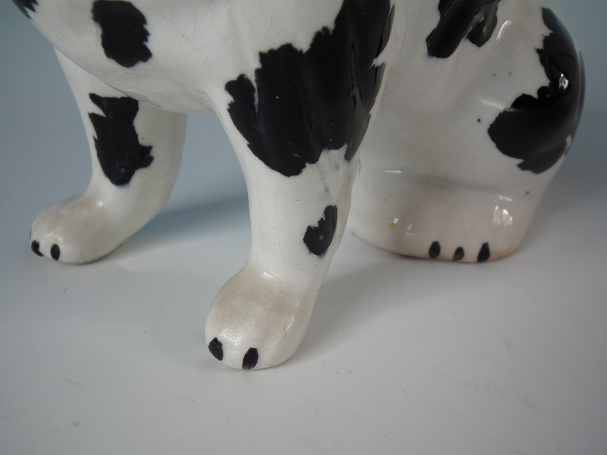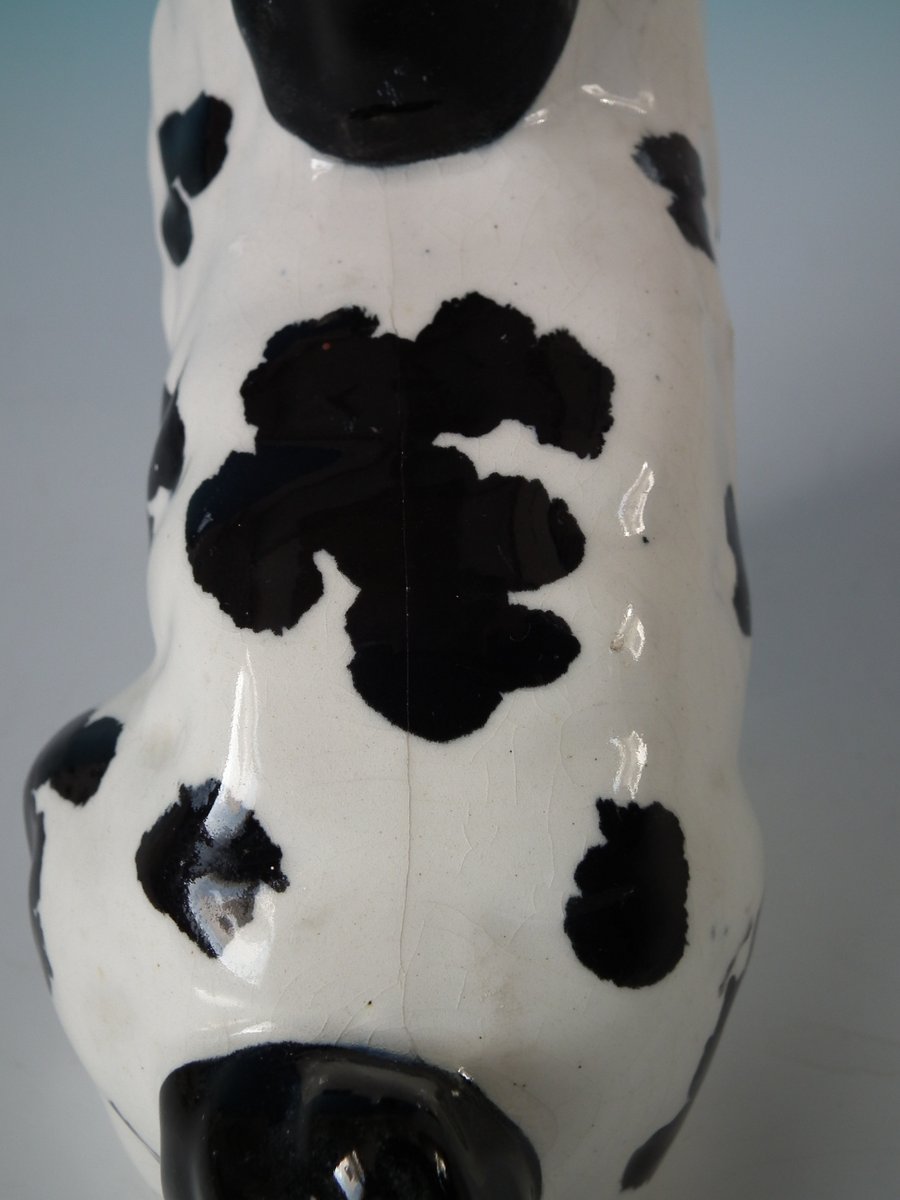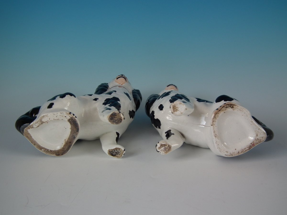 Pair of Staffordshire Pottery figures which feature a Disraeli spaniel with both front legs free, seated directly on the ground, no base.