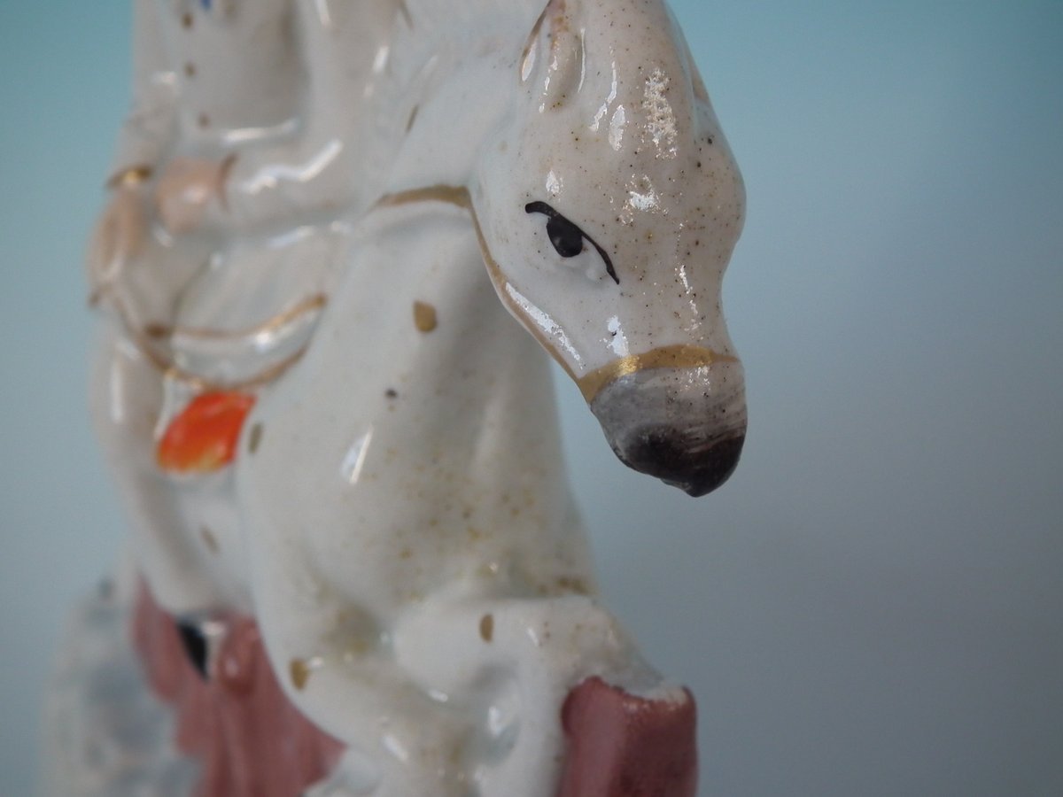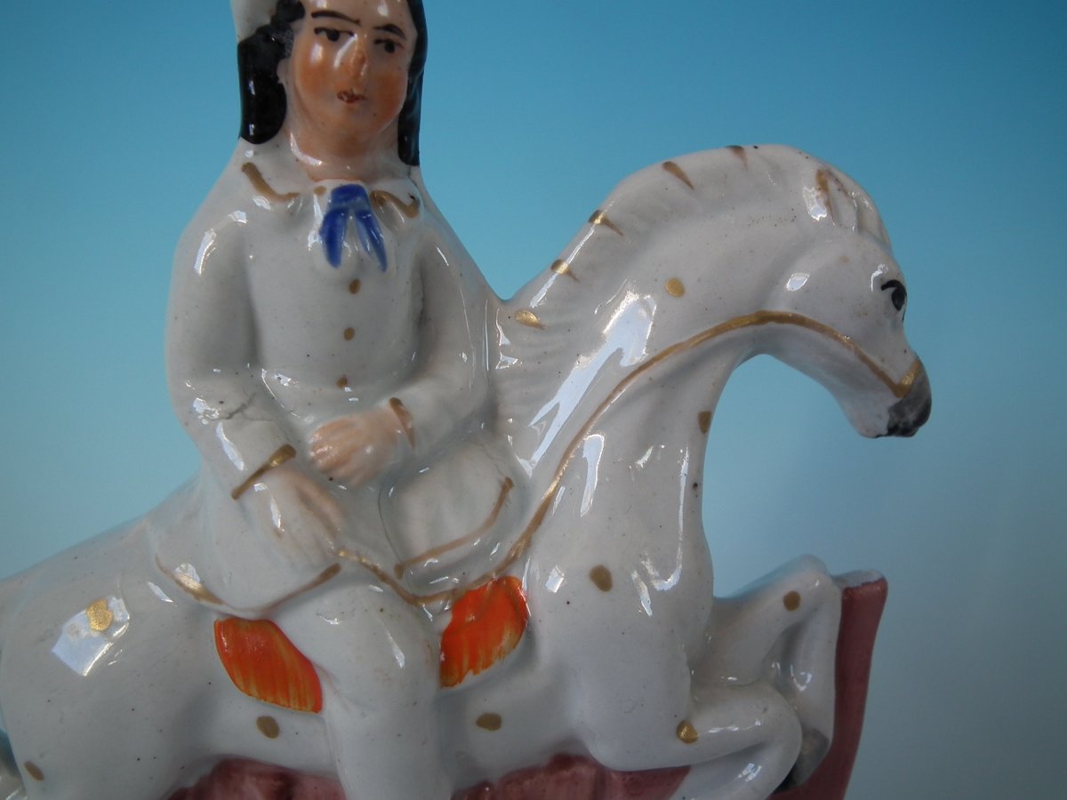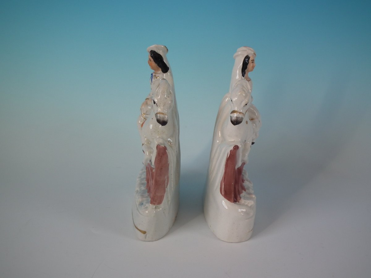 Victorian, circa 1860. Tallest is 6.3ins high, 4.9ins wide, 2ins depth. Pair of Staffordshire Pottery figures which feature a boy and girl both riding a horse, leaping over fence, stood on a shaped base.