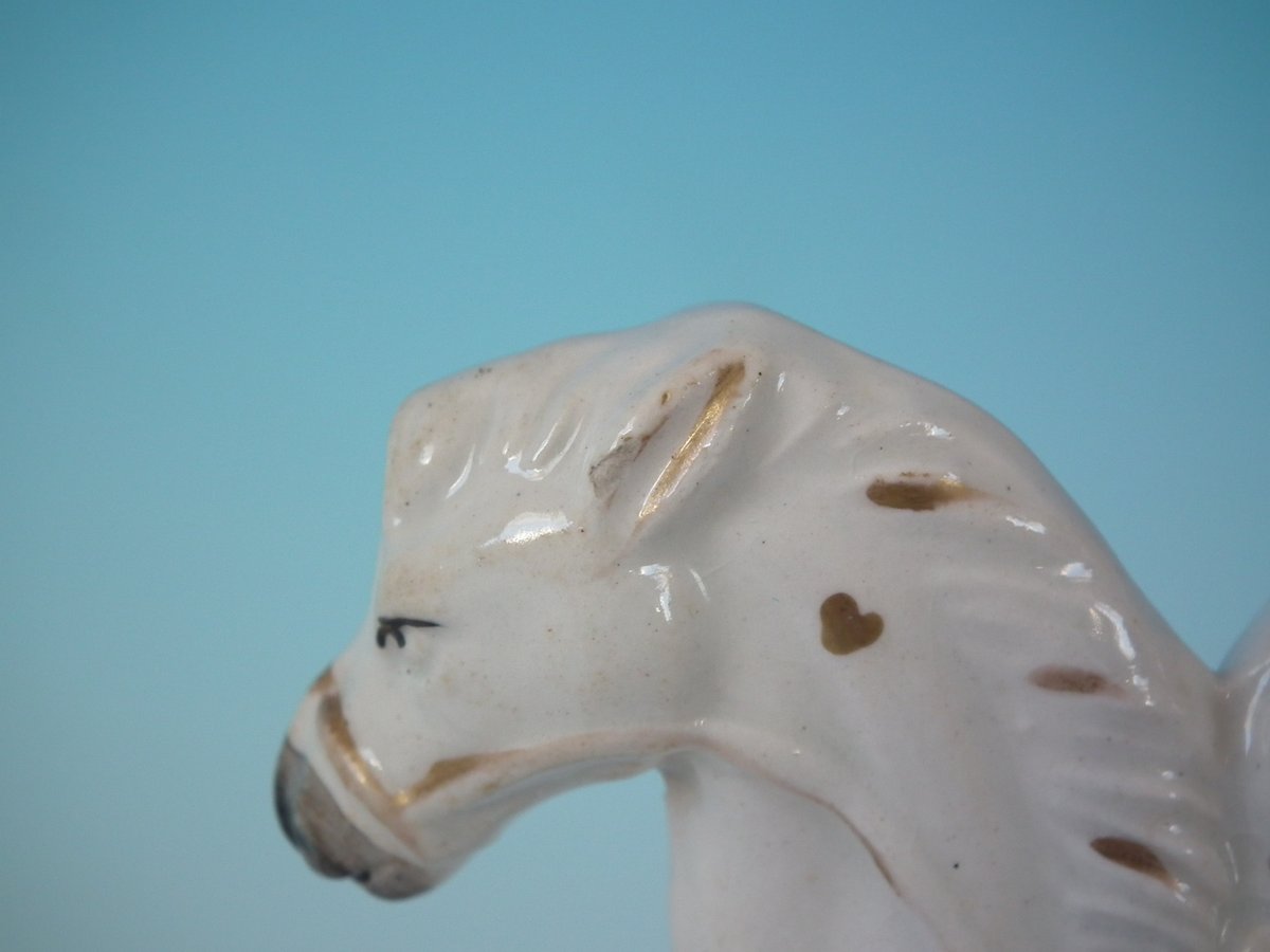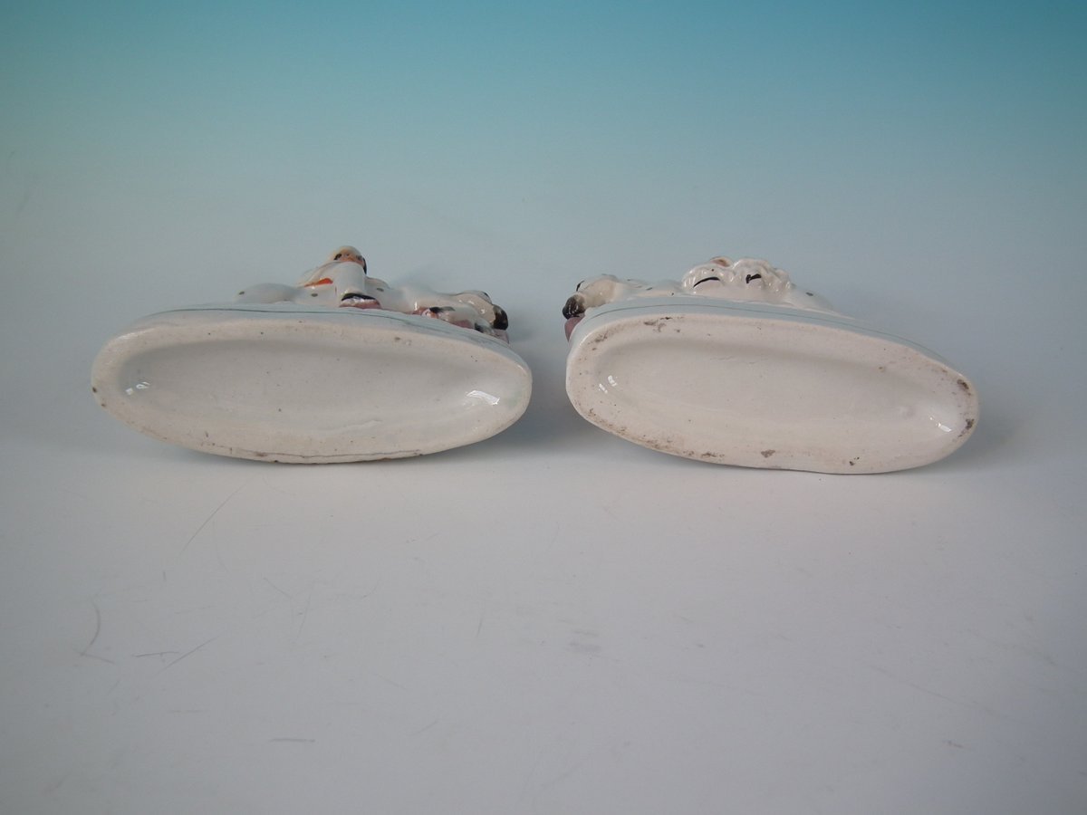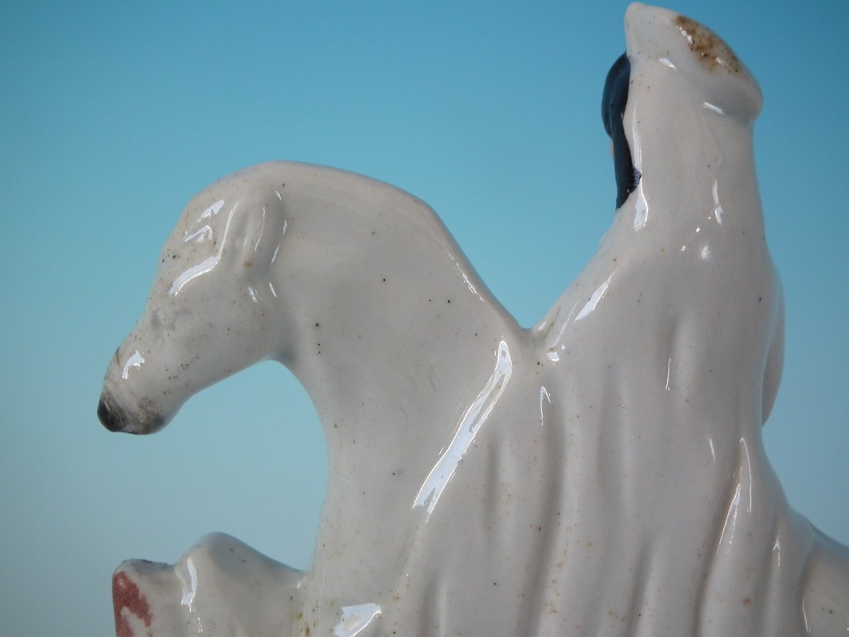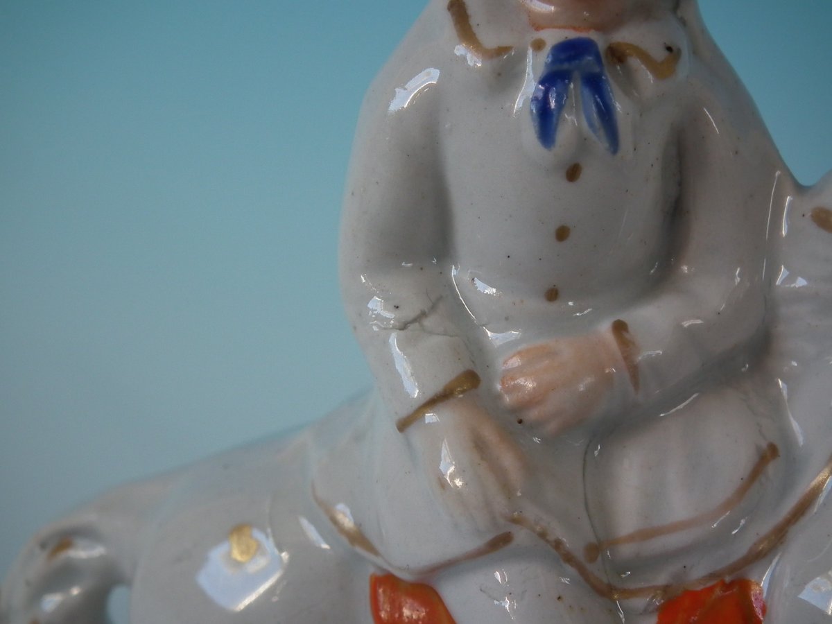 Victorian, circa 1860. Tallest is 6.3ins high, 4.9ins wide, 2ins depth. Pair of Staffordshire Pottery figures which feature a boy and girl both riding a horse, leaping over fence, stood on a shaped base.