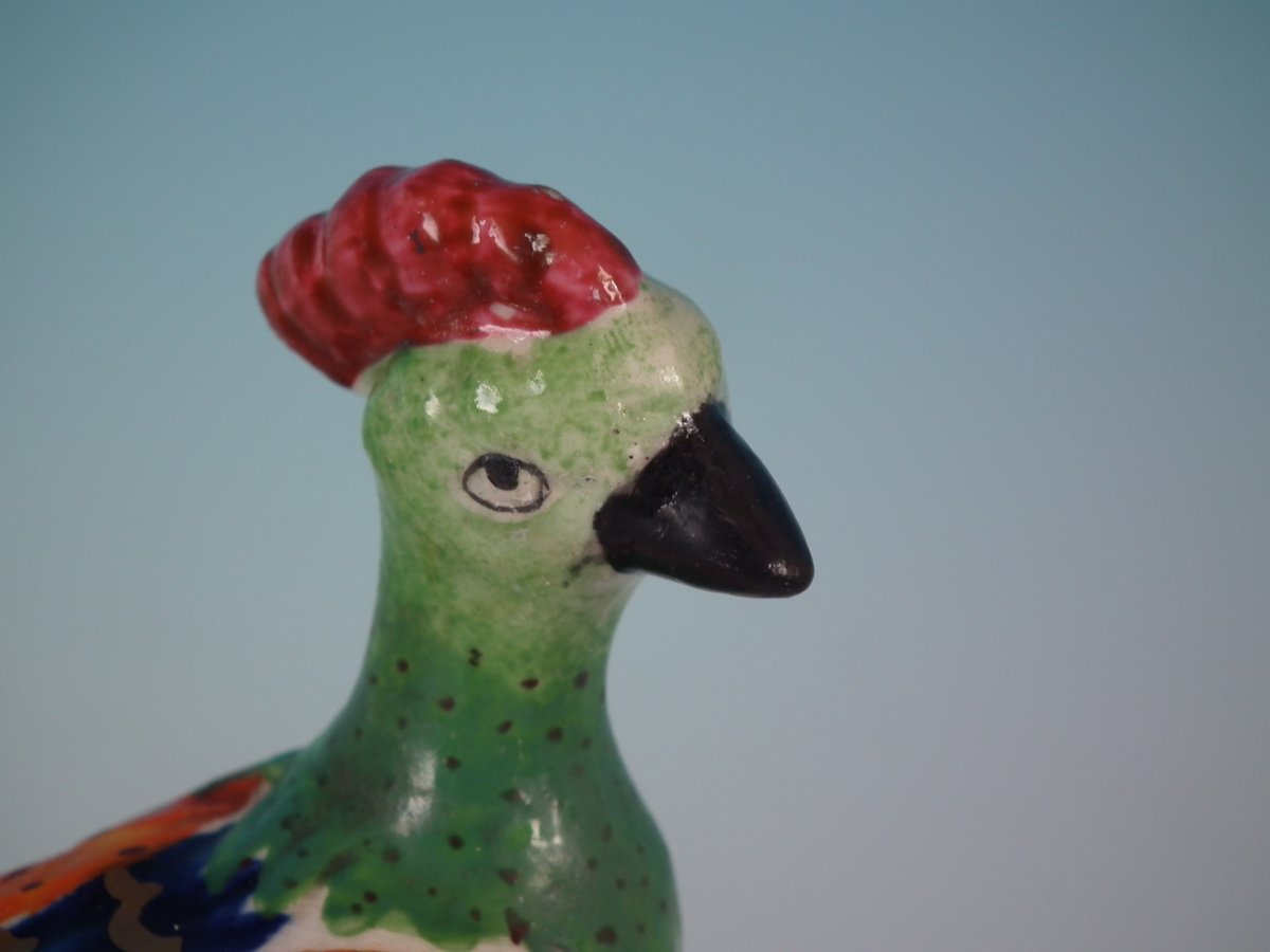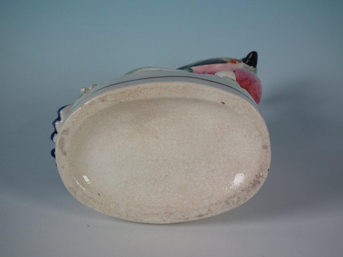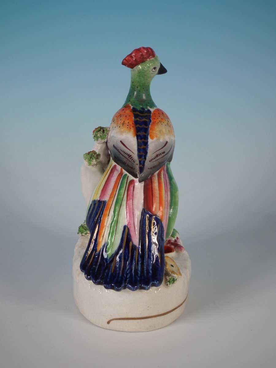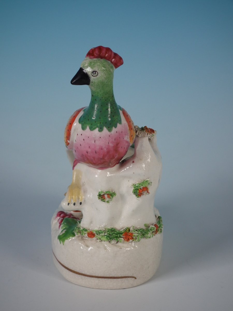 Victorian, circa 1860. 5.8ins high, 4.7ins wide, 2.8ins depth. Staffordshire Pottery quill holder which features a colourful bird, perched on a shaped base.